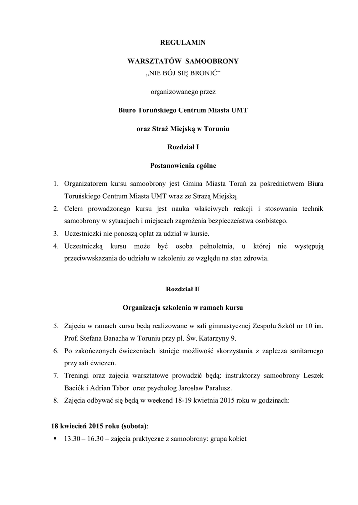 REGULAMIN WARSZTATÓW SAMOOBRONY „NIE BÓJ SIĘ BRONIĆ” organizowanego przez Biuro Toruńskiego Centrum Miasta UMT oraz Straż Miejską w Toruniu Rozdział I Postanowienia ogólne 1. Organizatorem kursu samoobrony jest Gmina Miasta Toruń za pośrednictwem Biura Toruńskiego Centrum Miasta UMT wraz ze Strażą Miejską. 2. Celem prowadzonego kursu jest nauka właściwych reakcji i stosowania technik samoobrony w sytuacjach i miejscach zagrożenia bezpieczeństwa osobistego. 3. Uczestniczki nie ponoszą opłat za udział w kursie. 4. Uczestniczką kursu może być osoba pełnoletnia, u której nie występują przeciwwskazania do udziału w szkoleniu ze względu na stan zdrowia. Rozdział II Organizacja szkolenia w ramach kursu 5. Zajęcia w ramach kursu będą realizowane w sali gimnastycznej Zespołu Szkól nr 10 im. Prof. Stefana Banacha w Toruniu przy pl. Św. Katarzyny 9. 6. Po zakończonych ćwiczeniach istnieje możliwość skorzystania z zaplecza sanitarnego przy sali ćwiczeń. 7. Treningi oraz zajęcia warsztatowe prowadzić będą: instruktorzy samoobrony Leszek Baciók i Adrian Tabor oraz psycholog Jarosław Paralusz. 8. Zajęcia odbywać się będą w weekend 18-19 kwietnia 2015 roku w godzinach: 18 kwiecień 2015 roku (sobota): 13.30 – 16.30 – zajęcia praktyczne z samoobrony: grupa kobiet 19 kwiecień 2015 roku (niedziela) 8.00 – 09.30 – psychologiczne i prewencyjne aspekty samoobrony dla kobiet (warsztat): grupa kobiet 10.00 – 13.00 – zajęcia praktyczne z samoobrony: grupa kobiet 9. W treningu może uczestniczyć grupa nie większa niż 20 osób. 10. Zgłoszenia na kurs przyjmowane są w Biurze Toruńskiego Centrum Miasta (ul. Wały Generała Sikorskiego 8, wejście od ul. Podmurnej) lub pod numerem telefonu 56 611 87 53, do dnia 15.04.2015 r. godz. 1530 - o zakwalifikowaniu się do udziału w warsztatach decyduje kolejność zgłoszeń. 11. Osoby zgłaszające się na kurs samoobrony są zobowiązane do złożenia oświadczenia, stanowiącego załącznik nr 1 do niniejszego Regulaminu. 12. Uczestniczki wykonują ćwiczenia ubrane w strój sportowy (dres lub spodenki i koszulkę oraz obuwie sportowe), na sali z matami ćwiczenia wykonywane są boso lub w skarpetkach. Organizator kursu nie zapewnia stroju sportowego używanego podczas ćwiczeń. 13. W trakcie prowadzonych zajęć uczestniczki kursu mogą wykonywać wyłącznie ćwiczenia wskazane przez instruktora i pod jego bezpośrednim nadzorem. Naruszenie powyższego obowiązku uzasadnia pozbawienie uczestniczki możliwości dalszego udziału w kursie. 14. Przebywając podczas zajęć w obiekcie sportowym i korzystając z jego wyposażenia uczestniczki kursu muszą stosować się do obowiązującego regulaminu obiektu, przepisów bhp, jak również instrukcji i poleceń wydawanych przez prowadzącego zajęcia. 15. W trakcie zajęć zabrania się używania jakichkolwiek przedmiotów niezaakceptowanych do ćwiczeń przez prowadzącego zajęcia, używania wyposażenia hali sportowej niezgodnie z przeznaczeniem, stosowania nadmiernej siły fizycznej i niereagowania na sygnały o zakończeniu ćwiczenia (rezygnacji z dalszego ćwiczenia) dawane przez partnera. 16. W przypadku wystąpienia symptomów kontuzji, stanu zagrożenia zdrowia czy innego rodzaju problemów obowiązkiem ćwiczących jest natychmiastowe powiadomienie instruktora.