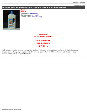 Informacje o produkcie Utworzono 04-03-2017 NIEMIECKI PŁYN UNIWERSALNY MR PROPRE 1,3 litra MARSEILLE Cena : 9,99 zł Dostępność : Dostępny Stan magazynowy : niski Średnia ocena : brak recenzji NIEMIECKI PŁYN UNIWERSALNY MR PROPRE MARSEILLE 1,3 litra Mr Propre-uniwersalny płyn do mycia płytek podłogowych,ściennych,mebli,pow. kuchennych i łazienkowych o długotrwałym intensywnym zapachu z dodatkiem białego mydła marsylskiego.Usuwa brud, tłuszcz i osady. Produkt przeznaczony na rynek francuski. Wygenerowano w programie www.oscGold.com
