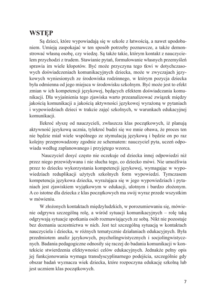 WSTĘP Są dzieci, które wypowiadają się w szkole z łatwością, a nawet upodobaniem. Umieją zaspokajać w ten sposób potrzeby poznawcze, a także demonstrować własną osobę, czy wiedzę. Są także takie, którym kontakt z nauczycielem przychodzi z trudem. Stawianie pytań, formułowanie własnych przemyśleń sprawia im wiele kłopotów. Być może przyczyna tego tkwi w dotychczasowych doświadczeniach komunikacyjnych dziecka, może w zwyczajach językowych wyniesionych ze środowiska rodzinnego, w którym pozycja dziecka była odmienna od jego miejsca w środowisku szkolnym. Być może jest to efekt zmian w ich kompetencji językowej, będących efektem doświadczania komunikacji. Dla wyjaśnienia tego zjawiska warto przeanalizować związek między jakością komunikacji a jakością aktywności językowej wyrażoną w pytaniach i wypowiedziach dzieci w trakcie zajęć szkolnych, w warunkach edukacyjnej komunikacji. Ilekroć słyszę od nauczycieli, zwłaszcza klas początkowych, iż planują aktywność językową ucznia, tylekroć budzi się we mnie obawa, że proces ten nie będzie miał wiele wspólnego ze stymulacją językową i będzie on po raz kolejny przeprowadzony zgodnie ze schematem: nauczyciel pyta, uczeń odpowiada według zaplanowanego i przyjętego wzorca. Nauczyciel dosyć często nie oczekuje od dziecka innej odpowiedzi niż przez niego przewidywana i nie słucha tego, co dziecko mówi. Nie umożliwia przez to dziecku wykorzystania kompetencji językowej, wymagając w wypowiedziach reduplikacji użytych szkolnych form wypowiedzi. Tymczasem kompetencja językowa dziecka, wyrażająca się w jego wypowiedziach i pytaniach jest zjawiskiem wyjątkowym w edukacji, ulotnym i bardzo złożonym. A co istotne dla dziecka z klas początkowych ma swój wyraz przede wszystkim w mówieniu. W złożonych kontaktach międzyludzkich, w porozumiewaniu się, mówienie odgrywa szczególną rolę, a wśród sytuacji komunikacyjnych – rolę taką odgrywają sytuacje spotkania osób rozmawiających ze sobą. Nikt nie pozostaje bez doznania uczestnictwa w nich. Jest też szczególną sytuacją w kontaktach nauczyciela i dziecka, w różnych tematycznie działaniach edukacyjnych. Była przedmiotem analiz językowych, psycholingwistycznych i socjolingwistycznych. Badania pedagogiczne odnosiły się raczej do badania komunikacji w kontekście stwierdzenia efektywności celów edukacyjnych. Jednakże pełny opis jej funkcjonowania wymaga transdyscyplinarnego podejścia, szczególnie gdy obszar badań wyznacza wiek dziecka, które rozpoczyna edukację szkolną lub jest uczniem klas początkowych. 7 Komunikacja codzienna w rodzinie, będąc dla dziecka podstawową formą porozumiewania się z dorosłym, a także komunikacja edukacyjna z nauczycielem charakteryzuje się specyficzną odrębnością, wynikającą z jej cech: bezpośredniości, interakcyjności oraz potencjalności języka jako narzędzia komunikacji. Gromadzą się więc w niej wszystkie elementy procesu komunikacji interpersonalnej, w szczególny sposób usadowione ze względu na cechy podmiotów porozumiewających się i specyfiki kompetencji językowej dziecka w rozwoju. Aby lepiej rozumieć rozwój dziecka i właściwie planować sprzyjającą temu rozwojowi edukację, nie sposób pominąć pytań o zmiany w kompetencji językowej. Jest to pytanie o komunikowanie się dziecka z dorosłymi, z nauczycielem w różnych sytuacjach edukacyjnych. Jest to pytanie o doświadczenia komunikacyjne i o zachowania oraz umiejętności z tych doświadczeń wynikające. To pytanie o aktywność językową wyrażoną w pytaniach i wypowiedziach, w formach językowej sprawności. W specyfikę kontaktu dziecka i nauczyciela wpisana jest zarówno asymetria relacji jej uczestników, jak i asymetria umiejętności, a także nawyków językowych, intencji i odmienności widzenia świata oraz siebie w nim, jak również niepowtarzalności i ulotności zjawiska rozmowy. Pytanie zatem jakiej komunikacji doświadcza dziecko, porozumiewając się z dorosłym – nauczycielem w czasie zajęć szkolnych, to pytanie zarówno o strukturę, przebieg, interakcyjność, relacje, a także o swoiste dla edukacji: wypowiedzi i pytania Książka ta to próba odpowiedzi na postawione pytania. Jej celem jest pobudzenie wrażliwości i świadomości nauczycieli i kandydatów na nauczycieli na rolę wypowiedzi i pytań w komunikacji miedzy nimi i dziećmi. Do nich jest kierowana analiza form wypowiedzi językowych w kontekście komunikacji nauczyciela i dziecka. Do nich również kierowana jest analiza wybranych przykładów i planowanych scenariuszy zajęć szkolnych w klasach 1-3 ze wskazaniem na partycypacje kompetencji językowych w wypowiedziach i pytaniach nauczyciela i uczniów. Odpowiedź na pytanie, czego doświadcza dziecko w komunikacji z nauczycielem ma bowiem podstawowe znaczenie dla właściwej relacji nauczyciela i ucznia w młodszym wieku szkolnym. Wiedza o tym, jakie są doznania dziecka w czasie kontaktu z nauczycielem i jak przebiega porozumiewanie się, jak przejawia sie w nim kompetencja językowa dziecka, stanowić może o jakości edukacji. 8