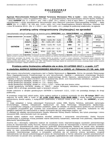 ZSI.WAŁÓ.SGZ.4240.2137.1.2137.2017.TG Łódź, 07.02.2017r. OGŁOSZENIE / o przetargu / Agencja Nieruchomości Rolnych Oddział Terenowy Warszawa Filia w Łodzi – dalej ANR, działając na podstawie ustawy z dnia 19 października 1991 r. „o gospodarowaniu nieruchomościami rolnymi Skarbu Państwa” – dalej UGNRSP (Dz. U. z 2016 r., poz. 1491 z późn. zm.), ustawy z dnia 8 lipca 2005 r. „o realizacji prawa do rekompensaty z tytułu pozostawienia nieruchomości poza obecnymi granicami Rzeczypospolitej Polskiej” – dalej URPR (Dz. U. z 2005 r. Nr 169, poz. 1418 z późn. zm.) oraz Rozporządzenia Ministra Rolnictwa i Rozwoju Wsi z dnia 30 kwietnia 2012r. (Dz. U. z 2012 r. poz. 540 z późn. zm.), podaje do publicznej wiadomości, że ogłasza przetarg ustny nieograniczony (licytacyjny) na sprzedaż nieruchomości rolnych położonych na terenie gminy OPOCZNO, pow. OPOCZYŃSKI, woj. ŁÓDZKIE: OBRĘB GEODEZYJNY Nr działki 111 112/1 114 OSTRÓW 115/1 596/5 Pow. działki /ha/ 0,04 0,24 1/3 z 0,04 1/3 z 0,26 0,30 Użytki /ha/ Cena wywoławcza /zł/ Minimalne Wadium postąpienie /zł/ /zł/ RIVb – 0,03; RV – 0,01 RV – 0,04; ŁIV – 0,20 730 2.950 70 250 10 50 RIVb – 0,03; RV – 0,01 360 30 10 RV – 0,05; ŁIV – 0,21 1.070 100 20 RIVb – 0,07; RV – 0,20; RVI – 0,03 7.950 750 100 Nr Księgi Wieczystej PT1O /00055537/8 PT1O /00055536/1 PT1O /00008255/3 Zgodnie z wykazem z dnia 13.09.2016r. wywieszonym na tablicy ogłoszeń w Urzędzie Miejskiego w Opocznie, właściwych miejscowo sołtysów wsi, w siedzibie ANR Oddział Terenowy w Warszawie Filia w Łodzi, w siedzibie właściwej miejscowo Izby Rolniczej oraz opublikowanym w internecie na stronie www.anr.gov.pl. Przedmiotem sprzedaży dla działek 114, 115/1 w obrębie Ostrów są udziały 1/3 część w prawie własności. Przeniesienie prawa własności w/w udziału nastąpi jeżeli zgodnie z art. 166 Kodeksu Cywilnego współwłaściciele, którzy prowadzą gospodarstwo rolne na gruncie wspólnym, nie wykonają prawa pierwokupu. Jeśli zgodnie z art. 596 - 602 Kodeksu Cywilnego dojdzie do wykonania w/w prawa, przestają wiązać strony wszelkie uzgodnienia wynikające i będące skutkiem tego ogłoszenia. Przetarg ustny licytacyjny odbędzie się w dniu 22 LUTEGO 2017 r. o godz. 1100 w siedzibie AGENCJI NIERUCHOMOŚCI ROLNYCH w ŁODZI, ul. Północna 27/29, pok. 325 Stan prawny nieruchomości uregulowany jest w Sądzie Rejonowym w Opocznie. Gmina nie posiada Miejscowego Planu Zagospodarowania Przestrzennego na w/w nieruchomości. Zgodnie z ustaleniami zmienionego Studium uwarunkowań i kierunków zagospodarowania przestrzennego Gminy Opoczno, zatwierdzonym Uchwałą Rady Miejskiej w Opocznie Nr XIII/114/2015 z dnia 5 października 2015r. w/w nieruchomości określone są jako: - obręb geodezyjny OSTRÓW, działka nr: 111 – tereny łąk; - obręb geodezyjny OSTRÓW, działka nr: 114 – tereny rolne; - obręb geodezyjny OSTRÓW, działki nr: 112/1 i 115/1 – tereny łąk oraz tereny rolne; - obręb geodezyjny OSTRÓW, działka nr: 596/5 – obszar istniejącej zabudowy zagrodowej i mieszkaniowej w pasie 100 m od drogi, pozostała część w terenach rolnych; Działki położone w obrębie geodezyjnym OSTRÓW o numerach 112/1, 115/1 nie posiadają dostępu do drogi publicznej. W przetargu mogą brać udział osoby, które wpłacą wadium w podanej wysokości do dnia 20 lutego 2017 roku włącznie na konto ANR w Łodzi nr 37 1130 1163 0014 7124 8320 0002 i okażą komisji przetargowej potwierdzony dowód wpłaty, z wyłączeniem podmiotów, o których mowa w art. 29 ust. 3bc UGNRSP), to jest, które: 1) maja zaległości z tytułu zobowiązań finansowych wobec ANR, Skarbu Państwa, jednostek samorządu terytorialnego, Zakładu Ubezpieczeń Społecznych lub Kasy Rolniczego Ubezpieczenia Społecznego, a w szczególności zalegają z uiszczeniem podatków, opłat lub składek na ubezpieczenia społeczne lub zdrowotne, z wyjątkiem przypadków gdy uzyskały one przewidziane prawem zwolnienie, odroczenie, rozłożenie na raty zaległych płatności lub wstrzymanie w całości wykonania decyzji właściwego organu, lub 2) władają lub władały nieruchomościami Zasobu Własności Rolnej Skarbu Państwa, bez tytułu prawnego i mimo wezwania ANR, nieruchomości tych nie opuściły. Dowód wpłaty wadium musi dokładnie określać położenie i oznaczenie nieruchomości. Osoby fizyczne uczestniczące w przetargu muszą posiadać ważne dokumenty tożsamości, natomiast inne podmioty, odpowiednie dokumenty identyfikacyjne. Zwalnia się z obowiązku wpłacenia wadium do wysokości kwoty nieprzekraczającej wysokości potwierdzonego prawa do rekompensaty osoby fizyczne, którym przysługuje prawo do rekompensaty w formie zaliczenia wartości nieruchomości pozostawionych poza obecnymi granicami Rzeczypospolitej Polskiej na poczet ceny sprzedaży nieruchomości stanowiących własność Skarbu Państwa, jeżeli w terminie na godzinę przed rozpoczęciem przetargu złożą na ręce przewodniczącego komisji przetargowej: pisemne zobowiązanie do uiszczenia kwoty równej wysokości niewniesionego wadium w przypadku uchylenia się od zawarcia umowy sprzedaży, oryginał zaświadczenia lub decyzji potwierdzających prawo do rekompensaty w formie zaliczenia wartości pozostawionych nieruchomości na poczet ceny sprzedaży, a w przypadku spadkobierców osób wskazanych w zaświadczeniach lub decyzjach – także postanowienie sądu o stwierdzeniu nabycia spadku (albo o dziale spadku) oraz dokumenty potwierdzające spełnienie wymogów określonych w art. 2 lub art. 3 URPR. Osoba uprawiona, zwolniona z obowiązku wniesienia wadium w części, aby zostać dopuszczona do przetargu zobowiązana jest wnieść pozostałą część wadium na ogólnych warunkach, określonych w tym ogłoszeniu. Wadium wpłacone przez oferenta, który przetarg wygrał zostanie zaliczone na poczet ceny nabycia, zaś pozostałym uczestnikom zostanie zwr