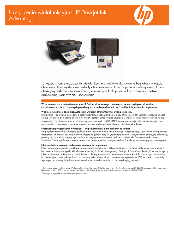 Urządzenie wielofunkcyjne HP Deskjet Ink Advantage To wszechstronne urządzenie wielofunkcyjne umożliwia drukowanie bez obaw o koszty atramentu. Niezwykle tanie wkłady atramentowe o dużej pojemności oferują wyjątkowo atrakcyjny wskaźnik wartość/cena, a intuicyjne funkcje kontrolne zapewniają łatwe drukowanie, skanowanie i kopiowanie. Wszechstronne urządzenie wielofunkcyjne HP Deskjet Ink Advantage zostało opracowane z myślą o użytkownikach indywidualnych i biurach domowych potrzebujących wyjątkowo ekonomicznych możliwości drukowania i kopiowania. Większe oszczędności dzięki niezwykle tanim wkładom atramentowym o dużej pojemności. Drukowanie i kopiowanie bez obaw o koszty atramentu. Niezwykle tanie wkłady atramentowe HP Deskjet o dużej pojemności oferują wyjątkowe połączenie jakości HP i niskich kosztów, umożliwiając uzyskanie 3-krotnie większej liczby wydruków za tę samą cenę1. To wielofunkcyjne urządzenie zgodne z normą ENERGY STAR® zapewnia zmniejszenie kosztów energii i inne oszczędności — opcja oszczędzania papieru pozwala drukować wiele stron po obu stronach arkusza. Niezawodność urządzeń serii HP Deskjet — najpopularniejszej marki drukarek na świecie. Najpopularniejsza od 20 lat marka drukarek na świecie gwarantuje łatwą obsługę i niezawodność. Zastosowanie oryginalnych atramentów HP Deskjet pozwala drukować laserowej jakości ostry i wyraźny tekst czarny — a tym samym atrakcyjne dokumenty, projekty itp. — a także bogate, żywe kolory na przyciągających uwagę grafikach i zdjęciach. Dostosowany do systemu Windows 7; więcej informacji można znaleźć na stronie www.hp.com/go/windows7 (niektóre funkcje mogą być niedostępne). Intuicyjne funkcje instalacji, drukowania, skanowania i kopiowania. Intuicyjne oprogramowanie umożliwia zainstalowanie urządzenia w kilka minut i niezwykle łatwe drukowanie, skanowanie i kopiowanie. Lepszy dostęp do wkładów atramentowych ułatwia ich wymianę. Funkcja HP Smart Web Printing2 zapewnia lepszą jakość materiałów drukowanych z sieci; koniec z obciętymi stronami i zmarnowanymi wydrukami. Poziom zużycia materiałów eksploatacyjnych można kontrolować za pomocą wskaźnika poziomu atramentu na wyświetlaczu LCD — a jeśli atrament się wyczerpie, rezerwowy tryb druku umożliwia dokończenie drukowania za pomocą drugiego wkładu. 1 Porównanie przeprowadzone przez HP dla urządzeń wielofunkcyjnych HP Deskjet przy użyciu wkładów atramentowych HP 300/XL, zakładając 2-letni średni czas eksploatacji drukarki, 75% druku w trybie czarno-białym i 25% druku w kolorze oraz wydajność obliczaną w oparciu o ISO/IEC 24711 2 Wymaga przeglądarki Microsoft Internet Explorer 6.0–8.0 Informacje o zamawianiu Dane techniczne Drukowanie Technologia druku Wyświetlacz Typy atramentów Prędkość druku Jakość druku Druk bez marginesów Języki drukowania Skanowanie Kopiowanie Prędkość kopiowania Normatywny cykl pracy (miesięcznie, format A4) Nośniki Automatyczny czujnik rozpoznający typ papieru Formaty nośników Maksymalny zakres rozmiarów nośnika Obsługa papieru Obsługa nośników/wejście Drukowanie dwustronne Zasilanie Zużycie energii Moc dźwięku Ciśnienie akustyczne Interfejsy Pamięć Dołączone oprogramowanie Wymiary (sz. x gł. x wys.) Waga Kraj pochodzenia Możliwości sieciowe Obsługiwane systemy operacyjne ENERGY STAR Wydajność materiałów eksploatacyjnych Gwarancja Technologia termiczna HP Inkjet 7-segmentowy wyświetlacz LED Barwnikowe; pigmentowe Typ dokumentu Tryb draft Najlepszy Czarny tekst, A4: Do 29 str./min Mieszany tekst i kolorowa grafika, A4: Do 23 str./min 10 x 15 cm fotografia kolorowa (papier W ciągu zaledwie 70 fotograficzny): sekund Zależnie od rodzaju wydruku, trybu drukowania i podobnych wielkości. Prędkość druku zależy od konfiguracji systemu, używanego oprogramowania i stopnia złożoności dokumentów. W czerni: Do 600 dpi, Kolor: Rozdzielczość optymalizowana do 4800x1200 dpi przy druku w kolorze z komputera na wybranych papierach fotograficznych HP, rozdzielczość wejściowa 1200 dpi Tak (aż do panoramy, A4 i wiele więcej) HP PCL 3 GUI Rozdzielczość: Optyczny: Do 1200 dpi; Urządzenie: Do 1200 x 2400 dpi; Optymalizowana: Maks. 19 200 dpi Maksymalny rozmiar dokumentu: 216 x 297 mm Typ: Płaski; Kodowanie koloru: 48-bitowa; Wersja sterownika Twain: Wersja 1.9; Technologia skanowania: Czujnik Contact Image Sensor (CIS); Skala szarości: 256 Typ dokumentu Tryb draft Tryb normal Czarny tekst, A4: Do 29 kopii/min Do 8 kopii/min Mieszany tekst i kolorowa grafika, A4: Do 23 kopii/min Do 6 kopii/min Rozdzielczość: W czerni: Zoptymalizowana rozdzielczość do 600 dpi, rozdzielczość wejściowa 300 dpi; Wiele kopii: Do 9 kopii; Powiększenie/zmniejszenie: 25 do 200% Do 3000 stron Papier (zwykły, do drukarek atramentowych, fotograficzny); koperty; folie; etykiety; karty; nośniki HP Premium; nośniki do nadruków na koszulki; nośniki do wydruków bez marginesów Nie Standardowo: A4 (210x297 mm), A5 (148x210 mm), A6 (105x148 mm), B5 (176x250 mm), DL (110x220 mm), C6 (114x162 mm), 300x100 mm, 130x180 mm, 100x150 mm, nietypowe: Od 77 x 127 do 216 x 356 mm A4: Od 75 do 90 g/m²; legal: Od 75 do 90 g/m²; koperty: Od 75 do 90 g/m²; karty: do 200 g/m²; zdjęcie 10 x 15 cm: do 280 g/m² Standardowo: Podajnik na 80 arkuszy Liczba arkuszy: Do 80 arkuszy, Koperty: Do 10, Karty: Do 40 ark., Folie przezroczyste: Do 30 ark., zdjęcie 10 x 15 cm: Do 30 ark. Ręczny (z obsługą przez sterownik) Wymagania: Napięcie wejściowe: 100 – 240 V (+/-10%), 50/60 Hz (+/-3 Hz), Materiały eksploatacyjne: Zasilacz zewnętrzny Maksymalnie: maks. 22,8 W; Oczekiwanie: 2,3 W 6,9 B(A) (drukowanie z prędkością 15 str./min) 57 dB(A) (drukowanie z prędkością 15 str./min) Hi-Speed USB 2.0 Standardowo: Pamięć SDRAM: 16 MB; Pamięć Flash: 4 MB; Nieulotna pamięć RAM: 4 kB Windows Live Photo Gallery, Smart Web Printing 4.5 