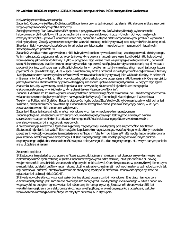 Nr wniosku: 183626, nr raportu: 12331. Kierownik (z rap.): dr hab