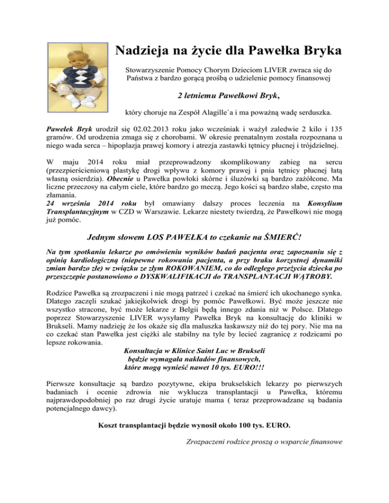 Nadzieja na życie dla Pawełka Bryka Stowarzyszenie Pomocy Chorym Dzieciom LIVER zwraca się do Państwa z bardzo gorącą prośbą o udzielenie pomocy finansowej 2 letniemu Pawełkowi Bryk, który choruje na Zespół Alagille`a i ma poważną wadę serduszka. Pawełek Bryk urodził się 02.02.2013 roku jako wcześniak i ważył zaledwie 2 kilo i 135 gramów. Od urodzenia zmaga się z chorobami. W okresie prenatalnym została rozpoznana u niego wada serca – hipoplazja prawej komory i atrezja zastawki tętnicy płucnej i trójdzielnej. W maju 2014 roku miał przeprowadzony skomplikowany zabieg na sercu (przezpierścieniową plastykę drogi wpływu z komory prawej i pnia tętnicy płucnej łatą własną osierdzia). Obecnie u Pawełka powłoki skórne i śluzówki są bardzo zażółcone. Ma liczne przeczosy na całym ciele, które bardzo go meczą. Jego kości są bardzo słabe, często ma złamania. 24 września 2014 roku był omawiany dalszy proces leczenia na Konsylium Transplantacyjnym w CZD w Warszawie. Lekarze niestety twierdzą, że Pawełkowi nie mogą już pomóc. Jednym słowem LOS PAWEŁKA to czekanie na ŚMIERĆ! Na tym spotkaniu lekarze po omówieniu wyników badań pacjenta oraz zapoznaniu się z opinią kardiologiczną (niepewne rokowania pacjenta, a przy braku korzystnej dynamiki zmian bardzo złe) w związku ze złym ROKOWANIEM, co do odległego przeżycia dziecka po przeszczepie postanowiono o DYSKWALIFIKACJI do TRANSPLANTACJI WĄTROBY. Rodzice Pawełka są zrozpaczeni i nie mogą patrzeć i czekać na śmierć ich ukochanego synka. Dlatego zaczęli szukać jakiejkolwiek drogi by pomóc Pawełkowi. Być może jeszcze nie wszystko stracone, być może lekarze z Belgii będą innego zdania niż w Polsce. Dlatego poprzez Stowarzyszenie LIVER wysyłamy Pawełka Bryk na konsultację do kliniki w Brukseli. Mamy nadzieję że los okaże się dla maluszka łaskawszy niż do tej pory. Nie ma na co czekać stan Pawełka jest ciężki ale stabilny na tyle by lecieć zagranicę z rodzicami po lepsze rokowania. Konsultacja w Klinice Saint Luc w Brukseli będzie wymagała nakładów finansowych, które mogą wynieść nawet 10 tys. EURO!!! Pierwsze konsultacje są bardzo pozytywne, ekipa brukselskich lekarzy po pierwszych badaniach i ocenie zdrowia nie wyklucza transplantacji u Pawełka, któremu najprawdopodobniej po raz drugi życie uratuje mama ( teraz przeprowadzane są badania potencjalnego dawcy). Koszt transplantacji będzie wynosił około 100 tys. EURO. Zrozpaczeni rodzice proszą o wsparcie finansowe Stowarzyszenie udostępnia swoje konto bankowe. Można na nie dokonywać wpłat w złotówkach: Wpłaty są potwierdzane. Darowizna na rzecz PAWEŁKA BRYK RAIFFEISEN BANK nr konta 94 1750 0012 0000 0000 2068 7444 lub PODARUJ 1% podatku dopisując nr KRS: 0000 124 837 Cel szczegółowy: Bryk Pawełek lub POMÓŻ ONLINE ZA DOKONANE WPŁATY DZIĘKUJEMY W IMIENIU PAWEŁKA Z RODZICAMI I NASZYM WŁASNYM Zarząd Stowarzyszenia Pomocy Chorym Dzieciom LIVER http://www.liver.pl/nadzieja-na-zycie-dla-pawelka-bryka/