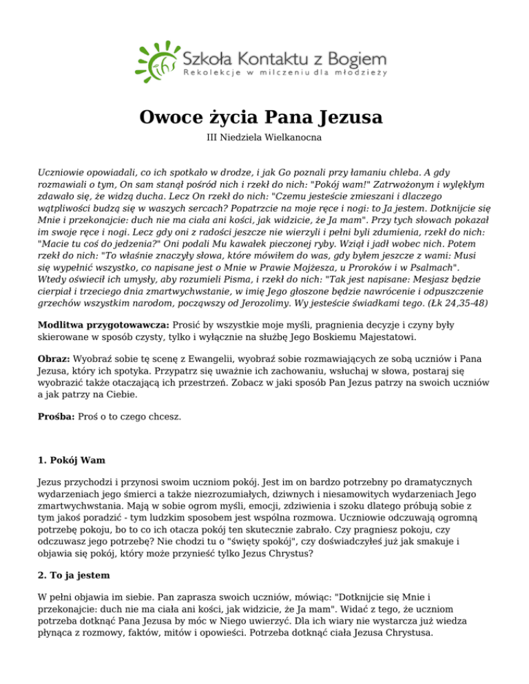 Owoce życia Pana Jezusa III Niedziela Wielkanocna Uczniowie opowiadali, co ich spotkało w drodze, i jak Go poznali przy łamaniu chleba. A gdy rozmawiali o tym, On sam stanął pośród nich i rzekł do nich: "Pokój wam!" Zatrwożonym i wylękłym zdawało się, że widzą ducha. Lecz On rzekł do nich: "Czemu jesteście zmieszani i dlaczego wątpliwości budzą się w waszych sercach? Popatrzcie na moje ręce i nogi: to Ja jestem. Dotknijcie się Mnie i przekonajcie: duch nie ma ciała ani kości, jak widzicie, że Ja mam". Przy tych słowach pokazał im swoje ręce i nogi. Lecz gdy oni z radości jeszcze nie wierzyli i pełni byli zdumienia, rzekł do nich: "Macie tu coś do jedzenia?" Oni podali Mu kawałek pieczonej ryby. Wziął i jadł wobec nich. Potem rzekł do nich: "To właśnie znaczyły słowa, które mówiłem do was, gdy byłem jeszcze z wami: Musi się wypełnić wszystko, co napisane jest o Mnie w Prawie Mojżesza, u Proroków i w Psalmach". Wtedy oświecił ich umysły, aby rozumieli Pisma, i rzekł do nich: "Tak jest napisane: Mesjasz będzie cierpiał i trzeciego dnia zmartwychwstanie, w imię Jego głoszone będzie nawrócenie i odpuszczenie grzechów wszystkim narodom, począwszy od Jerozolimy. Wy jesteście świadkami tego. (Łk 24,35-48) Modlitwa przygotowawcza: Prosić by wszystkie moje myśli, pragnienia decyzje i czyny były skierowane w sposób czysty, tylko i wyłącznie na służbę Jego Boskiemu Majestatowi. Obraz: Wyobraź sobie tę scenę z Ewangelii, wyobraź sobie rozmawiających ze sobą uczniów i Pana Jezusa, który ich spotyka. Przypatrz się uważnie ich zachowaniu, wsłuchaj w słowa, postaraj się wyobrazić także otaczającą ich przestrzeń. Zobacz w jaki sposób Pan Jezus patrzy na swoich uczniów a jak patrzy na Ciebie. Prośba: Proś o to czego chcesz. 1. Pokój Wam Jezus przychodzi i przynosi swoim uczniom pokój. Jest im on bardzo potrzebny po dramatycznych wydarzeniach jego śmierci a także niezrozumiałych, dziwnych i niesamowitych wydarzeniach Jego zmartwychwstania. Mają w sobie ogrom myśli, emocji, zdziwienia i szoku dlatego próbują sobie z tym jakoś poradzić - tym ludzkim sposobem jest wspólna rozmowa. Uczniowie odczuwają ogromną potrzebę pokoju, bo to co ich otacza pokój ten skutecznie zabrało. Czy pragniesz pokoju, czy odczuwasz jego potrzebę? Nie chodzi tu o "święty spokój", czy doświadczyłeś już jak smakuje i objawia się pokój, który może przynieść tylko Jezus Chrystus? 2. To ja jestem W pełni objawia im siebie. Pan zaprasza swoich uczniów, mówiąc: "Dotknijcie się Mnie i przekonajcie: duch nie ma ciała ani kości, jak widzicie, że Ja mam". Widać z tego, że uczniom potrzeba dotknąć Pana Jezusa by móc w Niego uwierzyć. Dla ich wiary nie wystarcza już wiedza płynąca z rozmowy, faktów, mitów i opowieści. Potrzeba dotknąć ciała Jezusa Chrystusa. Czym dla Ciebie jest dotknięcie Pana? Czy doświadczyłeś tej budującej wiarę łaski? Przypomnij sobie w jaki sposób do tej pory Pan Jezus pozwolił Ci dotknąć samego siebie. A może dzisiaj zaprasza Cię do tego? W jaki sposób mogło by to nastąpić? 3. Wypełnienie misji "Mesjasz będzie cierpiał i trzeciego dnia zmartwychwstanie, w imię Jego głoszone będzie nawrócenie i odpuszczenie grzechów wszystkim narodom, począwszy od Jerozolimy". Tak miało się stać. Była to w końcu wola Boga Ojca zaplanowana i objawiona od wieków. Dzięki temu my dzisiaj, tu i teraz uzyskujemy zbawienie, odpuszczenie grzechów, dzięki temu otrzymujemy moc nawrócenia. Jeżeli jesteś świadkiem tego (tak jak uczniowie, którzy dotykali Pana) to do jakiego świadectwa On wzywa Cię dzisiaj? Rozmowa końcowa: Porozmawiaj z Jezusem - jak przyjaciel z przyjacielem, opowiedz Mu wszystko co "wyszło" na tej medytacji. Na zakończenie odmów: Ojcze Nasz