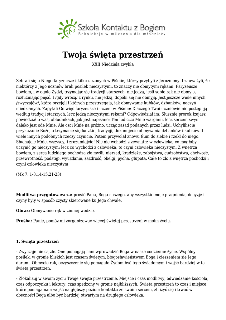 Twoja święta przestrzeń XXII Niedziela zwykła Zebrali się u Niego faryzeusze i kilku uczonych w Piśmie, którzy przybyli z Jerozolimy. I zauważyli, że niektórzy z Jego uczniów brali posiłek nieczystymi, to znaczy nie obmytymi rękami. Faryzeusze bowiem, i w ogóle Żydzi, trzymając się tradycji starszych, nie jedzą, jeśli sobie rąk nie obmyją, rozluźniając pięść. I /gdy wrócą/ z rynku, nie jedzą, dopóki się nie obmyją. Jest jeszcze wiele innych /zwyczajów/, które przejęli i których przestrzegają, jak obmywanie kubków, dzbanków, naczyń miedzianych. Zapytali Go więc faryzeusze i uczeni w Piśmie: Dlaczego Twoi uczniowie nie postępują według tradycji starszych, lecz jedzą nieczystymi rękami? Odpowiedział im: Słusznie prorok Izajasz powiedział o was, obłudnikach, jak jest napisane: Ten lud czci Mnie wargami, lecz sercem swym daleko jest ode Mnie. Ale czci Mnie na próżno, ucząc zasad podanych przez ludzi. Uchyliliście przykazanie Boże, a trzymacie się ludzkiej tradycji, dokonujecie obmywania dzbanków i kubków. I wiele innych podobnych rzeczy czynicie. Potem przywołał znowu tłum do siebie i rzekł do niego: Słuchajcie Mnie, wszyscy, i zrozumiejcie! Nic nie wchodzi z zewnątrz w człowieka, co mogłoby uczynić go nieczystym; lecz co wychodzi z człowieka, to czyni człowieka nieczystym. Z wnętrza bowiem, z serca ludzkiego pochodzą złe myśli, nierząd, kradzieże, zabójstwa, cudzołóstwa, chciwość, przewrotność, podstęp, wyuzdanie, zazdrość, obelgi, pycha, głupota. Całe to zło z wnętrza pochodzi i czyni człowieka nieczystym (Mk 7, 1-8.14-15.21-23) Modlitwa przygotowawcza: prosić Pana, Boga naszego, aby wszystkie moje pragnienia, decyzje i czyny były w sposób czysty skierowane ku Jego chwale. Obraz: Obmywanie rąk w zimnej wodzie. Prośba: Panie, pomóż mi zorganizować więcej świętej przestrzeni w moim życiu. 1. Święta przestrzeń - Zwyczaje nie są złe. One pomagają nam wprowadzić Boga w nasze codzienne życie. Wspólny posiłek, w gronie bliskich jest czasem świętym, błogosławieństwem Boga i cieszeniem się Jego darami. Obmycie rąk, oczyszczenie się pomagało Żydom być tego świadomym i wejść bardziej w tą świętą przestrzeń. - Zlokalizuj w swoim życiu Twoje święte przestrzenie. Miejsce i czas modlitwy, odwiedzanie kościoła, czas odpoczynku i lektury, czas spędzony w gronie najbliższych. Święta przestrzeń to czas i miejsce, które pomaga nam wejść na głębszy poziom kontaktu ze swoim sercem, zbliżyć się i trwać w obecności Boga albo być bardziej otwartym na drugiego człowieka. - Spójrz na Twoją historię. Czy kiedyś było więcej takich świętych przestrzeni czy mniej? Moża warto któreś z nich przywrócić do swojej codzienności? Może warto stworzyć jakieś nowe? 2. Zwyczaje pomagają - Rytualne obmycie rąk pomaga Żydowi wejść świadomie w obecność Boga, kontakt z sobą i z drugim człowiekiem. To też takie stanięcie w prawdzie przed sobą. To coś takiego jak nasze stawanie w obecności Boga na początku medytacji lub czynienie znaku Krzyża. Przypomnij sobie jak takie drobne gesty nastrajały Cię na wejście w świętą przestrzeń. - Przejrzyj swoje życie i zobacz jakie zwyczaje pomagają Ci wejść w Twoje święte przestrzenie: w spotkaniu z Bogiem (znak krzyża, klęknięcie przed Tabernakulum, itp.), z sobą (zamknięcie oczu i spokojne oddychanie), z drugim człowiekiem (przywitanie się serdeczne, łamanie opłatkiem, wspólna modlitwa, itd). - Zobacz, które z tych zwyczajów przestały już spełniać swoją rolę i zamiast pomagać, przeszkadzają Ci w spotkaniu. Które z nich warto odświeżyć? Może warto stworzyć jakieś od zera? Bądź twórczy i zastanów się, w jaki sposób możesz pomóc sobie wejść w swoją świętą przestrzeń. 3. Zwyczaje przeszkadzają - Jezus pokazuje faryzeuszom, że ich zwyczaje nie wprowadzają ich w świętą przestrzeń, tylko działają wręcz przeciwnie. Zamiast prowadzić do miłości i spotkania z drugim człowiekiem prowadzą do oskarżania, porównywania się, osądzania i odrzucenia drugiego. Święta przestrzeń zmieniła się w piekło, czyli miejsce podziałów i osądzania. - Zobacz całą masę Twoich drobnych zwyczajów, które transformują Twoją świętą przestrzeń w piekło. Zamieniają odpoczynek w nerwowy i niespokojny czas. Zamieniają spokojne trwanie z Bogiem w trzymanie się jakichś schematów, regułek, starych metod. Zmieniają spotkanie z drugim człowiekiem w pustkę i izolację. To są drobne zwyczaje, tj. sprawdzanie poczty, wysyłanie smsa, bezrefleksyjne powtarzanie tego, co wszyscy powtarzają. Rozmowa końcowa: Poświęć więcej czasu na rozmowę i razem z Jezusem zrób sobie plan Twoic hświętych przestrzeni. Zaplanuj czas na bycie w spokoju i szczerości z samym sobą, z Bogiem, z drugim człowiekiem. Przyjrzyjcie się Twoim zwyczajom i przeorganizujcie co nieco. Poproś Jezusa o uwolnieni od złych zwyczajów, odświeżenie tych ważnych. Na zakończenie odmów: Ojcze nasz.