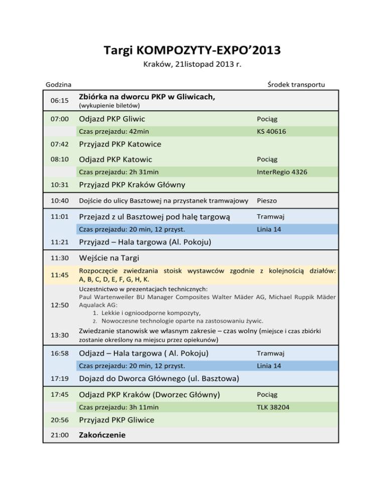 Targi KOMPOZYTY-EXPO’2013 Kraków, 21listopad 2013 r. Godzina Środek transportu 06:15 Zbiórka na dworcu PKP w Gliwicach, 07:00 Odjazd PKP Gliwic Pociąg Czas przejazdu: 42min KS 40616 (wykupienie biletów) 07:42 Przyjazd PKP Katowice 08:10 Odjazd PKP Katowic Pociąg Czas przejazdu: 2h 31min InterRegio 4326 10:31 Przyjazd PKP Kraków Główny 10:40 Dojście do ulicy Basztowej na przystanek tramwajowy Pieszo 11:01 Przejazd z ul Basztowej pod halę targową Tramwaj Czas przejazdu: 20 min, 12 przyst. Linia 14 11:21 Przyjazd – Hala targowa (Al. Pokoju) 11:30 Wejście na Targi 11:45 Rozpoczęcie zwiedzania stoisk wystawców zgodnie z kolejnością działów: A, B, C, D, E, F, G, H, K. 12:50 Uczestnictwo w prezentacjach technicznych: Paul Wartenweiler BU Manager Composites Walter Mäder AG, Michael Ruppik Mäder Aqualack AG: 1. Lekkie i ognioodporne kompozyty, 2. Nowoczesne technologie oparte na zastosowaniu żywic. 13:30 Zwiedzanie stanowisk we własnym zakresie – czas wolny (miejsce i czas zbiórki zostanie określony na miejscu przez opiekunów) 16:58 Odjazd – Hala targowa ( Al. Pokoju) Tramwaj Czas przejazdu: 20 min, 12 przyst. Linia 14 17:19 Dojazd do Dworca Głównego (ul. Basztowa) 17:45 Odjazd PKP Kraków (Dworzec Główny) Pociąg Czas przejazdu: 3h 11min TLK 38204 20:56 Przyjazd PKP Gliwice 21:00 Zakończenie