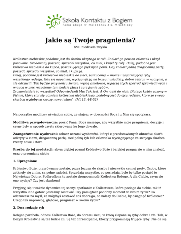 Jakie są Twoje pragnienia? XVII niedziela zwykła Królestwo niebieskie podobne jest do skarbu ukrytego w roli. Znalazł go pewien człowiek i ukrył ponownie. Uradowany poszedł, sprzedał wszystko, co miał, i kupił tę rolę. Dalej, podobne jest królestwo niebieskie do kupca, poszukującego pięknych pereł. Gdy znalazł jedną drogocenną perłę, poszedł, sprzedał wszystko, co miał, i kupił ją. Dalej, podobne jest królestwo niebieskie do sieci, zarzuconej w morze i zagarniającej ryby wszelkiego rodzaju. Gdy się napełniła, wyciągnęli ją na brzeg i usiadłszy, dobre zebrali w naczynia, a złe odrzucili. Tak będzie przy końcu świata: wyjdą aniołowie, wyłączą złych spośród sprawiedliwych i wrzucą w piec rozpalony; tam będzie płacz i zgrzytanie zębów. Zrozumieliście to wszystko? Odpowiedzieli Mu: Tak jest. A On rzekł do nich: Dlatego każdy uczony w Piśmie, który stał się uczniem królestwa niebieskiego, podobny jest do ojca rodziny, który ze swego skarbca wydobywa rzeczy nowe i stare". (Mt 13, 44-52) Na początku modlitwy uświadom sobie, że stajesz w obecności Boga i z Nim się spotykasz. Modlitwa przygotowawcza: prosić Pana, Boga naszego, aby wszystkie moje pragnienia, decyzje i czyny były w sposób czysty skierowane ku Jego chwale. Zaangażowanie wyobraźni: zobacz oczami wyobraźni, któryś z przedstawionych obrazów: skarb odkryty w ziemi, drogocenną perłę, sieć pełną ryb lub człowieka wyciągającego ze swojego skarbca rzeczy nowe i stare. Prośba do tej medytacji: abym głębiej poznał Królestwo Boże i bardziej pragną się w nim znaleźć, oraz o przemianę siebie 1. Upragnione Królestwo Boże, przyrównane zostaje, przez Jezusa do skarbu i niezwykle cennej perły. Osoby, które zetknęły się z nim, są pełne radości. Sprzedają wszystko, co posiadają, byle by tylko posiąść to Największe Dobro. Podkreślona tu zostaje drogocenność Królestwa Bożego. A dla Ciebie, czym się ono wydaję? Czy jest skarbem? Przyjrzyj się uważnie dynamice tej sceny: spotkanie z Królestwem, które pociąga do siebie, tak iż wszystko inne gotowi jesteśmy zostawić. Czy pamiętasz podobny moment w swoim życiu? Co odczuwasz na myśl, że mógłbyś zostawić coś dobrego, co należy do Ciebie, by osiągnąć Królestwo? Czego tak naprawdę, głęboko, pragniesz w swoim życiu? 2. Dwa rodzaje ryb Kolejna parabola, odnosi Królestwo Boże, do obrazu sieci, w którą złapane są ryby dobre i złe. Tak, w Bożym Królestwie są też ludzie źli. Są też chrześcijanie, którzy przypominają trujące ryby. Nie da się z nimi przebywać. Rozmowa z nimi kwasi nam humor. Ich serca są gorzkie. Są też ludzie dobrzy, z którymi relacje budują nas, karmią i wzmacniają. Do której, grupy zaliczyłbyś siebie? Jak reagują ludzie, którzy na co dzień Cię „zjadają”? 3. Wzór mądrości Jezus, na koniec tej części nauczania, pyta słuchaczy, czy zrozumieli co do nich powiedział. Gdy okazuje się, że są dobrymi słuchaczami, stawia im przed oczami pewien wzór. Jest to uczony w Piśmie, członek elity religijnej, znawca Starego Testamentu, który staje się uczniem Jezusa. Przykładem może być Nikodem, który rozmawiał nocą z Mistrzem i przyszedł po Jego śmierci pod krzyż. Taka osoba „ ze swego skarbca wyjmuje to co nowe i stare”. To dopiero bogactwo! Często, mamy skłonność, by albo zapominać o tym, co już się nauczyliśmy, albo też zamykać się przed jakąkolwiek nową lekcją. Połączenie tego, co było i co jest nie jest możliwe, bez modlitwy i relacji z Jezusem. Jego łaska przemienia naszą przeszłość, oczyszcza ją, podnosi oraz przemienia, a jednocześnie otwiera nasze serca na zupełną nowość. Proś Go w tej modlitwie, aby Cię integrował. Byś był mądry, tym co było i tym co teraz. Rozmowa końcowa: Porozmawiaj z Jezusem o tym, co poruszyło Cię podczas tej modlitwy. Może chcesz Go o coś zapytać? Może za coś podziękować lub przeprosić? Zrób to. Na zakończenie odmów: Ojcze nasz.