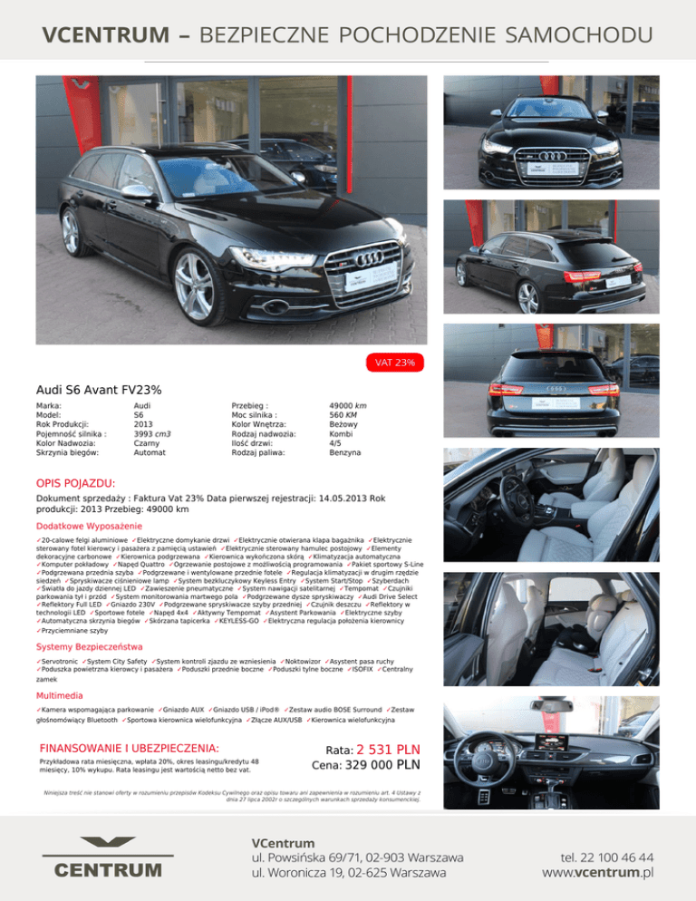 Audi S6 Avant FV23% Marka: Model: Rok Produkcji: Pojemność silnika : Kolor Nadwozia: Skrzynia biegów: Audi S6 2013 3993 cm3 Czarny Automat Przebieg : Moc silnika : Kolor Wnętrza: Rodzaj nadwozia: Ilość drzwi: Rodzaj paliwa: 49000 km 560 KM Beżowy Kombi 4/5 Benzyna OPIS POJAZDU: Dokument sprzedaży : Faktura Vat 23% Data pierwszej rejestracji: 14.05.2013 Rok produkcji: 2013 Przebieg: 49000 km Dodatkowe Wyposażenie ✓20-calowe felgi aluminiowe ✓Elektryczne domykanie drzwi ✓Elektrycznie otwierana klapa bagażnika ✓Elektrycznie sterowany fotel kierowcy i pasażera z pamięcią ustawień ✓Elektrycznie sterowany hamulec postojowy ✓Elementy dekoracyjne carbonowe ✓Kierownica podgrzewana ✓Kierownica wykończona skórą ✓Klimatyzacja automatyczna ✓Komputer pokładowy ✓Napęd Quattro ✓Ogrzewanie postojowe z możliwością programowania ✓Pakiet sportowy S-Line ✓Podgrzewana przednia szyba ✓Podgrzewane i wentylowane przednie fotele ✓Regulacja klimatyzacji w drugim rzędzie siedzeń ✓Spryskiwacze ciśnieniowe lamp ✓System bezkluczykowy Keyless Entry ✓System Start/Stop ✓Szyberdach ✓Światła do jazdy dziennej LED ✓Zawieszenie pneumatyczne ✓System nawigacji satelitarnej ✓Tempomat ✓Czujniki parkowania tył i przód ✓System monitorowania martwego pola ✓Podgrzewane dysze spryskiwaczy ✓Audi Drive Select ✓Reflektory Full LED ✓Gniazdo 230V ✓Podgrzewane spryskiwacze szyby przedniej ✓Czujnik deszczu ✓Reflektory w technologii LED ✓Sportowe fotele ✓Napęd 4x4 ✓Aktywny Tempomat ✓Asystent Parkowania ✓Elektryczne szyby ✓Automatyczna skrzynia biegów ✓Skórzana tapicerka ✓KEYLESS-GO ✓Elektryczna regulacja położenia kierownicy ✓Przyciemniane szyby Systemy Bezpieczeństwa ✓Servotronic ✓System City Safety ✓System kontroli zjazdu ze wzniesienia ✓Noktowizor ✓Asystent pasa ruchy ✓Poduszka powietrzna kierowcy i pasażera ✓Poduszki przednie boczne ✓Poduszki tylne boczne ✓ISOFIX ✓Centralny zamek Multimedia ✓Kamera wspomagająca parkowanie ✓Gniazdo AUX ✓Gniazdo USB / iPod® ✓Zestaw audio BOSE Surround ✓Zestaw głośnomówiący Bluetooth ✓Sportowa kierownica wielofunkcyjna ✓Złącze AUX/USB ✓Kierownica wielofunkcyjna FINANSOWANIE I UBEZPIECZENIA: Przykładowa rata miesięczna, wpłata 20%, okres leasingu/kredytu 48 miesięcy, 10% wykupu. Rata leasingu jest wartością netto bez vat. Rata: 2 531 Cena: 329 000 PLN PLN Niniejsza treść nie stanowi oferty w rozumieniu przepisów Kodeksu Cywilnego oraz opisu towaru ani zapewnienia w rozumieniu art. 4 Ustawy z dnia 27 lipca 2002r o szczególnych warunkach sprzedaży konsumenckiej. Powered by TCPDF (www.tcpdf.org)