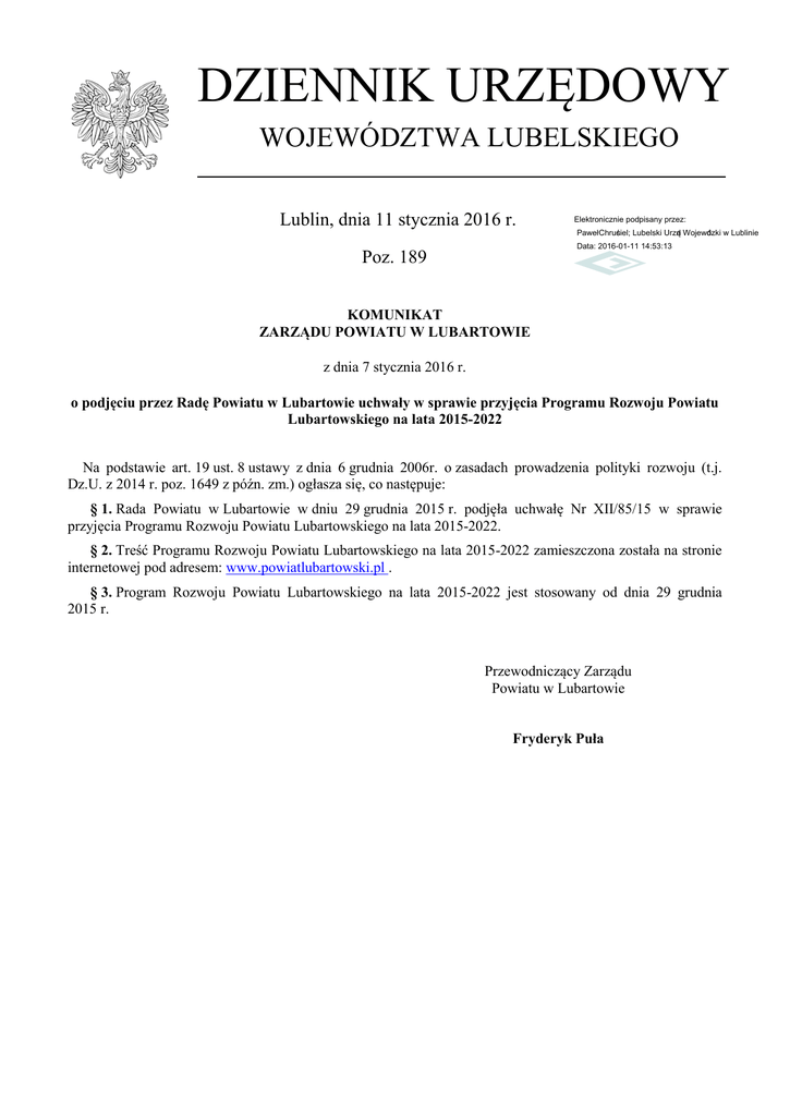 DZIENNIK URZĘDOWY WOJEWÓDZTWA LUBELSKIEGO Lublin, dnia 11 stycznia 2016 r. Elektronicznie podpisany przez: Paweł Chruściel; Lubelski Urząd Wojewódzki w Lublinie Data: 2016-01-11 14:53:13 Poz. 189 KOMUNIKAT ZARZĄDU POWIATU W LUBARTOWIE z dnia 7 stycznia 2016 r. o podjęciu przez Radę Powiatu w Lubartowie uchwały w sprawie przyjęcia Programu Rozwoju Powiatu Lubartowskiego na lata 2015-2022 Na podstawie art. 19 ust. 8 ustawy z dnia 6 grudnia 2006r. o zasadach prowadzenia polityki rozwoju (t.j. Dz.U. z 2014 r. poz. 1649 z późn. zm.) ogłasza się, co następuje: § 1. Rada Powiatu w Lubartowie w dniu 29 grudnia 2015 r. podjęła uchwałę Nr XII/85/15 w sprawie przyjęcia Programu Rozwoju Powiatu Lubartowskiego na lata 2015-2022. § 2. Treść Programu Rozwoju Powiatu Lubartowskiego na lata 2015-2022 zamieszczona została na stronie internetowej pod adresem: www.powiatlubartowski.pl . § 3. Program Rozwoju Powiatu Lubartowskiego na lata 2015-2022 jest stosowany od dnia 29 grudnia 2015 r. Przewodniczący Zarządu Powiatu w Lubartowie Fryderyk Puła