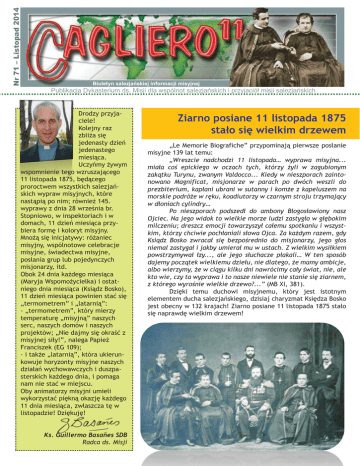 Nr 71 – Listopad 2014 Nome società Titolo n otiziario Biuletyn salezjańskiej informacji misyjnej Publikacja Dykasterium ds. Misji dla wspólnot salezjańskich i przyjaciół misji salezjańskich Drodzy przyjaciele! Kolejny raz zbliża się jedenasty dzień jedenastego miesiąca. Uczyńmy żywym wspomnienie tego wzruszającego 11 listopada 1875, będącego proroctwem wszystkich salezjańskich wypraw misyjnych, które nastąpią po nim; również 145. wyprawy z dnia 28 września br. Stopniowo, w inspektoriach i w domach, 11 dzień miesiąca przybiera formę i koloryt misyjny. Mnożą się inicjatywy: różaniec misyjny, wspólnotowe celebracje misyjne, świadectwa misyjne, posłania grup lub pojedynczych misjonarzy, itd. Obok 24 dnia każdego miesiąca (Maryja Wspomożycielka) i ostatniego dnia miesiąca (Ksiądz Bosko), 11 dzień miesiąca powinien stać się „termometrem” i „latarnią”: - „termometrem”, który mierzy temperaturę „misyjną” naszych serc, naszych domów i naszych projektów; „Nie dajmy się okraść z misyjnej siły!”, nalega Papież Franciszek (EG 109); - i także „latarnią”, która ukierunkowuje horyzonty misyjne naszych działań wychowawczych i duszpasterskich każdego dnia, i pomaga nam nie stać w miejscu. Oby animatorzy misyjni umieli wykorzystać piękną okazję każdego 11 dnia miesiąca, zwłaszcza tę w listopadzie! Dziękuję! Ks. Guillermo Basañes SDB Radca ds. Misji Ziarno posiane 11 listopada 1875 stało się wielkim drzewem „Le Memorie Biografiche” przypominają pierwsze posłanie misyjne 139 lat temu: „Wreszcie nadchodzi 11 listopada… wyprawa misyjna... miała coś epickiego w oczach tych, którzy żyli w zagubionym zakątku Turynu, zwanym Valdocco... Kiedy w nieszporach zaintonowano Magnificat, misjonarze w parach po dwóch weszli do prezbiterium, kapłani ubrani w sutanny i komże z kapeluszem na morskie podróże w ręku, koadiutorzy w czarnym stroju trzymający w dłoniach cylindry… Po nieszporach podszedł do ambony Błogosławiony nasz Ojciec. Na jego widok to wielkie morze ludzi zastygło w głębokim milczeniu; dreszcz emocji towarzyszył całemu spotkaniu i wszystkim, którzy chciwie pochłaniali słowa Ojca. Za każdym razem, gdy Ksiądz Bosko zwracał się bezpośrednio do misjonarzy, jego głos niemal zastygał i jakby umierał mu w ustach. Z wielkim wysiłkiem powstrzymywał łzy..., ale jego słuchacze płakali… W ten sposób dajemy początek wielkiemu dziełu, nie dlatego, że mamy ambicje, albo wierzymy, że w ciągu kilku dni nawrócimy cały świat, nie, ale kto wie, czy ta wyprawa i to nasze niewiele nie stanie się ziarnem, z którego wyrośnie wielkie drzewo?...” (MB XI, 381). Dzięki temu duchowi misyjnemu, który jest istotnym elementem ducha salezjańskiego, dzisiaj charyzmat Księdza Bosko jest obecny w 132 krajach! Ziarno posiane 11 listopada 1875 stało się naprawdę wielkim drzewem! Wyzwania i radości misjonarza w Belgii W prenowicjacie przeczytałem fragment z Księgi Izajasza 6,8: „I usłyszałem głos Pana mówiącego: «Kogo mam posłać? Kto by Nam poszedł?» Odpowiedziałem: «Oto ja, poślij mnie!»”. Nieco później, na modlitwie, uczyniłem swoją odpowiedź Izajasza: „Oto ja, poślij mnie!”. Trzykrotnie podzieliłem się moim pragnieniem misyjnym z magistrem nowicjatu: „Chcę się dzielić miłością Bożą z innymi, jako misjonarz salezjański, zarówno w kraju, jak i poza moją ojczyzną!”. Odpowiedź jednak była zawsze taka sama: „Dlaczego chcesz zostać misjonarzem poza granicami? Indonezja potrzebuje misjonarzy!”. Po jakimś czasie nie mogłem już odrzucić głosu Boga, który wzywał, abym stał się misjonarzem ad extra. Dlatego jeszcze raz powiedziałem o moim pragnieniu dyrektorowi postnowicjatu, ale znów otrzymałem taką samą odpowiedź: „Indonezja nadal potrzebuje wielu misjonarzy”. To nie osłabiło mojego misyjnego pragnienia. Pomyślałem, że chociaż Indonezja potrzebuje misjonarzy, tutaj są powołania, podczas gdy w innych inspektoriach salezjańskich, jak również w innych częściach świata, potrzeba pracowników do winnicy Pańskiej. I tak, na drugim roku postnowicjatu (bez zgody mojego dyrektora) postanowiłem napisać bezpośrednio do ks. Francisa Alencherry, wtedy radnego ds. misji. Dwa miesiące później odpowiedział mi, że mam się przygotować do bycia misjonarzem. W 2010 roku, podczas wizyty w Indonezji nowego radcy ds. misji, ks. Václava Klementa, rozmawiałem z nim o moim pragnieniu misyjnym. Miesiąc później napisał mi, że zostanę posłany jako misjonarz do Belgii. Byłem szczęśliwy, że w końcu zrealizuję moje powołanie misyjne. Minęły cztery lata od czasu, kiedy przyjechałem do Belgii. W tym czasie, podobnie jak wszyscy misjonarze na całym świecie, podjąłem wielki wysiłek, aby nauczyć się języka flamandzkiego i móc komunikować się z miejscową ludnością. Musiałem też przystosować się do tutejszego jedzenia, klimatu, mentalności i sposobu życia. Odbyłem tu praktykę duszpasterską i teraz studiuję teologię w Louvain. Życie w Belgii nie jest takie proste. Każda chwila jest wyzwaniem, które próbuję podjąć z wiarą i radością. Ogromnym wyzwaniem jest sekularyzm, materializm i racjonalizm. Ich wpływ na dzisiejsze społeczeństwo często ogranicza możliwości dyskusji o religii, o Bogu i wierze, zwłaszcza wśród ludzi młodych. Zdałem sobie sprawę, że dla większości młodych ludzi w Belgii te tematy są mało ważne. To zsekularyzowane środowisko w podobny sposób dotyka nas, misjonarzy salezjańskich. Jeśli nie mamy głębokiej duchowości, ryzykujemy, że będziemy tylko pracownikami socjalnymi. Co gorsza, sami możemy żyć zupełnie po świecku. A więc jak możemy głosić Ewangelię w Belgii? Chciałbym podzielić się moim doświadczeniem. Pewnego dnia, niektórzy młodzi, widząc jak gram w piłkę nożną zapytali mnie, czy jestem piłkarzem. „Nie