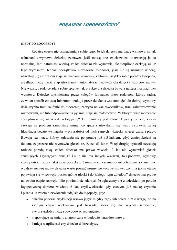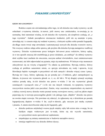 PORADNIK LOGOPEDYCZNY KIEDY DO LOGOPEDY? Rodzice często nie uświadamiają sobie tego, że ich dziecko ma wadę wymowy; są tak osłuchani z wymową dziecka, że nawet, jeśli mowę ono zniekształca, to uważają ja za normalną. Inni natomiast wiedzą, że ich dziecko źle wymawia, ale cierpliwie czekają, aż „z tego wyrośnie”. Jednak początkowo nieznaczne trudności, jeśli nie są usunięte w porę, utrwalają się i z czasem stają się wadami wymowy, z którymi szybko sobie poradzi logopeda, ale długo może trwać etap utrwalania i automatyzacji nowych dla dziecka wzorców mowy. Nie wszyscy rodzice zdają sobie sprawę, jak przykre dla dziecka bywają następstwa wadliwej wymowy. Dziecko wyśmiewane przez kolegów lub nawet przez rodziców, którzy sądzą, że w ten sposób zmuszą lub zmobilizują je przez działania „na ambicje” do dobrej wymowy dość szybko traci zaufanie do otoczenia, zaczyna unikać rówieśników, traci zainteresowanie rozmowami, nie lubi odpowiadać na pytania, staje się małomówne. W którym więc momencie zdecydować się na wizytę u logopedy? Tu zdania są podzielone. Bywają rodzice, którzy czekają aż problem samoistnie minie, co sprzyja utrwalaniu się wady i sprawia, że jej likwidacja będzie wymagała w przyszłości od nich samych i dziecka więcej czasu i pracy. Bywają też i tacy, którzy zgłaszają się po poradę już z 3-latkiem, gdyż zaniepokojeni są faktem, że jeszcze nie wymawia głosek sz, ż, cz, dż lub r. W tej drugiej sytuacji uzyskają rodzice poradę taką, że ich dziecko ma prawo w wieku 3 lat nie wymawiać głosek szumiących i syczących oraz „r” i o ile nie ma innych wskazań, to z poprawą wymowy rzeczywiście można jakiś czas poczekać. Zanim, więc zaczniemy niepotrzebnie się martwić o dalszy rozwój mowy dziecka warto poznać normy rozwojowe mowy, czyli na jakim etapie pojawiają się w rozwoju poszczególne głoski i do jakiego typu „błędów” dziecko ma prawo na swoim etapie rozwoju. Nie powinno się zdarzyć, że zgłaszamy się z dzieckiem po poradę logopedyczną dopiero w wieku 6 lat, czyli w okresie, gdy zaczyna już naukę czytania i pisania. A zatem niezwłocznie udaj się do logopedy, gdy: dziecko podczas artykulacji wsuwa język między zęby lub ociera nim o wargę, bo na każdym etapie wiekowym jest to wada, która się nie wycofa samoistnie, a w przyszłości może spowodować seplenienie; niepokojące są zmiany anatomiczne w budowie narządów mowy; istnieją wątpliwości czy dziecko dobrze słyszy; dziecko nawykowo mówi przez nos; dziecko po ukończeniu 4 r.ż. zamienia głoski dźwięczne na bezdźwięczne: „d” na „t” (np. zamiast domek mówi tomek), „w” na „f” (zamiast woda mówi fota), „g” na „k” (zamiast głowa mówi kłowa), „b” na „p” (zamiast buda mówi puta); dziecko pod koniec 3 r.ż. nie wymawia którejkolwiek z samogłosek ustnych: a, o, u, e, i, y; dziecko zniekształca głoski, np. wymawia „r” gardłowo. Ale trzeba wiedzieć, że zastępowanie głosek trudniejszych łatwiejszymi nie jest wadą ale swoistą cechą rozwoju mowy. Jeżeli jednak podczas wymawiania głosek dziecko nie zastępuje jej inną znaną w języku polskim, ale używa „obcego” dla nas dźwięku, wówczas warto zanotować sobie słowa, w których to ma miejsce i skonsultować to z logopedą; dziecko wyraźnie jąka się (miewa częste blokady i uporczywe powtarzanie jakiejś głoski lub utrudniony start mowy). Jednakże, jeśli zauważymy u dziecka lekkie zacinanie, powtarzanie sylab nie wpadajmy w panikę - może to być typowa, fizjologiczna niepłynność mowy. Bierze się ona stąd, że w wieku przedszkolnym rozwój myślenia i zasób słownictwa biernego, (co dziecko rozumie) rozwija się szybciej niż jego umiejętności wypowiadania swoich myśli, a to może powodować rozwojową niepłynność mowy. Jeśli jednak problem będzie się nasilał, potrzebna jest szybka konsultacja ze specjalistą. Trudno oczekiwać od specjalisty szybkich efektów terapeutycznych, gdy zajęcia odbywają się raz w tygodniu, a przez pozostały czas dziecko używa swoich wadliwych, nawykowych wzorców mowy. Do stymulacji czy korekty wadliwej wymowy nie potrzeba aż tyle czasu, by nawet zapracowani rodzice nie mogli go sobie odpowiednio zagospodarować to tylko kwestia chęci i umiejętnego zbudowania kontaktu z dzieckiem. Trzeba traktować je najzupełniej normalnie, a jeśli mamy pomagać - to dyskretnie i skutecznie. Opłaca się cierpliwość, łagodność i wyrozumiałość ze strony rodziców - to niezbędny warunek uzyskania oczekiwanych rezultatów. Kary, krzyki, wyśmiewanie dziecka i zmuszanie do ćwiczeń zniechęca do pracy nad wymową. Dzieci ćwiczą chętniej, gdy zabawy i gry, które im proponujemy trwają krótko, a każdy ich najdrobniejszy sukces jest nagradzany. Zadaniem rodziców jest, więc dostarczanie dziecku prawidłowych wzorców mowy i osłuchanie dziecka z poprawnym brzmieniem głosek, których ono jeszcze nie wymawia (wspólne oglądanie obrazków i nazywanie osób, przedmiotów i czynności, czytanie wierszy i opowiadań, układanie puzzli i nazywanie odnajdywanych szczegółów układanki). Często bywa tak, że, gdy dziecko dobrze osłucha się z brzmieniem głoski, podejmuje próby jej odtwarzania, ale nie należy tego momentu przyspieszać, ani przeceniać możliwości dziecka, bo przy wielu nieudanych próbach szybko się zniechęci. Zdarza się, że dziecko samo odkryje prawidłowe artykulacje mogąc obserwować aparat mowy swojej mamy lub taty, ale największą sztuką rodziców jest sprawienie, by dziecko naprawdę chciało podejmować wspólne ćwiczenia i związane z nimi zabawy. Jeżeli jednak to się nie udaje, to przyda się pomoc logopedy. RADY DLA RODZICÓW DOTYCZĄCE STYMULOWANIA ROZWOJU JĘZYKOWEGO DZIECKA 1. Mów, mów i jeszcze raz mów. U dziecka pozbawionego kontaktów werbalnych nie rozwinie się mowa. Mów wyraź