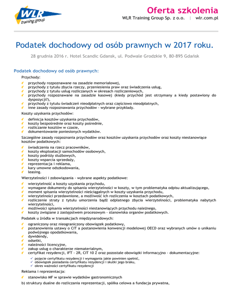 Oferta szkolenia WLR Training Group Sp. z o.o. | wlr.com.pl Podatek dochodowy od osób prawnych w 2017 roku. 28 grudnia 2016 r. Hotel Scandic Gdansk, ul. Podwale Grodzkie 9, 80-895 Gdańsk Podatek dochodowy od osób prawnych: Przychody: przychody rozpoznawane na zasadzie memoriałowej, przychody z tytułu zbycia rzeczy, przeniesienia praw oraz świadczenia usług, przychody z tytułu usług rozliczanych w okresach rozliczeniowych, przychody rozpoznawane na zasadzie kasowej (kiedy przychód jest otrzymany a kiedy postawiony do dyspozycji?), przychody z tytułu świadczeń nieodpłatnych oraz częściowo nieodpłatnych, inne zasady rozpoznawania przychodów - wybrane przykłady. Koszty uzyskania przychodów: definicja kosztów uzyskania przychodów, koszty bezpośrednie oraz koszty pośrednie, rozliczanie kosztów w czasie, dokumentowanie poniesionych wydatków. Szczególne zasady rozpoznania przychodów oraz kosztów uzyskania przychodów oraz koszty niestanowiące kosztów podatkowych: świadczenia na rzecz pracowników, koszty eksploatacji samochodów osobowych, koszty podróży służbowych, koszty wsparcia sprzedaży, reprezentacja i reklama, kary umowne odszkodowania, leasing. Wierzytelności i zobowiązania - wybrane aspekty podatkowe: wierzytelność a koszty uzyskania przychodu, wymagane dokumenty do spisania wierzytelności w koszty, w tym problematyka odpisu aktualizującego, moment spisania wierzytelności nieściągalnych w koszty uzyskania przychodu, wierzytelności przedawnione, a możliwość ich rozliczenia w kosztach podatkowych, rozliczenie straty z tytułu umorzenia bądź odpłatnego zbycia wierzytelności, problematyka nabytych wierzytelności, możliwości spisania wierzytelności niestanowiących przychodu należnego, koszty związane z zastępstwem procesowym - stanowiska organów podatkowych. Podatek u źródła w transakcjach międzynarodowych: ograniczony oraz nieograniczony obowiązek podatkowy, postanowienia ustawy o CIT a postanowienia konwencji modelowej OECD oraz wybranych umów o unikaniu podwójnego opodatkowania, dywidendy, odsetki, należności licencyjne, zakup usług o charakterze niematerialnym, certyfikat rezydencji, IFT - 2R, CIT 10 Z oraz pozostałe obowiązki informacyjno - dokumentacyjne: pojęcie certyfikatu rezydencji i wymagania jakie powinien spełnić, obowiązek posiadania certyfikatu rezydencji i skutki jego braku, okres ważności certyfikatu rezydencji Reklama i reprezentacja: stanowisko MF w sprawie wydatków gastronomicznych b) struktury dualne do rozliczania reprezentacji, spółka celowa a fundacja prywatna, c) ujęcie wydatków na reprezentację i reklamę w kosztach podatkowych: upominki dla kontrahentów, wyżywienie w trakcie konferencji i szkoleń, poczęstunki dla kontrahentów, organizowanie imprez artystycznych i sportowo rekreacyjnych, kartki świąteczne, organizacja konferencji i szkoleń o charakterze reklamowym i instruktażowym, reklama a marketing - skutki podatkowe, tablice reklamowe, degustacje, upominki reklamowe, plakaty, udział w targach i konferencjach itp. zasady rozliczeń podatkowych. sponsoring w działalności przedsiębiorstwa, sprzedaż premiowa, programy lojalnościowe, problematyka premii pieniężnych oraz rabaty potransakcyjne Samochód w działalności gospodarczej: wydatki związane z używaniem samochodu ciężarowego, wydatki związane z używaniem samochodu osobowego, samochody służbowe wykorzystywane do celów prywatnych, samochód niebędący środkiem trwałym podatnika. Planowane zmiany w 2017 roku - wybrane aspekty: wprowadzenie obniżonej stawki dla małych podatników wniesienie wkładu niepieniężnego - nowe zasady ustalania przychodu (możliwość szacowania) wymiana udziałów - nowe warunki zwolnienia Nowelizacja przepisów Ordynacji podatkowej w 2016 - wybrane aspekty: Przepisy antyoptymalizacyjne - Klauzula przeciwko unikaniu opodatkowania Zasada in dubio pro tributario w praktyce - znaczenie zasady rozstrzygania niedających się usunąć wątpliwości co do treści przepisów prawa podatkowego na korzyść podatnika Pełnomocnictwo w postępowaniu podatkowym (zmiany od 1.01.2016 oraz 1.07.2016), rodzaje pełnomocnictw: ogólne, szczególne, do doręczeń) Korekta deklaracji oraz obniżone i podwyższone stawki odsetek za zwłokę - nowe zasady naliczania Nowe formy zapłaty podatku Podsumowanie, pytania i odpowiedzi Wykładowca: Mariusz Nowak Doradca podatkowy, Doktorant Uniwersytetu Ekonomicznego w Poznaniu. Pięcioletnie doświadczenie zawodowe na stanowiskach kierowniczych w urzędzie skarbowym, gdzie specjalizował się w kontrolach podatkowych, postępowaniach podatkowych oraz postępowaniach egzekucyjnych w administracji. Dwuletnie doświadczenie zawodowe w jednej z największych firm produkcyjnych świata, w której zajmowałem się doradztwem podatkowym. Obecnie prezes zarządu w międzynarodowej spółce doradztwa podatkowego. Zajmuję się obsługą prawno-podatkową polskich oraz międzynarodowych firm. Posiada szerokie doświadczenie w prowadzeniu szkoleń dla urzędów skarbowych, biur rachunkowych, księgowych oraz dla przedsiębiorców. W szkoleniach koncentruję się na poszukiwaniu sposobów optymalizacji opodatkowania. Przedstawiam sposób działania. Jestem autorem publikacji w biuletynie finansowym i w gazecie prawnej. od 2013 roku posiada uprawnienia niemieckiego doradcy podatkowego. Harmonogram: 09:45 - 10:00 10:00 - 11:30 11:30 - 11:45 11:45 - 13:30 13:30 - 14:00 14:00 - 16:00 16:00 Rejestracja i przywitanie uczestników Szkolenie Przerwa kawowa Szkolenie Lunch Szkolenie Zakończenie szkolenia FORMULARZ ZGŁOSZENIOWY Prosimy przesłać faksem: 22 632 47 18 lub: [email protected] Podatek dochodowy od osób prawnych w 2017 roku. 28 grudnia 2016 r. Hotel Scandic Gdansk, ul. Podwale Grodzkie 9, 80-895 Gdańsk Imiona, nazwiska oraz stanowiska uczestników: Nazwa firmy: NIP: Adres firmy: Tel: Fax: Proszę o wysłanie e-faktury VAT w formie załącznika PDF na a