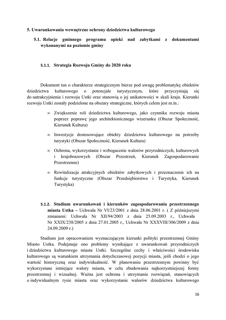 5. Uwarunkowania wewnętrzne ochrony dziedzictwa kulturowego 5.1. Relacje gminnego programu wykonanymi na poziomie gminy opieki nad zabytkami z dokumentami 5.1.1. Strategia Rozwoju Gminy do 2020 roku Dokument ten o charakterze strategicznym bierze pod uwagę problematykę obiektów dziedzictwa kulturowego o potencjale turystycznym, które przyczyniają się do uatrakcyjnienia i rozwoju Ustki oraz stanowią o jej unikatowości w skali kraju. Kierunki rozwoju Ustki zostały podzielone na obszary strategiczne, których celem jest m.in.: • Zwiększenie roli dziedzictwa kulturowego, jako czynnika rozwoju miasta poprzez poprawę jego architektonicznego wizerunku (Obszar Społeczność, Kierunek Kultura) • Inwestycje dostosowujące obiekty dziedzictwa kulturowego na potrzeby turystyki (Obszar Społeczność, Kierunek Kultura) • Ochrona, wykorzystanie i wzbogacenie walorów przyrodniczych, kulturowych i krajobrazowych (Obszar Przestrzeń, Kierunek Zagospodarowanie Przestrzenne) • Rewitalizacja atrakcyjnych obiektów zabytkowych i przeznaczenie ich na funkcje turystyczne (Obszar Przedsiębiorstwo i Turystyka, Kierunek Turystyka) 5.1.2. Studium uwarunkowań i kierunków zagospodarowania przestrzennego miasta Ustka – Uchwała Nr VI/23/2001 z dnia 28.06.2001 r. ( Z późniejszymi zmianami: Uchwała Nr XII/94/2003 z dnia 25.09.2003 r., Uchwała Nr XXIX/238/2005 z dnia 27.01.2005 r., Uchwała Nr XXXVIII/306/2009 z dnia 24.09.2009 r.) Studium jest opracowaniem wyznaczającym kierunki polityki przestrzennej Gminy Miasto Ustka. Podejmuje ono problemy wynikające z uwarunkowań przyrodniczych i dziedzictwa kulturowego miasta Ustki. Szczególne cechy i właściwości środowiska kulturowego są warunkiem utrzymania dotychczasowej pozycji miasta, jeśli chodzi o jego wartość historyczną oraz indywidualność. W planowaniu przestrzennym powinny być wykorzystane istniejące walory miasta, w celu zbudowania najkorzystniejszej formy przestrzennej i wizualnej. Ważna jest ochrona i utrzymanie rozwiązań, stanowiących o indywidualnym rysie miasta oraz wykorzystanie walorów dziedzictwa kulturowego 16 w promocji miasta i jego unikatowego charakteru. Do środków, mających na celu zrealizowanie powyższych zadań, m.in. należą: • Ochrona zespołów przestrzennych oraz pojedynczych obiektów wpisanych do rejestru zabytków • Ochrona stanowisk i obszarów archeologicznych, objętych strefami ochrony archeologiczno-konserwatorskiej • Ochrona gabarytów obiektów pozostających w strefach ochrony konserwatorskiej, a niewpisanych do rejestru zabytków • Ochrona układów urbanistycznych, w tym wielkości parcel i sposobu ich pierwotnego zainwestowania • Ochrona dawnych układów komponowanej zieleni, w tym zieleni przyulicznej oraz większych kompleksów zieleni parku kuracyjnego • Ochrona klimatu i nastroju historycznych krajobrazów zbudowanych przez zachowane elementy i układy kompozycyjne Gminny Program Opieki nad Zabytkami dla miasta Ustka jest zgodny z celem wyznaczonym w wyżej cytowanym Studium. 5.1.3. Miejscowe Plany zagospodarowania przestrzennego gminy miasto Ustka Dziedzictwo kulturowe w Ustce chronione jest na podstawie miejscowych planów zagospodarowania przestrzennego. Miejscowe plany zawierają zasady ochrony układów urbanistycznych, warunki konserwatorskie dotyczące realizacji nowej zabudowy w strefach ochrony konserwatorskiej oraz zasad ochrony zabytków znajdujących się w gminnej ewidencji zabytków. Plany wskazują strefy ochrony archeologiczno-konserwatorskiej oznaczone na poszczególnych rysunkach planów . Poniżej wymienimy miejscowe plany zagospodarowania przestrzennego obowiązujące na terenie miasta Ustki: • Miejscowy plan zagospodarowania przestrzennego pn. „Łacha” uchwalony uchwałą Rady Miejskiej w Ustce Nr IV/26/98 z dn. 30.04.1998 r. • Miejscowy plan zagospodarowania przestrzennego pn. „Tuczarnia” uchwalony uchwałą Rady Miejskiej Nr V/76/98 z dn. 09.06.1998 r. 17 • Miejscowy plan zagospodarowania przestrzennego pn. „Polna Zabudowa Jednorodzinna” uchwalony uchwałą Rady Miejskiej w Ustce Nr IV/16/2000 z dn. 27.04.2000 r. • Miejscowy plan zagospodarowania przestrzennego pn. „Westerplatte” uchwalony uchwałą Rady Miejskiej w Ustce Nr II/9/99 z dn. 25.02.1999 r. • Miejscowy plan zagospodarowania przestrzennego pn. „Zubrzyckiego i okolice” uchwalony uchwałą Rady Miejskiej Nr XII/79/99 z dn. 28.10.1999 r. • Miejscowy plan zagospodarowania przestrzennego pn. „Os. Kwiatowe i okolice” uchwalony uchwałą Rady Miejskiej Nr VI/32/2001 z 28.06.2001 r. • Miejscowy plan zagospodarowania przestrzennego pn. „ Darłowska i okolice” uchwalony uchwałą Nr XII/78/99 z dn. 28.10.1999 r. • Miejscowy plan zagospodarowania przestrzennego pn. „Promenada” uchwalony uchwałą Rady Miejskiej Nr VI/30/2001 z dn. 28.06.2001 r. • Miejscowy plan zagospodarowania przestrzennego pn. „ Grunwaldzka” uchwalony uchwałą Nr III/12/2001 z dn. 29.03.2001 r. • Miejscowy plan zagospodarowania przestrzennego pn. „Centrum 1” uchwalony uchwałą Rady Miejskiej Nr XXI/182/2004 z dn. 26.05.2004 r. • Miejscowy plan zagospodarowania przestrzennego dla terenów strefy Śródmieścia Ustki pn. „Centrum 2” uchwalony uchwałą Rady Miejskiej w Ustce Nr XII/103/2003 z dn. 25.09.2003 r. ograniczonego ulicami Marynarki Polskiej, P. Findera (obecnie Kaszubska), Mała, Kosynierów, Portowa, kanał portowy • Miejscowy plan zagospodarowania przestrzennego pn. „Przy Granicy” uchwalonego uchwałą Rady Miejskiej Nr XI/85/2003 z dn. 28.08.2003 • Miejscowy plan zagospodarowania przestrzennego pn. „Ogrodowa” uchwalonego uchwałą Rady Miejskiej Nr VI/35/2002 z dn. 27.06.2002 r. • Miejscowy plan zagospodarowania przestrzennego pn. „ Zabudowa jednorodzinna Jaśminowa-Kwiatowa” uchwalony uchwałą Rady Miejskiej Nr XI/68/2001 z dn. 29.11.2001 r. • Miejscowy plan zagospodarowania przestrzennego Darłowska-Kwiatowa” uchwalo