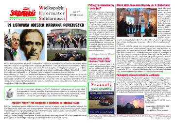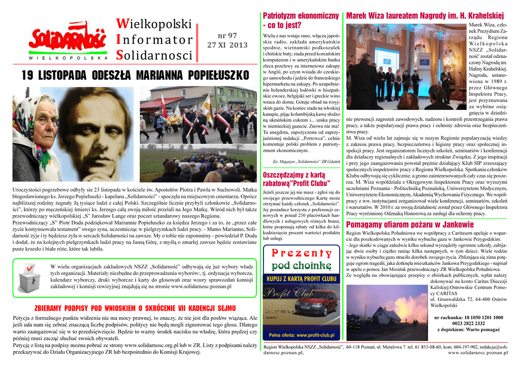 Wielkopolski Informator , Solidarnosci Patriotyzm ekonomiczny Marek Wiza laureatem Nagrody im. H. Krahelskiej Marek Wiza, cz³o- co to jest? nr 97 27 XI 2013 19 listopada odesz³a Marianna popie³uszko Wielu z nas wstaje rano, w³¹cza japoñskie radio, zak³ada amerykañskie spodnie, wietnamski podkoszulek i chiñskie buty, siada przed koreañskim komputerem i w amerykañskim banku zleca przelewy za internetowe zakupy w Anglii, po czym wsiada do czeskiego samochodu i jedzie do francuskiego hipermarketu na zakupy. Po uzupe³nieniu holenderskiej lodówki w hiszpañskie owoce, belgijski ser i greckie wino wraca do domu. Gotuje obiad na rosyjskim gazie. Na koniec siada na w³oskiej kanapie, pij¹c kolumbijsk¹ kawê s³odzo n¹ ukraiñskim cukrem i... szuka pracy w niemieckiej gazecie. Znowu nie ma! Ta anegdota, zapo¿yczona od zaprzyjaŸnionej redakcji „Portowca”, celnie komentuje polski problem z patriotyzmem ekonomicznym. Za: Magazyn „Solidarnoœci” ZR Gdañsk Oszczêdzajmy z kart¹ rabatow¹”Profit Clubu” Uroczystoœci pogrzebowe odby³y sie 23 listopada w koœciele œw. Aposto³ów Piotra i Paw³a w Suchowoli. Matka b³ogos³awionego ks. Jerzego Popie³uszki - kapelana „Solidarnoœci” - spoczê³a na miejscowym cmentarzu. Oprócz najbli¿szej rodziny ¿egna³y J¹ tysi¹ce ludzi z ca³ej Polski. Szczególnie licznie przybyli cz³onkowie „Solidarnoœci”, którzy po mêczeñskiej œmierci ks. Jerzego ca³¹ swoj¹ mi³oœæ przelali na Jego Matkê. Wœród nich by³ tak¿e przewodnicz¹cy wielkopolskiej „S” Jaros³aw Lange oraz poczet sztandarowy naszego Regionu. Przewodnicz¹cy „S” Piotr Duda podziêkowa³ Mariannie Popie³uszko za ksiêdza Jerzego i za to, ¿e „przez ca³e ¿ycie kontynuowa³a testament” swego syna, uczestnicz¹c w pielgrzymkach ludzi pracy. - Mamo Marianno, Solidarnoœæ ¿yje i ty bêdziesz ¿y³a w sercach Solidarnoœci na zawsze. My o tobie nie zapomnimy - powiedzia³ P. Duda i doda³, ¿e na kolejnych pielgrzymkach ludzi pracy na Jasn¹ Górê, z myœl¹ o zmar³ej zawsze bêdzie zostawiane puste krzes³o i bia³e ró¿e, które tak lubi³a. W wielu organizacjach zak³adowych NSZZ „Solidarnoœæ” odbywaj¹ siê ju¿ wybory w³adz tych organizacji. Materia³y niezbêdne do przeprowadzenia wyborów:, tj. ordynacja wyborcza, kalendarz wyborczy, druki wyborcze i karty do g³osowañ oraz wzory sprawozdañ komisji zak³adowej i komisji rewizyjnej znajduj¹ siê na stronie www.solidarnosc.poznan.pl Je¿eli jeszcze jej nie masz - zg³oœ siê do swojego przewodniczego Kartê mo¿e otrzymaæ ka¿dy cz³onek „Solidarnoœci”. Jej posiadacz korzysta z preferencji cenowych w ponad 250 placówkach handlowych i us³ugowych ró¿nych bran¿, które proponuj¹ rabaty od kilku do kilkudziesiêciu procent wartoœci produktu lub us³ugi. Prezenty pod choinkê KUPUJ Z KART¥ PROFIT CLUBU ZBIERAMY PODPISY POD WNIOSKIEM O SKRÓCENIE VII KADENCJI SEJMU Petycja z formalnego punktu widzenia nie ma mocy prawnej, to znaczy, ¿e nie jest dla pos³ów wi¹¿¹ca. Ale jeœli uda nam siê zebraæ znacz¹c¹ liczbê podpisów, politycy nie bêd¹ mogli zignorowaæ tego g³osu. Dlatego warto zaanga¿owaæ siê w to przedsiêwziêcie. Bêdzie to wa¿ny œrodek nacisku na w³adzê, która prêdzej czy póŸniej musi zacz¹æ s³uchaæ swoich obywateli. Petycjê z list¹ na podpisy mo¿na pobraæ ze strony www.solidarnosc.org.pl lub w ZR. Listy z podpisami nale¿y przekazywaæ do Dzia³u Organizacyjnego ZR lub bezpoœrednio do Komisji Krajowej. nek Prezydium Zarz¹du Regionu Wi e l k o p o l s k a NSZZ „Solidarnoœæ' zosta³ odznaczony Nagrod¹ im. Haliny Krahelskiej. Nagroda, ustanowiona w 1989 r. przez G³ównego Inspektora Pracy, jest przyznawana za wybitne osi¹gniêcia w dziedzinie prewencji zagro¿eñ zawodowych, nadzoru i kontroli przestrzegania prawa pracy, a tak¿e popularyzacji prawa pracy i ochrony zdrowia oraz bezpieczeñstwa pracy. M. Wiza od wielu lat zajmuje siê w nszym Regionie popularyzacj¹ wiedzy z zakresu prawa pracy, bezpieczeñstwa i higieny pracy oraz spo³ecznej inspekcji pracy. Jest organizatorem licznych szkoleñ, seminariów i konferencji dla dzia³aczy regionalnych i zak³adowych struktur Zwi¹zku. Z jego inspiracji i przy jego zaanga¿owaniu powsta³ prê¿nie dzia³aj¹cy Klub SIP zrzeszaj¹cy spo³ecznych inspektorów pracy z Regionu Wielkopolska. Spotkania cz³onków Klubu odbywaj¹ siê cyklicznie, a grono zainteresowanych ca³y czas siê poszerza. M. Wiza wspó³dzia³a z Okrêgowym Inspektorem Pracy oraz wy¿szymi uczelniami Poznania - Politechnik¹ Poznañsk¹, Uniwersytetem Medycznym, Uniwersytetem Ekonomicznym, Akademi¹ Wychowania Fizycznego. We wspó³pracy z ww. instytucjami zorganizowa³ wiele konferencji, seminariów, szkoleñ i warsztatów. W 2010 r. za swoj¹ dzia³alnoœæ zosta³ przez G³ównego Inspektora Pracy wyró¿niony Odznak¹ Honorow¹ za zas³ugi dla ochrony pracy. Pomagamy ofiarom po¿aru w Jankowie Region Wielkopolska Po³udniowa we wspó³pracy z Caritasem apeluje o wsparcie dla poszkodowanych w wyniku wybuchu gazu w Jankowie Przygodzkim. - Jego skutki w ci¹gu zaledwie kilku sekund wyrz¹dzi³y ogromne szkody, zabijaj¹c dwie osoby i ciê¿ko rani¹c kilka nastêpnych, w tym dzieci. Wiele rodzin w wyniku wybuchu gazu straci³o dorobek swojego ¿ycia. Zbli¿aj¹ca siê zima potêguje ogrom tragedii, jaka dotknê³a mieszkañców Jankowa Przygodzkiego - napisa³ w apelu o pomoc Jan Mosiñsk przewodnicz¹cy ZR Wielkopolska Po³udniowa. Ze wzglêdu na obowi¹zuj¹ce przepisy o zbiórkach publicznych, wp³at nale¿y dokonywaæ na konto Caritas Diecezji Kaliskiej:Ostrowskie Centrum Pomocy CARITAS ul. Grunwaldzka 72, 64-400 Ostrów Wielkopolski nr rachunku: 18 1050 1201 1000 0023 2822 2332 z dopiskiem: Warto pomagaæ Pe³na oferta: www.profit-club.pl Region Wielkopolska NSZZ „Solidarnoœæ”, 60-118 Poznañ, ul. Metalowa 7. tel. 61 853-08-60, kom. 604-197-902, [email protected], www.solidarnosc.poznan