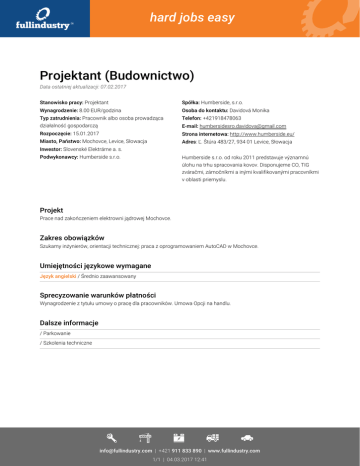 hard jobs easy Projektant (Budownictwo) Data ostatniej aktualizacji: 07.02.2017 Stanowisko pracy: Projektant Spółka: Humberside, s.r.o. Wynagrodzenie: 8.00 EUR/godzina Osoba do kontaktu: Davidová Monika Typ zatrudnienia: Pracownik albo osoba prowadząca Telefon: +421918478063 działalność gospodarczą E-mail: [email protected] Rozpoczęcie: 15.01.2017 Strona internetowa: http://www.humberside.eu/ Miasto, Państwo: Mochovce, Levice, Słowacja Adres: Ľ. Štúra 483/27, 934 01 Levice, Słowacja Inwestor: Slovenské Elektrárne a. s. Podwykonawcy: Humberside s.r.o. Humberside s.r.o. od roku 2011 predstavuje významnú úlohu na trhu spracovania kovov. Disponujeme CO, TIG zváračmi, zámočníkmi a inými kvalifikovanými pracovníkmi v oblasti priemyslu. Projekt Prace nad zakończeniem elektrowni jądrowej Mochovce. Zakres obowiązków Szukamy inżynierów, orientacji technicznej: praca z oprogramowaniem AutoCAD w Mochovce. Umiejętności językowe wymagane Język angielski / Średnio zaawansowany Sprecyzowanie warunków płatności Wynagrodzenie z tytułu umowy o pracę dla pracowników. Umowa Opcji na handlu. Dalsze informacje / Parkowanie / Szkolenia techniczne [email protected] | +421 911 833 890 | www.fullindustry.com 1/1 | 04.03.2017 12:41