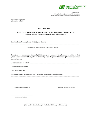 Załącznik nr 3 do Regulaminu akcji market. „Dziś oszczędzam w SKO jutro w Banku Spółdzielczym w Limanowej” ............................... (pieczątka szkoły) ZGŁOSZENIE „DZIŚ OSZCZĘDZAM W SKO JUTRO W BANKU SPÓŁDZIELCZYM” pod patronatem Banku Spółdzielczego w Limanowej Szkolna Kasa Oszczędności (SKO) przy Szkole ..................................................................................................................................................... ..................................................................................................................................................... (adres szkoły, miejscowość, kod pocztowy, powiat,) działająca pod patronatem Banku Spółdzielczego w Limanowej zgłasza swój udział w akcji „Dziś oszczędzam w SKO jutro w Banku Spółdzielczym w Limanowej” w roku szkolnym ............/............ Liczba uczniów w szkole ........................................................................................................... Liczba członków SKO ............................................................................................................... Data powstania SKO .................................................................................................................. Numer rachunku bankowego SKO w Banku Spółdzielczym Limanowej ..................................................................................................................................................... ............................................. (podpis Opiekuna SKO) .............................................. ( podpis Dyrektora Szkoły) ……………………………………. miejscowość, data .............................................................................................................. (data i podpis Członka Zarządu Banku Spółdzielczego w Limanowej)