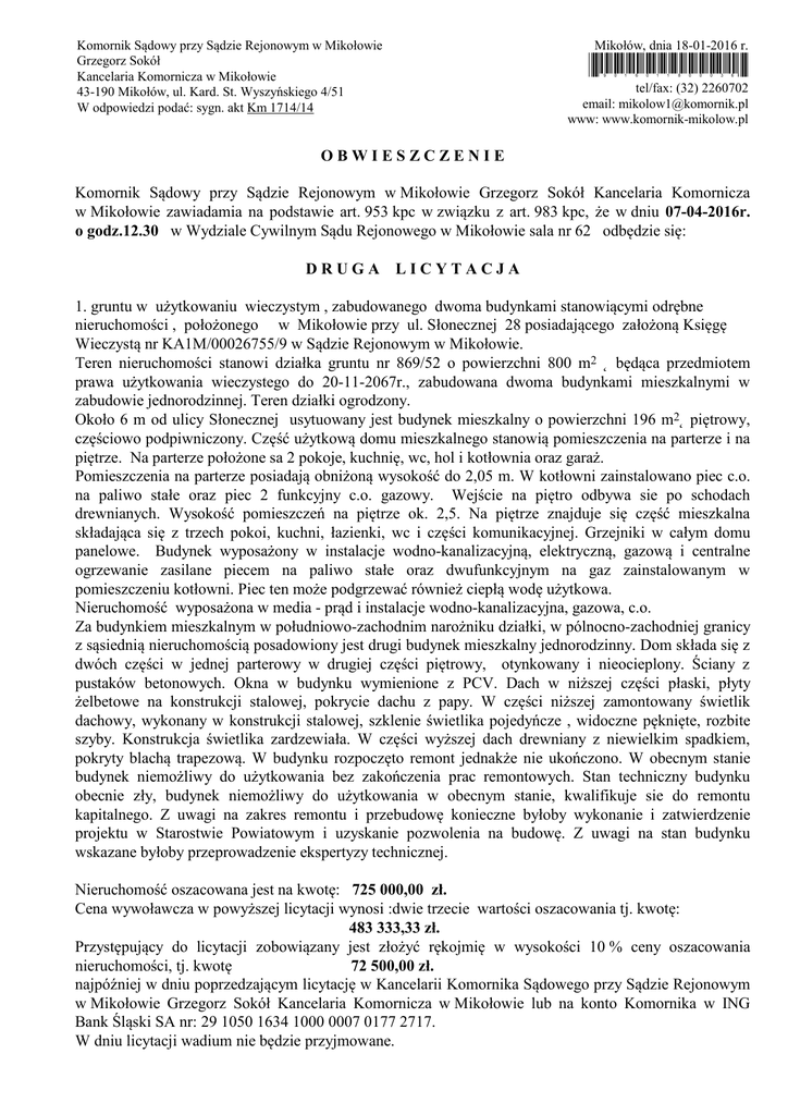 Komornik Sądowy przy Sądzie Rejonowym w Mikołowie Grzegorz Sokół Kancelaria Komornicza w Mikołowie 43-190 Mikołów, ul. Kard. St. Wyszyńskiego 4/51 W odpowiedzi podać: sygn. akt Km 1714/14 Mikołów, dnia 18-01-2016 r. *9016011800036* tel/fax: (32) 2260702 email: [email protected] www: www.komornik-mikolow.pl OBWIESZCZENIE Komornik Sądowy przy Sądzie Rejonowym w Mikołowie Grzegorz Sokół Kancelaria Komornicza w Mikołowie zawiadamia na podstawie art. 953 kpc w związku z art. 983 kpc, że w dniu 07-04-2016r. o godz.12.30 w Wydziale Cywilnym Sądu Rejonowego w Mikołowie sala nr 62 odbędzie się: DRUGA LICYTACJA 1. gruntu w użytkowaniu wieczystym , zabudowanego dwoma budynkami stanowiącymi odrębne nieruchomości , położonego w Mikołowie przy ul. Słonecznej 28 posiadającego założoną Księgę Wieczystą nr KA1M/00026755/9 w Sądzie Rejonowym w Mikołowie. Teren nieruchomości stanowi działka gruntu nr 869/52 o powierzchni 800 m2 ˛ będąca przedmiotem prawa użytkowania wieczystego do 20-11-2067r., zabudowana dwoma budynkami mieszkalnymi w zabudowie jednorodzinnej. Teren działki ogrodzony. Około 6 m od ulicy Słonecznej usytuowany jest budynek mieszkalny o powierzchni 196 m2˛ piętrowy, częściowo podpiwniczony. Część użytkową domu mieszkalnego stanowią pomieszczenia na parterze i na piętrze. Na parterze położone sa 2 pokoje, kuchnię, wc, hol i kotłownia oraz garaż. Pomieszczenia na parterze posiadają obniżoną wysokość do 2,05 m. W kotłowni zainstalowano piec c.o. na paliwo stałe oraz piec 2 funkcyjny c.o. gazowy. Wejście na piętro odbywa sie po schodach drewnianych. Wysokość pomieszczeń na piętrze ok. 2,5. Na piętrze znajduje się część mieszkalna składająca się z trzech pokoi, kuchni, łazienki, wc i części komunikacyjnej. Grzejniki w całym domu panelowe. Budynek wyposażony w instalacje wodno-kanalizacyjną, elektryczną, gazową i centralne ogrzewanie zasilane piecem na paliwo stałe oraz dwufunkcyjnym na gaz zainstalowanym w pomieszczeniu kotłowni. Piec ten może podgrzewać również ciepłą wodę użytkowa. Nieruchomość wyposażona w media - prąd i instalacje wodno-kanalizacyjna, gazowa, c.o. Za budynkiem mieszkalnym w południowo-zachodnim narożniku działki, w pólnocno-zachodniej granicy z sąsiednią nieruchomością posadowiony jest drugi budynek mieszkalny jednorodzinny. Dom składa się z dwóch części w jednej parterowy w drugiej części piętrowy, otynkowany i nieocieplony. Ściany z pustaków betonowych. Okna w budynku wymienione z PCV. Dach w niższej części płaski, płyty żelbetowe na konstrukcji stalowej, pokrycie dachu z papy. W części niższej zamontowany świetlik dachowy, wykonany w konstrukcji stalowej, szklenie świetlika pojedyńcze , widoczne pęknięte, rozbite szyby. Konstrukcja świetlika zardzewiała. W części wyższej dach drewniany z niewielkim spadkiem, pokryty blachą trapezową. W budynku rozpoczęto remont jednakże nie ukończono. W obecnym stanie budynek niemożliwy do użytkowania bez zakończenia prac remontowych. Stan techniczny budynku obecnie zły, budynek niemożliwy do użytkowania w obecnym stanie, kwalifikuje sie do remontu kapitalnego. Z uwagi na zakres remontu i przebudowę konieczne byłoby wykonanie i zatwierdzenie projektu w Starostwie Powiatowym i uzyskanie pozwolenia na budowę. Z uwagi na stan budynku wskazane byłoby przeprowadzenie ekspertyzy technicznej. Nieruchomość oszacowana jest na kwotę: 725 000,00 zł. Cena wywoławcza w powyższej licytacji wynosi :dwie trzecie wartości oszacowania tj. kwotę: 483 333,33 zł. Przystępujący do licytacji zobowiązany jest złożyć rękojmię w wysokości 10 % ceny oszacowania nieruchomości, tj. kwotę 72 500,00 zł. najpóźniej w dniu poprzedzającym licytację w Kancelarii Komornika Sądowego przy Sądzie Rejonowym w Mikołowie Grzegorz Sokół Kancelaria Komornicza w Mikołowie lub na konto Komornika w ING Bank Śląski SA nr: 29 1050 1634 1000 0007 0177 2717. W dniu licytacji wadium nie będzie przyjmowane. Jeżeli nie dojdzie do sprzedaży w całości gruntu w użytkowaniu wieczystym , zabudowanego dwoma budynkami oznaczonego w KW numer KA1M/00026755/9 , ogłoszonej w punkcie 1 obwieszczenia, Komornik Sądowy przystąpi do sprzedaży udziałów w w/w prawie tj.: 2. udziału 1/2 w gruncie oddanym w użytkowanie wieczyste, zabudowanym dwoma budynkami stanowiącymi odrębne nieruchomości , położonym w Mikołowie przy ul. Słonecznej 28 , zapisanym w księdze wieczystej nr KA1M/00026755/9 udział oszacowany jest na kwotę: 362 500,00 zł. Cena wywoławcza w powyższej licytacji wynosi :dwie trzecie wartości oszacowania tj. kwotę: 241 666,67 zł. Przystępujący do licytacji zobowiązany jest złożyć rękojmię w wysokości 10 % ceny oszacowania nieruchomości, tj. kwotę 36 250,00 zł. 3.udziału 1/4 w gruncie oddanym w użytkowanie wieczyste, zabudowanym dwoma budynkami stanowiącymi odrębne nieruchomości , położonym w Mikołowie przy ul. Słonecznej 28 , zapisanym w księdze wieczystej nr KA1M/00026755/9 oznaczony w Dziale II KW , Podrubryka 2.4.2 jako numer udziału w prawie - 2 udział oszacowany jest na kwotę: 181 250,00 zł. Cena wywoławcza w powyższej licytacji wynosi: dwie trzecie wartości oszacowania tj. kwotę: 120 833,33 zł. Przystępujący do licytacji zobowiązany jest złożyć rękojmię w wysokości 10 % ceny oszacowania nieruchomości, tj. kwotę 18 125,00 zł. 4.udziału 1/4 w gruncie oddanym w użytkowanie wieczyste, zabudowanym dwoma budynkami stanowiącymi odrębne nieruchomości , położonym w Mikołowie przy ul. Słonecznej 28 , zapisanym w księdze wieczystej nr KA1M/00026755/9 oznaczonym w Dziale II KW Podrubryka 2.4.2 jako numer udziału w prawie - 3 udział oszacowany jest na kwotę: 181 250,00 zł. Cena wywoławcza w powyższej licytacji wynosi: dwie trzecie wartości oszacowania tj. kwotę: 120 833,33 zł. Przystępujący do licytacji zobowiązany jest zło