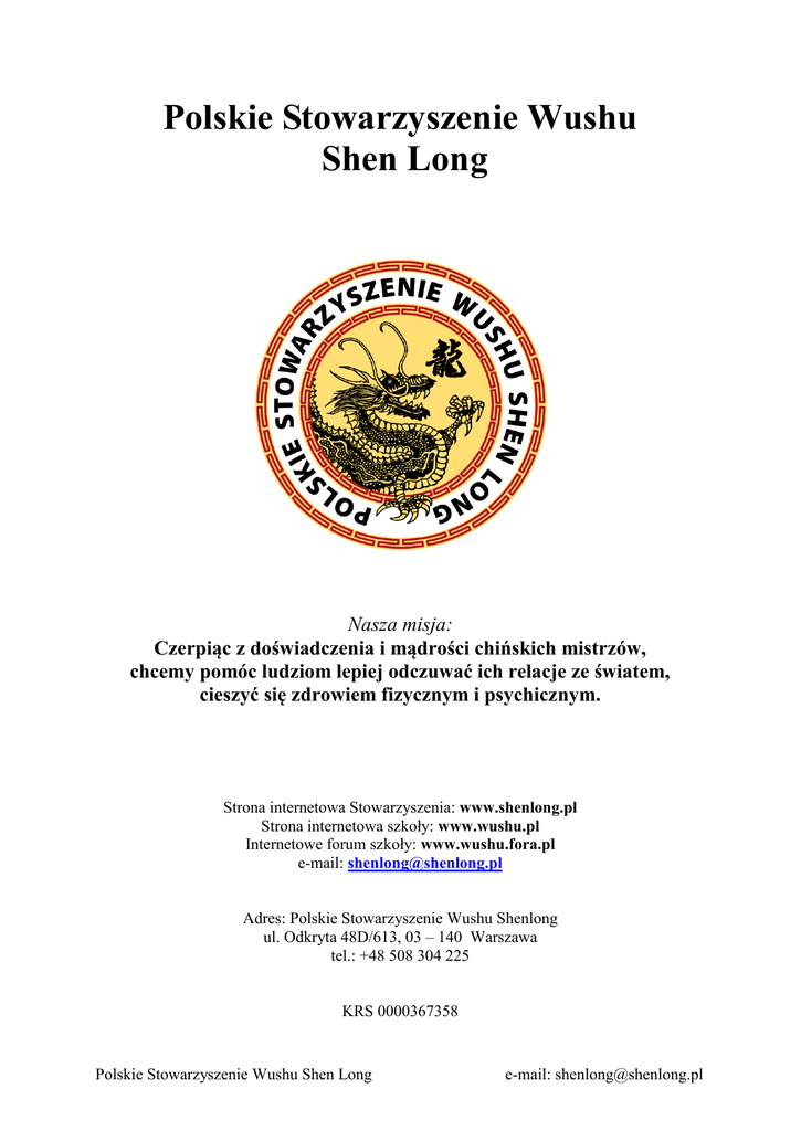 Polskie Stowarzyszenie Wushu Shen Long Nasza misja: Czerpiąc z doświadczenia i mądrości chińskich mistrzów, chcemy pomóc ludziom lepiej odczuwać ich relacje ze światem, cieszyć się zdrowiem fizycznym i psychicznym. Strona internetowa Stowarzyszenia: www.shenlong.pl Strona internetowa szkoły: www.wushu.pl Internetowe forum szkoły: www.wushu.fora.pl e-mail: [email protected] Adres: Polskie Stowarzyszenie Wushu Shenlong ul. Odkryta 48D/613, 03 – 140 Warszawa tel.: +48 508 304 225 KRS 0000367358 Polskie Stowarzyszenie Wushu Shen Long e-mail: [email protected] O Polskim Stowarzyszeniu Wushu Shen Long Polskie Stowarzyszenie Wushu Shen Long powstalo w 2010 roku. Celami Stowarzyszenia są: zwiększenie postaw prospołecznych i obywatelskich, profilaktyka w zakresie zdrowia fizycznego i psychicznego społeczeństwa, upowszechnienie kultury fizycznej, udział w kulturze fizycznej poprzez uprawianie chińskich sztuk walki (Wushu), upowszechnianie wiedzy o kulturach Dalekiego Wschodu. Nasze Stowarzyszenie aktywnie uczestniczy w pracach różnych organizacji społecznych, które są związane z realizacją naszej misji. Szkoła działająca przy naszym Stowarzyszeniu powstała w 1999 roku i jest filią szkoły mistrza Zhang Feng Juna. W ciągu dziesięciu lat istnienia, w zajęciach prowadzonych w ramach szkoły Shen Long, brało udział około tysiąca osób w wieku od 5 do 85 lat. Regularnie naukę w szkole pobiera ponad trzystu uczniów. Podczas zajęć poznają oni tajniki chińskich sztuk walki. Uczniowie, w zależności od wieku, predyspozycji, przygotowania fizycznego i potrzeb, uczą się sportowych stylów walki, praktykowania chińskiej gimnastyki zdrowotnej zwanej taiji (wym. tai czi) oraz ćwiczeń relaksacyjnych qigung (wym. czikung). Shen Long jest członkiem: Polsko-Chińskiego Stowarzyszenia Wushu „Nan-Bei" Polsko-Azjatyckiego Stowarzyszenia Kulturalnego Polskiego Zrzeszenia Wushu. Szkoła Polskiego Stowarzyszenia Wushu Shen Long aktywnie propaguje ideę łamania barier kulturowych oraz rozwój psychiczny i fizyczny społeczeństwa. Działania te prowadzi zapraszając do udziału w otwartych treningach, organizowanych wiosną i latem w warszawskich parkach, uczestnicząc w spotkaniach i szkoleniach poświęconych zdrowemu trybowi życia. Dzięki szerokiej ofercie oraz dopasowaniu poziomu i tematyki zajęć do potrzeb ich uczestników, z nauczania chińskich sztuk walki korzystają najróżniejsi uczniowie. Wśród nich są studenci Uniwersytetu Trzeciego Wieku, wybitni twórcy i artyści, tacy jak Tomasz Bagiński, ludzie biznesu, pracownicy nauki, młodzież szkolna i przedszkolaki. O skuteczności we wspieraniu procesów wychowawczych trudnej młodzieży poprzez nauczanie Wushu, przekonali się pedagodzy z domu poprawczego, w którym prowadzone są zajęcia przez nauczyciela szkoły Stowarzyszenia Shen Long. Członkowie Stowarzyszenia aktywnie propagują wiedzę na temat chińskich sztuk walki, wielowiekowych doświadczeń ludów wschodu, dotyczących zdrowego trybu życia, wiedzy na temat Chin i procesów zachodzących w społeczeństwie chińskim, na łamach wydawanej dwa razy w roku szkolnej gazetki, prowadzonego przez nich otwartego forum internetowego, na stronie internetowej szkoły Shen Long oraz w prestiżowych magazynach socjologicznych. Podczas konferencji organizowanych przez gminne i miejskie ośrodki kultury, spotkań firmowych, poświęconych zdrowemu trybowi życia czy festiwali związanych z Chinami i kulturą wschodu, można zobaczyć przedstawicieli stowarzyszenia, którzy są prelegentami, uczestnikami pokazów sportowych czy wystawcami, dzielącymi się wiedzą z uczestnikami tego typu imprez. Polskie Stowarzyszenie Wushu Shen Long e-mail: [email protected] Profesjonalna kadra trenerska w Polskiej Szkole Chińskich Sztuk Walki – Shen Long Nauczyciel i trenerzy zdobywają certyfikaty i stopnie mistrzowskie, zdając egzaminy organizowane przez Chiński Związek Wushu. Posiadane licencje instruktorów sportu ze specjalnością Wushu, stała współpraca z najlepszymi nauczycielami w Chinach oraz formalna certyfikacja Chińskiego Związku Wushu, są gwarancją najwyższego z możliwych w Polsce poziomu nauczania chińskich sztuk walki. Nadzór merytoryczny nad nauczaniem w Polskiej Szkole Chińskich Sztuk Walki Nan Bei Shen Long sprawuje Mistrz Zhang Feng Jun. Pan Zhang Feng Jun jest wybitnym ekspertem chińskiej sztuki walki Wushu. Stale doskonali swoje umiejętności od prawie 40 lat. Ukończył Chińską Akademię Wushu w Pekinie, gdzie uczył się różnych stylów Wushu. Jako „TUDI" (najbliższy uczeń mistrza) spędzał wszystkie wolne chwile w domach swoich mistrzów, poznając najbardziej strzeżone tajemnice Wushu. W tym też czasie zapoznał się z podstawami chińskiego masażu leczniczego oraz qigong'u. Mistrz Zhang pracował w Instytucie Wushu w Pekinie, gdzie pogłębił swoją wiedzę i umiejętności w sztuce walki i qigong. Jednocześnie działał w Chińskim Zrzeszeniu Wushu, pełniąc funkcję jednego z głównych organizatorów zawodów krajowych oraz międzynarodowych w Wushu na terenie Chin. Mariusz Szewczyk (5 Duan) – nauczyciel zarządzający szkołą, absolwent Akademii Wychowania Fizycznego w Warszawie, licencjonowany instruktor sportu ze specjalnością Wushu. Posiada prawie dwudziestoletnie doświadczenie w pracy trenerskiej. Powadził obozy sportowe, zajęcia, pokazy i prelekcje na temat Wushu dla różnych grup wiekowych, zarówno dla początkujących jak i zaawansowanych adeptów chińskich sztuk walki. W swojej karierze sportowej był wybitnym zawodnikiem, który zdobył wiele medali i wyróżnień na najbardziej prestiżowych zawodach organizowanych w Polsce i za granicą. Jako jedyny nauczyciel nie pochodzący z Chin, znalazł się na liście najlepszych nauczycieli Wushu, która została opublikowana w katalogu wydanym przez Chiński Związek Wushu w 2009 roku. Katalog wydano podczas największych na świecie,