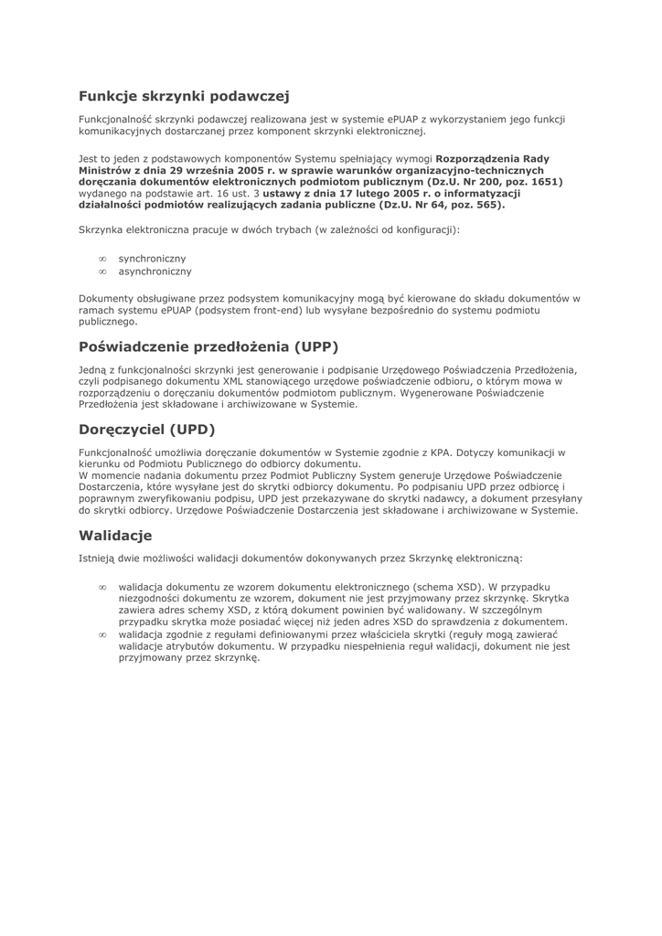 Funkcje skrzynki podawczej Funkcjonalność skrzynki podawczej realizowana jest w systemie ePUAP z wykorzystaniem jego funkcji komunikacyjnych dostarczanej przez komponent skrzynki elektronicznej. Jest to jeden z podstawowych komponentów Systemu spełniający wymogi Rozporządzenia Rady Ministrów z dnia 29 września 2005 r. w sprawie warunków organizacyjno-technicznych doręczania dokumentów elektronicznych podmiotom publicznym (Dz.U. Nr 200, poz. 1651) wydanego na podstawie art. 16 ust. 3 ustawy z dnia 17 lutego 2005 r. o informatyzacji działalności podmiotów realizujących zadania publiczne (Dz.U. Nr 64, poz. 565). Skrzynka elektroniczna pracuje w dwóch trybach (w zaleŜności od konfiguracji): • • synchroniczny asynchroniczny Dokumenty obsługiwane przez podsystem komunikacyjny mogą być kierowane do składu dokumentów w ramach systemu ePUAP (podsystem front-end) lub wysyłane bezpośrednio do systemu podmiotu publicznego. Poświadczenie przedłoŜenia (UPP) Jedną z funkcjonalności skrzynki jest generowanie i podpisanie Urzędowego Poświadczenia PrzedłoŜenia, czyli podpisanego dokumentu XML stanowiącego urzędowe poświadczenie odbioru, o którym mowa w rozporządzeniu o doręczaniu dokumentów podmiotom publicznym. Wygenerowane Poświadczenie PrzedłoŜenia jest składowane i archiwizowane w Systemie. Doręczyciel (UPD) Funkcjonalność umoŜliwia doręczanie dokumentów w Systemie zgodnie z KPA. Dotyczy komunikacji w kierunku od Podmiotu Publicznego do odbiorcy dokumentu. W momencie nadania dokumentu przez Podmiot Publiczny System generuje Urzędowe Poświadczenie Dostarczenia, które wysyłane jest do skrytki odbiorcy dokumentu. Po podpisaniu UPD przez odbiorcę i poprawnym zweryfikowaniu podpisu, UPD jest przekazywane do skrytki nadawcy, a dokument przesyłany do skrytki odbiorcy. Urzędowe Poświadczenie Dostarczenia jest składowane i archiwizowane w Systemie. Walidacje Istnieją dwie moŜliwości walidacji dokumentów dokonywanych przez Skrzynkę elektroniczną: • • walidacja dokumentu ze wzorem dokumentu elektronicznego (schema XSD). W przypadku niezgodności dokumentu ze wzorem, dokument nie jest przyjmowany przez skrzynkę. Skrytka zawiera adres schemy XSD, z którą dokument powinien być walidowany. W szczególnym przypadku skrytka moŜe posiadać więcej niŜ jeden adres XSD do sprawdzenia z dokumentem. walidacja zgodnie z regułami definiowanymi przez właściciela skrytki (reguły mogą zawierać walidacje atrybutów dokumentu. W przypadku niespełnienia reguł walidacji, dokument nie jest przyjmowany przez skrzynkę.