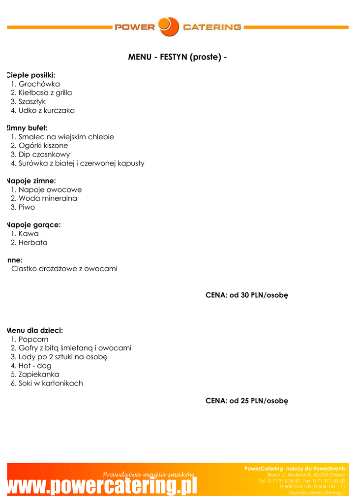 MENU - FESTYN (proste) Ciepłe posiłki: 1. Grochówka 2. Kiełbasa z grilla 3. Szaszłyk 4. Udko z kurczaka Zimny bufet: 1. Smalec na wiejskim chlebie 2. Ogórki kiszone 3. Dip czosnkowy 4. Surówka z białej i czerwonej kapusty Napoje zimne: 1. Napoje owocowe 2. Woda mineralna 3. Piwo Napoje gorące: 1. Kawa 2. Herbata Inne: Ciastko droŜdŜowe z owocami CENA: od 30 PLN/osobę Menu dla dzieci: 1. Popcorn 2. Gofry z bitą śmietaną i owocami 3. Lody po 2 sztuki na osobę 4. Hot - dog 5. Zapiekanka 6. Soki w kartonikach CENA: od 25 PLN/osobę PowerCatering naleŜy do PowerEvents Prawdziwa magia smaków www.powercatering.pl Biuro: ul. Bratków 8, 55-200 Oława Tel. 0-71 313-26-87, fax. 0-71 311-55-02 0-608-313-139, 0-604-141-171 [email protected]