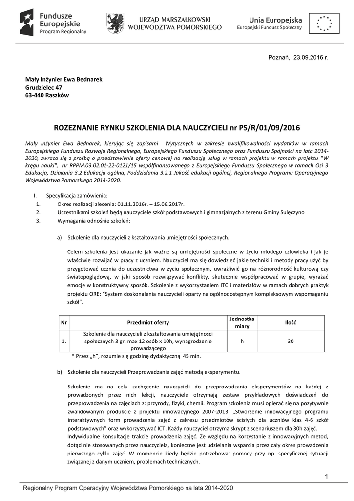 Poznań, 23.09.2016 r. Mały Inżynier Ewa Bednarek Grudzielec 47 63-440 Raszków ROZEZNANIE RYNKU SZKOLENIA DLA NAUCZYCIELI nr PS/R/01/09/2016 Mały Inżynier Ewa Bednarek, kierując się zapisami Wytycznych w zakresie kwalifikowalności wydatków w ramach Europejskiego Funduszu Rozwoju Regionalnego, Europejskiego Funduszu Społecznego oraz Funduszu Spójności na lata 20142020, zwraca się z prośbą o przedstawienie oferty cenowej na realizację usług w ramach projektu w ramach projektu "W kręgu nauki", nr RPPM.03.02.01-22-0121/15 współfinansowanego z Europejskiego Funduszu Społecznego w ramach Osi 3 Edukacja, Działania 3.2 Edukacja ogólna, Poddziałania 3.2.1 Jakość edukacji ogólnej, Regionalnego Programu Operacyjnego Województwa Pomorskiego 2014-2020. I. Specyfikacja zamówienia: 1. Okres realizacji zlecenia: 01.11.2016r. – 15.06.2017r. 2. Uczestnikami szkoleń będą nauczyciele szkół podstawowych i gimnazjalnych z terenu Gminy Sulęczyno 3. Wymagania odnośnie szkoleń: a) Szkolenie dla nauczycieli z kształtowania umiejętności społecznych. Celem szkolenia jest ukazanie jak ważne są umiejętności społeczne w życiu młodego człowieka i jak je właściwie rozwijać w pracy z uczniem. Nauczyciel ma się dowiedzieć jakie techniki i metody pracy użyć by przygotować ucznia do uczestnictwa w życiu społecznym, uwrażliwić go na różnorodność kulturową czy światopoglądową, w jaki sposób rozwiązywać konflikty, skutecznie współpracować w grupie, wyrażać emocje w konstruktywny sposób. Szkolenie z wykorzystaniem ITC i materiałów w ramach dobrych praktyk projektu ORE: “System doskonalenia nauczycieli oparty na ogólnodostępnym kompleksowym wspomaganiu szkół”. Nr 1. Przedmiot oferty Jednostka miary Ilość h 30 Szkolenie dla nauczycieli z kształtowania umiejętności społecznych 3 gr. max 12 osób x 10h, wynagrodzenie prowadzącego * Przez „h”, rozumie się godzinę dydaktyczną 45 min. b) Szkolenie dla nauczycieli Przeprowadzanie zajęć metodą eksperymentu. Szkolenie ma na celu zachęcenie nauczycieli do przeprowadzania eksperymentów na każdej z prowadzonych przez nich lekcji, nauczyciele otrzymają zestaw przykładowych doświadczeń do przeprowadzenia na zajęciach z: przyrody, fizyki, chemii. Program szkolenia musi opierać się na pozytywnie zwalidowanym produkcie z projektu innowacyjnego 2007-2013: „Stworzenie innowacyjnego programu interaktywnych form prowadzenia zajęć z zakresu przedmiotów ścisłych dla uczniów klas 4-6 szkół podstawowych” oraz wykorzystywać ICT. Każdy nauczyciel otrzyma skrypt z scenariuszem dla 30h zajęć. Indywidualne konsultacje trakcie prowadzenia zajęć. Ze względu na korzystanie z innowacyjnych metod, dotąd nie stosowanych przez nauczyciela, konieczne jest udzielania wsparcia przez cały okres prowadzenia pierwszego cyklu zajęć. W momencie kiedy będzie potrzebował pomocy przy np. specyficznej sytuacji związanej z danym uczniem, problemach technicznych. 1 Nr Przedmiot oferty Jednostka miary Ilość 2. Przeprowadzanie zajęć metodą eksperymentu cz.1 zajęcia grupowe wynagrodzenie prowadzącego, 1 gr. x 40 h h 40 3. Przeprowadzanie zajęć metodą eksperymentu Pakiet trenerski szt. 5 4. Przeprowadzanie zajęć metodą eksperymentu cz.2 zajęcia indywidualne - wynagrodzenie prowadzącego, 8 h/nauczyciela h 40 * Przez „h”, rozumie się godzinę dydaktyczną 45 min. c) Szkolenie dla nauczycieli z programowania Materiały edukacyjne muszą być starannie przygotowane i dobrane do poziomu edukacyjnego. Nauczyciele poznają podstawy środowiska SCRATCH stworzone na MIT do nauki programowania dla dzieci i młodzieży. Poznają zasady i język programowania, pojęcia z nim związane, napiszą pierwsze gry, animacje. Każdy nauczyciel otrzyma skrypt z scenariuszem dla 30h zajęć. Nr Przedmiot oferty Jednostka miary Ilość 5. Programowanie - pakiet trenerski szt. 6 * Przez „h”, rozumie się godzinę dydaktyczną 45 min. d) Szkolenie dla nauczycieli z nauczania języka angielskiego metodą techniki pamięci. Szkolenie dla nauczycieli z innowacyjnej metody nauki języka angielskiego opracowanej w oparciu o podejście multisensoryczne. Polega na intensywnym wprowadzaniu słownictwa, fraz i zdań angielskich w podobny sposób w jaki przebiega przyswajanie przez dzieci języka ojczystego. Program ma obejmować min. 24 h zajęć, zawierać dokładne treści jakie nauczyciel powinien wprowadzić na danych zajęciach (słownictwo, historyjki, gry, zabawy) ułożone w sposób chronologiczny. Dodatkowo w programie muszą się znaleźć wskazówki dotyczące oceny ucznia, motywacji, zainteresowania ucznia, techniki przypominania i wprowadzania nowych treści. Indywidualne konsultacje trakcie prowadzenia zajęć. Ze względu na korzystanie z innowacyjnych metod, dotąd nie stosowanych przez nauczyciela, konieczne jest udzielania wsparcia przez cały okres prowadzenia pierwszego cyklu zajęć. W momencie kiedy będzie potrzebował pomocy przy np. specyficznej sytuacji związanej z danym uczniem, problemach technicznych. Nr Przedmiot oferty Jednostka miary Ilość 6. Nauczanie języka angielskiego metodą techniki pamięci cz.1 zajęcia grupowe - wynagrodzenie prowadzącego, 1 gr. x 16h h 16 7. Nauczanie języka angielskiego metodą techniki pamięci – program dla nauczyciela szt. 4 8. Nauczanie języka angielskiego metodą techniki pamięci - materiały do prowadzenia zajęć szt. 4 2 Nauczanie języka angielskiego metodą techniki pamięci – cz. 2 konsultacje indywidualne 9 h/nauczyciela 9. h 36 * Przez „h”, rozumie się godzinę dydaktyczną 45 min. e) Szkolenie dla nauczycieli z nauczania języka niemieckiego metodą techniki pamięci. Szkolenie dla nauczycieli z innowacyjnej metody nauki języka niemieckiego opracowanej w oparciu o podejście multisensoryczne. Polega na intensywnym wprowadzaniu słownictwa, fraz i zdań angielskich w podobny sposób w jaki przebiega przyswajanie 