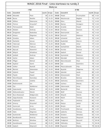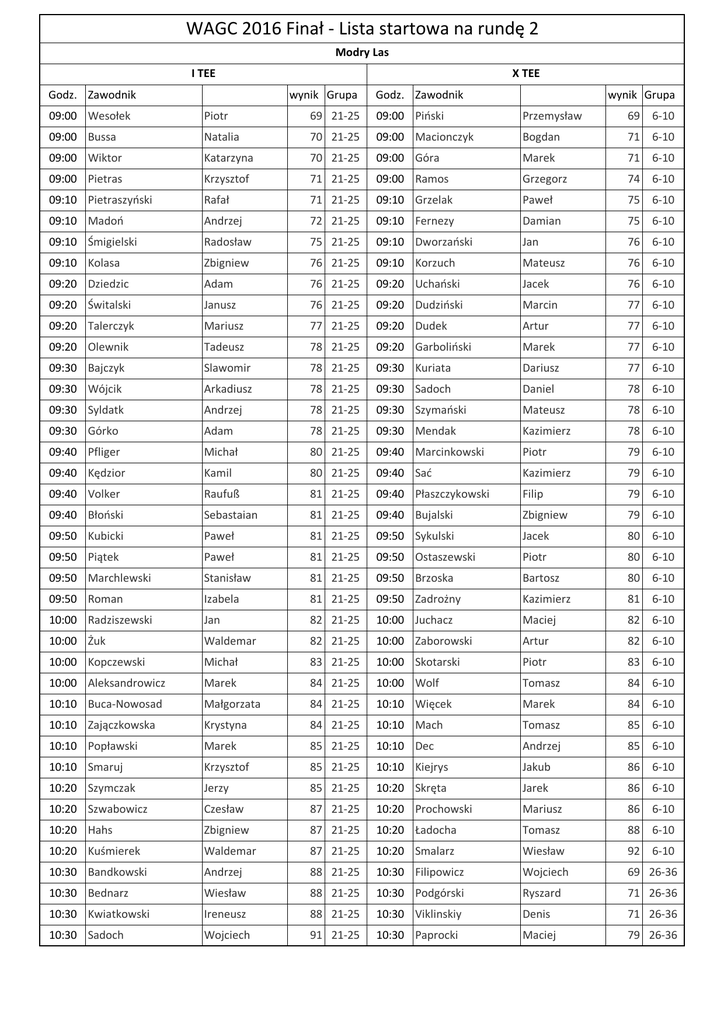 WAGC 2016 Finał - Lista startowa na rundę 2 Modry Las I TEE Godz. Zawodnik X TEE wynik Grupa Godz. Zawodnik wynik Grupa 09:00 Wesołek Piotr 69 21-25 09:00 Piński Przemysław 69 6-10 09:00 Bussa Natalia 70 21-25 09:00 Macionczyk Bogdan 71 6-10 09:00 Wiktor Katarzyna 70 21-25 09:00 Góra Marek 71 6-10 09:00 Pietras Krzysztof 71 21-25 09:00 Ramos Grzegorz 74 6-10 09:10 Pietraszyński Rafał 71 21-25 09:10 Grzelak Paweł 75 6-10 09:10 Madoń Andrzej 72 21-25 09:10 Fernezy Damian 75 6-10 09:10 Śmigielski Radosław 75 21-25 09:10 Dworzański Jan 76 6-10 09:10 Kolasa Zbigniew 76 21-25 09:10 Korzuch Mateusz 76 6-10 09:20 Dziedzic Adam 76 21-25 09:20 Uchański Jacek 76 6-10 09:20 Świtalski Janusz 76 21-25 09:20 Dudziński Marcin 77 6-10 09:20 Talerczyk Mariusz 77 21-25 09:20 Dudek Artur 77 6-10 09:20 Olewnik Tadeusz 78 21-25 09:20 Garboliński Marek 77 6-10 09:30 Bajczyk Slawomir 78 21-25 09:30 Kuriata Dariusz 77 6-10 09:30 Wójcik Arkadiusz 78 21-25 09:30 Sadoch Daniel 78 6-10 09:30 Syldatk Andrzej 78 21-25 09:30 Szymański Mateusz 78 6-10 09:30 Górko Adam 78 21-25 09:30 Mendak Kazimierz 78 6-10 09:40 Pfliger Michał 80 21-25 09:40 Marcinkowski Piotr 79 6-10 09:40 Kędzior Kamil 80 21-25 09:40 Sać Kazimierz 79 6-10 09:40 Volker Raufuß 81 21-25 09:40 Płaszczykowski Filip 79 6-10 09:40 Błoński Sebastaian 81 21-25 09:40 Bujalski Zbigniew 79 6-10 09:50 Kubicki Paweł 81 21-25 09:50 Sykulski Jacek 80 6-10 09:50 Piątek Paweł 81 21-25 09:50 Ostaszewski Piotr 80 6-10 09:50 Marchlewski Stanisław 81 21-25 09:50 Brzoska Bartosz 80 6-10 09:50 Roman Izabela 81 21-25 09:50 Zadrożny Kazimierz 81 6-10 10:00 Radziszewski Jan 82 21-25 10:00 Juchacz Maciej 82 6-10 10:00 Żuk Waldemar 82 21-25 10:00 Zaborowski Artur 82 6-10 10:00 Kopczewski Michał 83 21-25 10:00 Skotarski Piotr 83 6-10 10:00 Aleksandrowicz Marek 84 21-25 10:00 Wolf Tomasz 84 6-10 10:10 Buca-Nowosad Małgorzata 84 21-25 10:10 Więcek Marek 84 6-10 10:10 Zajączkowska Krystyna 84 21-25 10:10 Mach Tomasz 85 6-10 10:10 Popławski Marek 85 21-25 10:10 Dec Andrzej 85 6-10 10:10 Smaruj Krzysztof 85 21-25 10:10 Kiejrys Jakub 86 6-10 10:20 Szymczak Jerzy 85 21-25 10:20 Skręta Jarek 86 6-10 10:20 Szwabowicz Czesław 87 21-25 10:20 Prochowski Mariusz 86 6-10 10:20 Hahs Zbigniew 87 21-25 10:20 Ładocha Tomasz 88 6-10 10:20 Kuśmierek Waldemar 87 21-25 10:20 Smalarz Wiesław 92 6-10 10:30 Bandkowski Andrzej 88 21-25 10:30 Filipowicz Wojciech 69 26-36 10:30 Bednarz Wiesław 88 21-25 10:30 Podgórski Ryszard 71 26-36 10:30 Kwiatkowski Ireneusz 88 21-25 10:30 Viklinskiy Denis 71 26-36 10:30 Sadoch Wojciech 91 21-25 10:30 Paprocki Maciej 79 26-36 WAGC 2016 Finał - Lista startowa na rundę 2 Modry Las I TEE X TEE 10:40 Nowak-Iskra Ewa 93 21-25 10:40 Rudnicka Małgorzata 80 26-36 10:40 Walo Rafał 94 21-25 10:40 Kretowicz Przemysław 80 26-36 10:40 Pyzik Janusz 94 21-25 10:40 Malingowski Andrzej 81 26-36 10:40 Gubaro Jarosław 94 21-25 10:40 Klimko Hubert 81 26-36 10:50 Morawiak Janusz 95 21-25 10:50 Malingowska Sławomira 81 26-36 10:50 Rutkowski Hieronim 95 21-25 10:50 Ratajczyk Piotr 82 26-36 10:50 Orzechowski Wiesław 97 21-25 10:50 Libera Mariola 83 26-36 10:50 Ges Rafał 83 26-36 10:50 11:00 Trojan Zbigniew 102 21-25 11:00 Mleczak Kacper 83 26-36 11:00 Lichota Tomasz 118 21-25 11:00 Podkowa Jacek 84 26-36 11:00 Kozakiewicz Krystian 128 21-25 11:00 Freiherr Danuta 85 26-36 11:00 11:10 Ścigała Edmund 94 26-36 11:10 Dymecka Dorota 87 26-36 11:10 Malta Zenobia 95 26-36 11:10 Kęcik Mirosław 88 26-36 11:10 Hahs Elżbieta 98 26-36 11:10 Herra Marcin 89 26-36 11:10 11:20 Supel Maciej 100 26-36 11:20 Kaleta Daniel 91 26-36 11:20 Drzymalski Ryszard 103 26-36 11:20 Banaszkiewicz Tomasz 92 26-36 11:20 Kubiak Monika 105 26-36 11:20 Linzenbarth Maciej 94 26-36