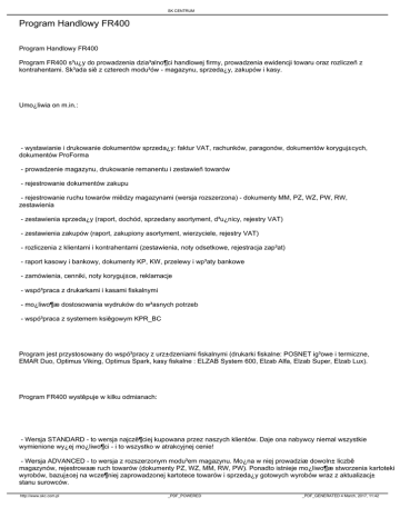 SK CENTRUM Program Handlowy FR400 Program Handlowy FR400 Program FR400 s³u¿y do prowadzenia dzia³alno¶ci handlowej firmy, prowadzenia ewidencji towaru oraz rozliczeñ z kontrahentami. Sk³ada siê z czterech modu³ów - magazynu, sprzeda¿y, zakupów i kasy. Umo¿liwia on m.in.: - wystawianie i drukowanie dokumentów sprzeda¿y: faktur VAT, rachunków, paragonów, dokumentów koryguj±cych, dokumentów ProForma - prowadzenie magazynu, drukowanie remanentu i zestawieñ towarów - rejestrowanie dokumentów zakupu - rejestrowanie ruchu towarów miêdzy magazynami (wersja rozszerzona) - dokumenty MM, PZ, WZ, PW, RW, zestawienia - zestawienia sprzeda¿y (raport, dochód, sprzedany asortyment, d³u¿nicy, rejestry VAT) - zestawienia zakupów (raport, zakupiony asortyment, wierzyciele, rejestry VAT) - rozliczenia z klientami i kontrahentami (zestawienia, noty odsetkowe, rejestracja zap³at) - raport kasowy i bankowy, dokumenty KP, KW, przelewy i wp³aty bankowe - zamówienia, cenniki, noty koryguj±ce, reklamacje - wspó³praca z drukarkami i kasami fiskalnymi - mo¿liwo¶æ dostosowania wydruków do w³asnych potrzeb - wspó³praca z systemem ksiêgowym KPR_BC Program jest przystosowany do wspó³pracy z urz±dzeniami fiskalnymi (drukarki fiskalne: POSNET ig³owe i termiczne, EMAR Duo, Optimus Viking, Optimus Spark, kasy fiskalne : ELZAB System 600, Elzab Alfa, Elzab Super, Elzab Lux). Program FR400 wystêpuje w kilku odmianach: - Wersja STANDARD - to wersja najczê¶ciej kupowana przez naszych klientów. Daje ona nabywcy niemal wszystkie wymienione wy¿ej mo¿liwo¶ci - i to wszystko w atrakcyjnej cenie! - Wersja ADVANCED - to wersja z rozszerzonym modu³em magazynu. Mo¿na w niej prowadziæ dowoln± liczbê magazynów, rejestrowaæ ruch towarów (dokumenty PZ, WZ, MM, RW, PW). Ponadto istnieje mo¿liwo¶æ stworzenia kartoteki wyrobów, bazuj±cej na wcze¶niej zaprowadzonej kartotece towarów i sprzeda¿y gotowych wyrobów wraz z aktualizacj± stanu surowców. http://www.skc.com.pl _PDF_POWERED _PDF_GENERATED 4 March, 2017, 11:42 SK CENTRUM - Wersja eksportowa - czyli wersja umo¿liwiaj±ca wystawianie dokumentów sprzeda¿y na eksport. Kartoteka magazynowa jest tu odpowiednio zmodyfikowana, umo¿liwiaj±c rejestracjê cen sprzeda¿y w walutach obcych i rejestracjê nazw towarów w jêzykach obcych. Program w ka¿dej wersji wspó³pracuje z systemem ksiêgowym KPR_BC, pozwalaj±c na automatyczne ksiêgowanie zarejestrowanych w nim dokumentów. Dziêki temu wystarczy raz wpisaæ fakturê, a znajdzie siê ona w kartotece faktur, w rejestrze sprzeda¿y VAT i w ksiêdze przychodów i rozchodów! Do pobrania FR400 polskie znaki MAZOVIA polskie znaki CP852 STANDARD - wersja standardowa STANDARD - wersja standardowa ADVANCED - wersja wielomagazynowa ADVANCED - wersja wielomagazynowa EXPORT - obs³uga sprzeda¿y eksportowej EXPORT - obs³uga sprzeda¿y eksportowej http://www.skc.com.pl _PDF_POWERED _PDF_GENERATED 4 March, 2017, 11:42