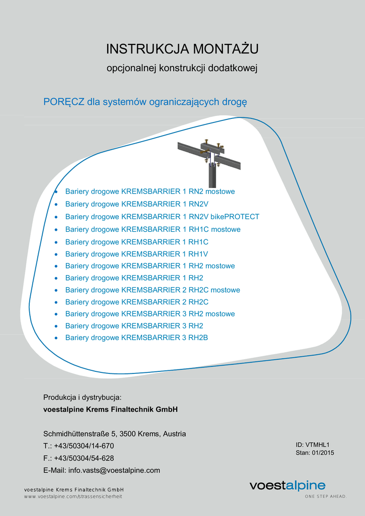 INSTRUKCJA MONTAŻU opcjonalnej konstrukcji dodatkowej PORĘCZ dla systemów ograniczających drogę · Bariery drogowe KREMSBARRIER 1 RN2 mostowe · Bariery drogowe KREMSBARRIER 1 RN2V · Bariery drogowe KREMSBARRIER 1 RN2V bikePROTECT · Bariery drogowe KREMSBARRIER 1 RH1C mostowe · Bariery drogowe KREMSBARRIER 1 RH1C · Bariery drogowe KREMSBARRIER 1 RH1V · Bariery drogowe KREMSBARRIER 1 RH2 mostowe · Bariery drogowe KREMSBARRIER 1 RH2 · Bariery drogowe KREMSBARRIER 2 RH2C mostowe · Bariery drogowe KREMSBARRIER 2 RH2C · Bariery drogowe KREMSBARRIER 3 RH2 mostowe · Bariery drogowe KREMSBARRIER 3 RH2 · Bariery drogowe KREMSBARRIER 3 RH2B Produkcja i dystrybucja: voestalpine Krems Finaltechnik GmbH Schmidhüttenstraße 5, 3500 Krems, Austria T.: +43/50304/14-670 F.: +43/50304/54-628 ID: VTMHL1 Stan: 01/2015 E-Mail: [email protected] voestalpine Krems Finaltechnik GmbH www.voestalpine.com/strassensicherheit O NE ST EP AHEAD. Instrukcja montażu poręczy Strona 2 z 13 Spis treści Wskazówki bezpieczeństwa ...................................................................................................3 Użycie zgodne z przeznaczeniem ..........................................................................................3 Opis techniczny systemów ograniczających wyposażonych w poręcz ....................................4 Transport ................................................................................................................................5 Wymagania dotyczące montażu .............................................................................................5 Montaż systemu ograniczającego drogę z konstrukcją poręczową zgodnie z instrukcją montażu .................................................................................................................................6 1. Montaż słupków poręczy ..........................................................................................8 1.1. Montaż za pomocą „łączników poręczy V140” ...................................................8 1.2. Montaż bezpośrednio na słupku ceowym od zewnątrz ......................................9 1.3. Montaż bezpośrednio na słupku ceowym od wewnątrz .....................................9 2. Montaż profilu stykowego poręczy............................................................................9 3. Montaż poręczy ......................................................................................................10 4. Montaż zamkniętej końcówki poręczy.....................................................................10 5. Elementy pasowane ...............................................................................................10 6. Momenty dokręcania złączy śrubowych .................................................................11 7. Konstrukcja dylatacji w strefie przejścia przez jezdnię ............................................11 8. Kontrola zgodności .................................................................................................12 9. Uprzątnięcie terenu robót .......................................................................................12 Naprawa systemu ograniczającego drogę ............................................................................12 Trwałość zabezpieczenia antykorozyjnego ...........................................................................13 Przeglądy i konserwacja .......................................................................................................13 Recykling / usuwanie ............................................................................................................13 Załącznik 1 .................................................................................................. Arkusz typu HL/01 Załącznik 2 .................................................................................................. Arkusz typu HL/02 Załącznik 6 .................................................................................................. Arkusz typu HL/03 Załącznik 6 .................................................................................................. Arkusz typu HL/04 Załącznik 7 ............................................................................................Wykaz części - poręcz voestalpine Krems Finaltechnik GmbH www.voestalpine.com/strassensicherheit O NE ST EP AHEAD. Instrukcja montażu poręczy Strona 3 z 13 Wskazówki bezpieczeństwa Ponieważ roboty przy realizacji systemów ograniczających drogę zaklasyfikowano generalnie jako szczególnie niebezpieczne, mogą one być wykonywane tylko pod nadzorem i kierunkiem odpowiednio wykwalifikowanych fachowców. Nadzór i kierowanie przez wyżej wym. fachowców jest warunkiem stosowania niniejszej Instrukcji montażu. Personel montażowy powinien stosować indywidualne wyposażenie ochronne zgodne z Dyrektywą WE nr 89/686/EWG oraz przepisami krajowymi. Wskazówka: Ponieważ przy montażu zabezpieczeń przed upadkiem na systemach ograniczających drogę generalnie należy zakładać podwyższone ryzyko upadku z wysokości, należy szczególnie podkreślić konieczność stosowania indywidualnego zabezpieczenia przed upadkiem (szelki bezpieczeństwa). Użycie zgodne z przeznaczeniem Zadaniem systemów ograniczających drogę jest powstrzymywanie pojazdów przed zjechaniem z drogi oraz zmiana kierunku ich ruchu w celu zminimalizowania skutków dla pasażerów i innych osób lub obiektów wymagających ochrony. Opcjonalna poręcz ma dodatkowo spełniać głównie następujące funkcje: · Wskazówka dla uczestnika ruchu, że za systemem ograniczającym drogę występuje ryzyko upadku z wysokości (w przypadku stromej skarpy itp.) · Zabezpieczenie uczestnika ruchu przed stoczeniem się w dół za systemem ograniczającym drogę przez ograniczenie możliwości wyrzucenia na drugą stronę systemu ograniczającego. · Prowadzeni
