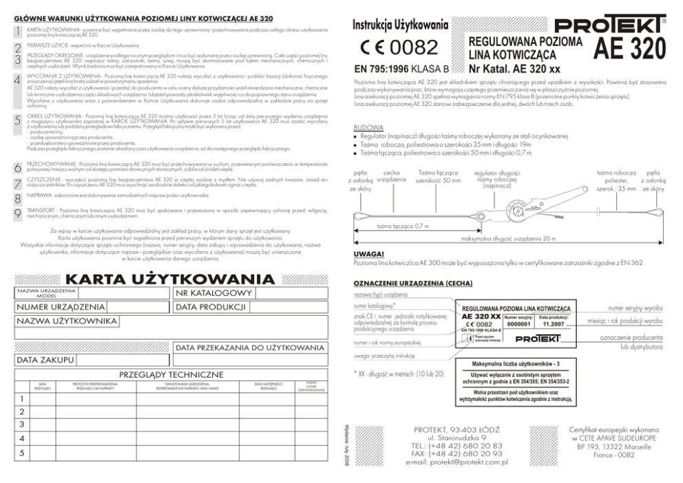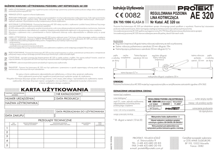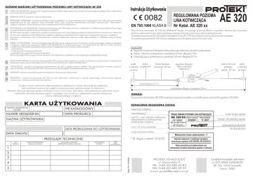 G£ÓWNE WARUNKI U¯YTKOWANIA POZIOMEJ LINY KOTWICZ¥CEJ AE 320 1 2 3 Instrukcja U¿ytkowania KARTA U¯YTKOWANIA - powinna byæ wype³niana przez osobê do tego uprawnion¹ i przechowywana podczas ca³ego okresu u¿ytkowania poziomej liny kotwicz¹cej AE 320. REGULOWANA POZIOMA LINA KOTWICZĄCA PIERWSZE U¯YCIE - wypeæniæ w Karcie U¿ytkowania PRZEGL¥DY OKRESOWE - urz¹dzenie podlega rocznym przegl¹dom i musi byæ wykonane przez osobê uprawnion¹. Ca³e czêœci poziomej liny bezpieczeñstwa AE 320: napinacz taœmy, zatrzaœniki, taœmy, szwy, musz¹ byæ skontrolowane pod k¹tem mechanicznych, chemicznych i cieplnych uszkodzeñ. Wynik badania musi byæ zarejestrowany w Karcie U¿ytkowania. 4 WYCOFANIE Z U¯YTKOWANIA - Poziom¹ linê kotwicz¹c¹ AE 320 nale¿y wycofaæ z u¿ytkowania i poddaæ kasacji (dokonaæ fizycznego zniszczenia) je¿eli lina bra³a udzia³ w powstrzymaniu spadania. AE 320 nale¿y wycofaæ z u¿ytkowania i przes³aæ do producenta w celu oceny dalszej przydatnoœci je¿eli stwierdzono mechaniczne, chemiczne lub termiczne uszkodzenia czêœci sk³adowych urz¹dzenia lubje¿eli powsta³y jakiekolwiek w¹tpliwoœci co do poprawnego stanu urz¹dzenia. Wycofana z u¿ytkowania wraz z potwierdzeniem w Kartcie U¿ytkowania dokonuje osoba odpowiedzialna w zak³adzie pracy za sprzêt ochronny. 5 OKRES U¯YTKOWANIA - Poziom¹ linê kotwicz¹c¹ AE 320 mo¿na u¿ytkowaæ przez 5 lat licz¹c od daty pierwszego wydania urz¹dzenia z magazynu u¿ytkownika zapisanej w KARCIE U¯YTKOWANIA. Po up³ywie pierwszych 5 lat u¿ytkowania AE 320 musi zostaæ wycofany z u¿ytkowania lub poddany przegladowi fabrycznemu. Przegl¹d fabryczny mo¿e byæ wykonany przez: - producenta liny; - osobê upowa¿nion¹ przez producenta; - przedsiêbiorstwo upowa¿nione przez producenta. Podczas przegl¹du fabrycznego zostanie okreœlony czas u¿ytkowania urz¹dzenia, a¿ do nastêpnego przegl¹du fabrycznego. 6 7 8 9 PRZECHOWYWANIE - Pozioma lina kotwicz¹ca AE 320 musi byæ przechowywana w suchym, przewiewnym pomieszczeniu w temperaturze pokojowej i miejscu wolnym od dostêpu promieni s³onecznych s³onecznych, z dala od Ÿróde³ ciep³a. CZYSZCZENIE - wyczyœciæ poziom¹ linê bezpieczeñstwa AE 320 w ciep³ej wodzie z myd³em. Nie u¿ywaj ¿adnych kwasów, zasad ani rozpuszczalników. Po czyszczeniu AE 320 musi wyschn¹æ swobodnie daleko od jakiegokolwiek ognia i ciep³a. Pozioma lina kotwicz¹ca AE 320 jest sk³adnikiem sprzêtu chroni¹cego przed upadkiem z wysokoœci. Powinna byæ stosowana podczas wykonywania prac, które wymagaj¹ czêstego przemieszczania siê w p³aszczyŸnie poziomej. Lina asekuracji poziomej AE 320 spe³nia wymagania normy EN 795 klasa B (przenoœne punkty kotwiczenia sprzêtu). Lina asekuracji poziomej AE 320 stanowi zabezpieczenie dla jednej, dwóch lub trzech osób. BUDOWA ! Regulator (napinacz) d³ugoœci taœmy roboczej wykonany ze stali ocynkowanej ! Taœma robocza, poliestrowa o szerokoœci 35 mm i d³ugoœci 19m ! Taœma ³¹cz¹ca, poliestrowa o szerokoœci 50 mm i d³ugoœci 0,7 m pêtla cecha z os³onk¹ urz¹dzenia ze skóry Taœma ³¹cz¹ca szerokoœæ 50 mm TRANSPORT - Pozioma lina kotwicz¹ca AE 320 musi byæ spakowana i przewo¿ona w sposób zapewniaj¹cy ochronê przed: wilgoci¹, mechanicznym, chemicznym lub innym uszkodzeniem. taœma ³¹cz¹ca 0,7 m maksymalna d³ugoœæ urz¹dzenia 20 m UWAGA! Pozioma lina kotwiczą ca AE 300 mo¿e byæ wyposa¿ona tylko w certyfikowane zatrzaœniki zgodne z EN 362. KARTA U¯YTKOWANIA OZNACZENIE URZ¥DZENIA (CECHA) NAZWA URZ¥DZENIA MODEL NR KATALOGOWY nazawa (typ) urz¹dzenia NUMER URZ¥DZENIA DATA PRODUKCJI numer katalogowy* znak CE i numer jednostki notyfikowanej odpowiedzialnej za kontrolê procesu produkcyjnego urz¹dzenia NAZWA U¯YTKOWNIKA numer i rok normy europejskiej DATA PRZEKAZANIA DO U¯YTKOWANIA PRZYCZYNY PRZEPROWADZENIA PRZEGL¥DU LUB NAPRAWY ODNOTOWANE USZKODZENIA, PRZEPROWADZONE NAPRAWY, INNE UWAGI * XX - d³ugoœæ w metrach: (10 lub 20) DATA NASTÊPNEGO PRZEGL¥DU PODPIS OSOBY ODPOWIEDZIALNEJ Data produkcji: numer seryjny wyrobu miesi¹c i rok produkcji wyrobu EN 795:1996 KLASA B oznaczenie producenta lub dystrybutora Przed użyciem przeczytaj instukcję Używać wyłącznie z osobistym sprzętem ochronnym z godnie z EN 354/355; EN 354/353-2 Wolna przestrzeń pod użytkownikiem oraz wytrzymałość punktów kotwiczenia zgodnie z instrukcją. 1 Wydanie: luty 2008 5 Numer seryjny: Maksymalna liczba użytkowników - 3 PRZEGL¥DY TECHNICZNE DATA PRZEGL¥DU REGULOWANA POZIOMA LINA KOTWICZĄCA uwaga: przeczytaj instrukcjê DATA ZAKUPU 4 taœma robocza pêtla poliester, z os³onk¹ szerok.: 35 mm ze skóry regulator d³ugoœci taœmy roboczej (napinacz) NAPRAWA - zabronione jest dokonywanie samodzielnych napraw przez u¿ytkownaika. Za wpisy w karcie u¿ytkowania odpowiedzialny jest zak³ad pracy, w którym dany sprzêt jest u¿ytkowany. Karta u¿ytkowania powinna byæ wype³niona przed pierwszym wydaniem sprzêtu do u¿ytkowania. Wszystkie informacje dotycz¹ce sprzêtu ochronnego (nazwa, numer seryjny, data zakupu i wprowadzenia do u¿ytkowania, nazwa u¿ytkownika, informacje dotycz¹ce napraw i przegl¹dów oraz wycofania z u¿ytkowania) musz¹ byæ umieszczone w karcie u¿ytkowania danego urz¹dzenia. 2 3 Nr Katal. AE 320 xx EN 795:1996 KLASA B AE 320 PROTEKT, 93-403 £ÓD ul. Starorudzka 9 TEL.: (+48 42) 680 20 83 FAX: (+48 42) 680 20 93 e-mail: [email protected] Certyfikat europejski wykonano w CETE APAVE SUDEUROPE BP 193, 13322 Marseille France - 0082 INSTALACJA POZIOMEJ LINY KOTWICZ¥CEJ DO PUNKTÓW KONSTRUKCJI STA£EJ G£ÓWNE ZASADY U¯YTKOWANIA REGULOWANEJ POZIOMEJ LINKI KOTWICZ¥CEJ AE 320 UWAGA! • Kszta³t elmentów kotwicznia konstrukcji sta³ej w miejscach mocowania nie powinien pozwoliæ na samoczynne od³¹czenie liny kotwicz¹cej AE 320 • Konstrukcyjne punkty mocowania musz¹ byæ umieszczone na tym samym poziomie i mieæ minimalne wytrzyma³oœci 24 kN dla 1 sosoby, 27 kN - dla 