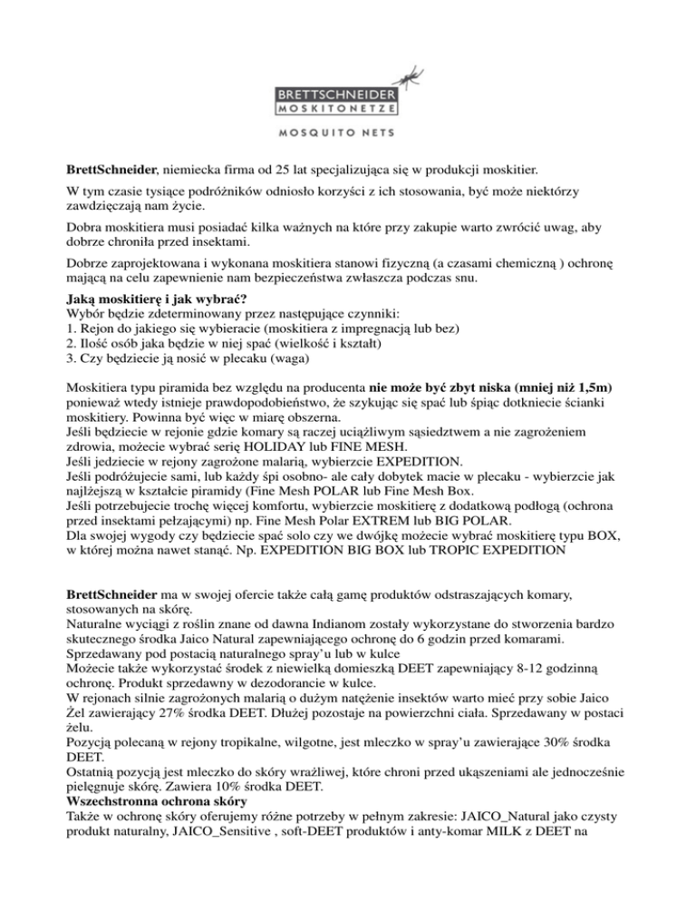 BrettSchneider, niemiecka firma od 25 lat specjalizująca się w produkcji moskitier. W tym czasie tysiące podróżników odniosło korzyści z ich stosowania, być może niektórzy zawdzięczają nam życie. Dobra moskitiera musi posiadać kilka ważnych na które przy zakupie warto zwrócić uwag, aby dobrze chroniła przed insektami. Dobrze zaprojektowana i wykonana moskitiera stanowi fizyczną (a czasami chemiczną ) ochronę mającą na celu zapewnienie nam bezpieczeństwa zwłaszcza podczas snu. Jaką moskitierę i jak wybrać? Wybór będzie zdeterminowany przez następujące czynniki: 1. Rejon do jakiego się wybieracie (moskitiera z impregnacją lub bez) 2. Ilość osób jaka będzie w niej spać (wielkość i kształt) 3. Czy będziecie ją nosić w plecaku (waga) Moskitiera typu piramida bez względu na producenta nie może być zbyt niska (mniej niż 1,5m) ponieważ wtedy istnieje prawdopodobieństwo, że szykując się spać lub śpiąc dotkniecie ścianki moskitiery. Powinna być więc w miarę obszerna. Jeśli będziecie w rejonie gdzie komary są raczej uciążliwym sąsiedztwem a nie zagrożeniem zdrowia, możecie wybrać serię HOLIDAY lub FINE MESH. Jeśli jedziecie w rejony zagrożone malarią, wybierzcie EXPEDITION. Jeśli podróżujecie sami, lub każdy śpi osobno- ale cały dobytek macie w plecaku - wybierzcie jak najlżejszą w kształcie piramidy (Fine Mesh POLAR lub Fine Mesh Box. Jeśli potrzebujecie trochę więcej komfortu, wybierzcie moskitierę z dodatkową podłogą (ochrona przed insektami pełzającymi) np. Fine Mesh Polar EXTREM lub BIG POLAR. Dla swojej wygody czy będziecie spać solo czy we dwójkę możecie wybrać moskitierę typu BOX, w której można nawet stanąć. Np. EXPEDITION BIG BOX lub TROPIC EXPEDITION BrettSchneider ma w swojej ofercie także całą gamę produktów odstraszających komary, stosowanych na skórę. Naturalne wyciągi z roślin znane od dawna Indianom zostały wykorzystane do stworzenia bardzo skutecznego środka Jaico Natural zapewniającego ochronę do 6 godzin przed komarami. Sprzedawany pod postacią naturalnego spray’u lub w kulce Możecie także wykorzystać środek z niewielką domieszką DEET zapewniający 8-12 godzinną ochronę. Produkt sprzedawny w dezodorancie w kulce. W rejonach silnie zagrożonych malarią o dużym natężenie insektów warto mieć przy sobie Jaico Żel zawierający 27% środka DEET. Dłużej pozostaje na powierzchni ciała. Sprzedawany w postaci żelu. Pozycją polecaną w rejony tropikalne, wilgotne, jest mleczko w spray’u zawierające 30% środka DEET. Ostatnią pozycją jest mleczko do skóry wrażliwej, które chroni przed ukąszeniami ale jednocześnie pielęgnuje skórę. Zawiera 10% środka DEET. Wszechstronna ochrona skóry Także w ochronę skóry oferujemy różne potrzeby w pełnym zakresie: JAICO_Natural jako czysty produkt naturalny, JAICO_Sensitive , soft-DEET produktów i anty-komar MILK z DEET na użytkownika w bogaty obszar komarów przenoszących choroby przed komarami. Komary i produktów do pielęgnacji skóry z belgijskiego specjalisty Jaico są idealnym dodatkiem do moskitiery. Stanowią one dla wszystkich na świeżym powietrzu, doskonałą ochronę przez komara orientację podczas podejścia skutecznie zakłócić. Jaico anty-komar mleka: skuteczny środek odstraszający z DEET z ekstraktów roślinnych, za wysoką wydajność przy niskim DEET procent. Instytut Tropikalny w Antwerpii został wykryty w teście porównawczym że Jaico-komara mleka z 24% zawartością DEET ma większy wpływ niż anty produktów z czasem dwa razy wyższe stężenia DEET. Połączenie olejami roślinnymi i DEET odstraszania owadów Jaico zwiększenie efekt. Szczególnie polecany dla wszystkich miłośników aktywnego wypoczynku w bogatym w komara i podróży. Skład: DEET, wyciągi roślinne, skutecznej ochrony 8-12 godzin i 6-8 godzin w roll-on. Dla aktywnych dorosłych i dzieci (powyżej 3 lat). Stosowanie biocydów bezpiecznie! Zawsze czytaj etykietę i informacji o produkcie do odczytania! Brettschnaider oferuje kilka rodzajów moskitier o podobnym kształcie, jednak scisle określonych cechach: BrettSchneider, niemiecka firma od 25 lat specjalizująca się w produkcji moskitier. W tym czasie tysiące podróżników odniosło korzyści z ich stosowania, być może niektórzy zawdzięczają nam życie. Dobra moskitiera musi posiadać kilka ważnych na które przy zakupie warto zwrócić uwag, aby dobrze chroniła przed insektami. Dobrze zaprojektowana i wykonana moskitiera stanowi fizyczną (a czasami chemiczną ) ochronę mającą na celu zapewnienie nam bezpieczeństwa zwłaszcza podczas snu. Brettschnaider oferuje kilka rodzajów moskitier o podobnym kształcie, jednak ściśle określonych cechach: SERIA HOLIDAY (Pakowana w zielone pokrowce) Może być używana w rejonach gdzie występują komary dość dużych rozmiarów. Najczęściej w domu, na działce, na kampingu, terenach leśnych. Gęstość siatki to 210-230 oczek na cal kwadratowy. Wykonane w 100% z poliestru. Chroni przed dużymi komarami z gatunku Anopheles, Culex, Aedes Seria FINE MESH. (pakowana w granatowe pokrowce) Bardzo drobne oczka chronią przed małymi gatunkami komarów, meszkami, muszkami występującymi na południu, w tropikach, ale także w Skandynawii i północnych obszarach Europy. Bardzo dobrze zatrzymuje obok znanych komarów Culex, także (gatunki przenoszące malarię, gorączkę denga, żółtą febrę, Chicungunya; Anopheles i Aedes). Trzyma z dala moskity z rodziny Phlebotomidae (leiszmanioza) i muszki (filariozy). Cienka siateczka z poliamidu o gęstości ponad 800 oczek na cal kwadratowy. Idealna w Tropiki, podróże po Skandynawii, i północnej Europie. Cienka przędza zapewnia maksymalną przewiewność. SERIA EXPEDITION (pakowana w czerwone pokrowce) W szczególnie zagrożonych malarią terenach warto zastosować moskitierę ze środkiem insektobójczym opracowanym przez firmę BAYER.