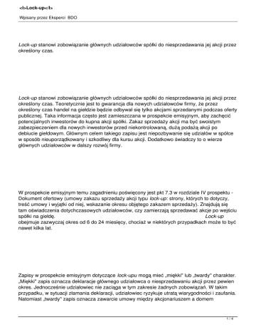 <I>Lock-up</I> Wpisany przez Eksperci BDO Lock-up stanowi zobowiązanie głównych udziałowców spółki do niesprzedawania jej akcji przez określony czas. Lock-up stanowi zobowiązanie głównych udziałowców spółki do niesprzedawania jej akcji przez określony czas. Teoretycznie jest to gwarancja dla nowych udziałowców firmy, że przez określony czas handel na giełdzie będzie odbywał się tylko akcjami sprzedanymi podczas oferty publicznej. Taka informacja często jest zamieszczana w prospekcie emisyjnym, aby zachęcić potencjalnych inwestorów do kupna akcji spółki. Zakaz sprzedaży akcji ma być swoistym zabezpieczeniem dla nowych inwestorów przed niekontrolowaną, dużą podażą akcji po debiucie giełdowym. Głównym celem takiego zapisu jest niepozbywanie się udziałów w spółce w sposób nieuporządkowany i szkodliwy dla kursu akcji. Dodatkowo świadczy to o wierze głównych udziałowców w dalszy rozwój firmy. W prospekcie emisyjnym temu zagadnieniu poświęcony jest pkt 7.3 w rozdziale IV prospektu Dokument ofertowy (umowy zakazu sprzedaży akcji typu lock-up: strony, których to dotyczy, treść umowy i wyjątki od niej, wskazanie okresu objętego zakazem sprzedaży). Znajdują się tam oświadczenia dotychczasowych udziałowców, czy zamierzają sprzedawać akcje po wejściu spółki na giełdę. Lock-up obejmuje zazwyczaj okres od 6 do 24 miesięcy, chociaż w niektórych przypadkach może to być nawet kilka lat. Zapisy w prospekcie emisyjnym dotyczące lock-upu mogą mieć „miękki" lub „twardy" charakter. „Miękki" zapis oznacza deklaracje głównego udziałowca o niesprzedawaniu akcji przez pewien okres. Jednocześnie udziałowiec nie zaciąga w tym zakresie żadnych zobowiązań. W takim przypadku, w sytuacji złamania deklaracji, udziałowiec ryzykuje utratą wiarygodności i zaufania. Natomiast „twardy" zapis oznacza zawarcie umowy między akcjonariuszem a domem 1/4 <I>Lock-up</I> Wpisany przez Eksperci BDO maklerskim oferującym akcje spółki. W tej sytuacji udziałowiec może sprzedać akcje spółki jedynie pod warunkiem uzyskania zgody biura maklerskiego. Uzyskanie takiej zgody zależy zazwyczaj od popytu zgłaszanego przez inwestorów instytucjonalnych na akcje spółki. W takiej sytuacji wśród zainteresowanych inwestorów budowana jest księga popytu, a transakcje zawierane są poza sesją giełdową (w transakcjach pakietowych). W ten sposób nie mają one bezpośredniego wpływu na notowania spółki na giełdzie. Jednym z rodzajów lock-upu może być zobowiązanie się głównych akcjonariuszy do niesprzedawania akcji pod pewnymi warunkami. Na przykład fundusze kontrolujące serwis internetowy bankier.pl zobowiązały się do niesprzedawania akcji po cenie niższej niż emisyjna (7,5 zł), powiększonej o 15%. Identycznie sformułowana była umowa zakazu sprzedaży udziałów w spółce Gino Rossi. Lock-up spółki Petrolinvest, która zadebiutowała na giełdzie w 2007 roku, oprócz tzw. „twardego" zapisu obejmującego zakaz sprzedaży akcji przez obecnych akcjonariuszy w terminie 12 miesięcy od dnia zamknięcia oferty, zawierał również zobowiązanie spółki do niewyemitowania akcji oraz do niepodawania do publicznej wiadomości zamiaru wyemitowania akcji bez zgody subemitenta oraz oferującego przez okres 6 miesięcy od dnia zamknięcia oferty publicznej. Wśród 38 spółek, które zadebiutowały na giełdzie w 2006 roku, 30 zamieściło w prospekcie emisyjnym informacje o lock-upie. Natomiast prospekty emisyjne firm Cash Flow, Sfinks, CEZ, CEDC, Ruch, Unima2000, Asseco Slovakia oraz Interferie nie zawierają informacji w tym zakresie. Spółki Mispol, One-2-One, Netmedia, Żurawie Wieżowe oraz Cinema City złożyły oświadczenie („miękki" charakter zapisu) o zamiarze niesprzedawania akcji przez głównych 2/4 <I>Lock-up</I> Wpisany przez Eksperci BDO udziałowców na giełdzie w ciągu najbliższych 6 lub 12 miesięcy. Z kolei 25 spółek spośród 38 debiutujących w 2006 roku podpisało umowę z oferującym o zakazie sprzedawania akcji przez głównych udziałowców (tzw. „twardy" zapis). Ponadto spółki Qumak-Sekom i eCard zdecydowały się na zamieszczenie w prospekcie emisyjnym zapisu, na podstawie którego udziałowcy, w przypadku naruszenia umowy lock-upu, zobowiązani są do wypłacenia inwestorom, którzy kupili akcje w ofercie publicznej i nie sprzedali ich w czasie obowiązywania blokady, różnicy między ceną akcji w dniu poprzedzającym naruszenie postanowień umowy, a ceną tych akcji w dniu wygaśnięcia blokady. Przykłady wcześniejszej sprzedaży akcji Największy akcjonariusz Żurawi Wieżowych - Europejski Fundusz Hipoteczny mimo deklaracji w prospekcie emisyjnym postanowił zrealizować zyski z inwestycji na 2 tygodnie przed upływem okresu obowiązywania deklaracji. Wytłumaczeniem zachowania się funduszu może być cena akcji - spółka sprzedawała je w ofercie publicznej po 7 zł, natomiast fundusz zaczął realizować zyski, gdy cena papierów na giełdzie przekroczyła 50 zł. Prospekt emisyjny spółki zawierał zapis, że ograniczenia w sprzedaży akcji nie mają charakteru umowy, a są oświadczeniem woli o charakterze deklaratywnym. Jak oświadczył rzecznik Komisji Nadzoru Finansowego, „zapis w prospekcie emisyjnym Żurawi Wieżowych był bardzo «miękki», dlatego nie można firmie nic zarzucić". Lecz zdaniem analityków takie postępowanie spółek będzie brane pod uwagę przy następnych emisjach akcji. 3/4 <I>Lock-up</I> Wpisany przez Eksperci BDO Główny akcjonariusz Ambry, która zadebiutowała na GPW w czerwcu 2005 roku, pozbył się w lutym 2006 roku w transakcjach pakietowych około 14% akcji firmy (posiadane akcje były objęte dwuletnią blokadą). Akcjonariusz jednak uzyskał zgodę domu maklerskiego wprowadzającego spółkę na giełdę. Taką zgodę również uzyskały osoby fizyczne, akcjonariusze Mispolu, która zadebiutowała na GPW w 2006 roku. Uwa