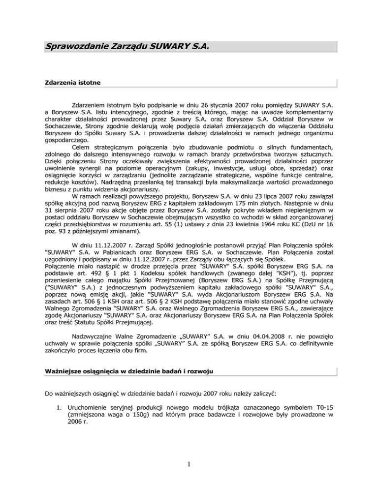 Połączenie miało nastąpić w drodze przejęcia przez "SUWARY" S.A. spółki Boryszew ERG S.A. na