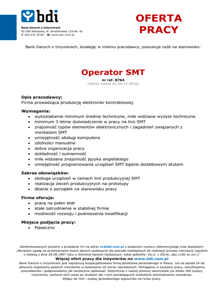 OFERTA PRACY Bank Danych o Inżynierach 02-304 Warszawa, Al. Jerozolimskie 133 lok. 42 T 022 572 78 00 W www.bdi.com.pl Bank Danych o Inżynierach, działając w imieniu pracodawcy, poszukuje osób na stanowisko: Operator SMT nr ref. 8764 (oferta ważna do 24.12.2016) Opis pracodawcy: Firma prowadząca produkcję elektroniki kontraktowej. Wymagania: wykształcenie minimum średnie techniczne, mile widziane wyższe techniczne minimum 3 letnie doświadczenie w pracy na linii SMT znajomość typów elementów elektronicznych i zagadnień związanych z montażem SMT umiejętność obsługi komputera zdolności manualne dobra organizacja pracy dokładność i sumienność mile widziana znajomość języka angielskiego umiejętność programowania urządzeń SMT będzie dodatkowym atutem Zakres obowiązków: obsługa urządzeń w ramach linii produkcyjnej SMT realizacja zleceń produkcyjnych na prototypy dbanie o porządek na stanowisku pracy Firma oferuje: pracę na pełen etat stałe zatrudnienie w stabilnej firmie możliwość rozwoju i podnoszenia kwalifikacji Miejsce podjęcia pracy: Piaseczno Zainteresowanych prosimy o przesłanie CV na adres [email protected] z podaniem numeru referencyjnego oraz dopiskiem: „Wyrażam zgodę na przetwarzanie moich danych osobowych dla potrzeb niezbędnych do realizacji procesu rekrutacji (zgodnie z Ustawą z dnia 29.08.1997 roku o Ochronie Danych Osobowych; tekst jednolity: Dz.U. z 2014r., poz.1182 ze zm.).” Więcej ofert pracy dla inżynierów na www.bdi.com.pl Bank Danych o Inżynierach jest najstarszą wyspecjalizowana firmą doradztwa personalnego w Polsce. Już od ponad 24 lat aktywnie wspieramy polskich inżynierów w budowaniu ich karier zawodowych. Pomagamy w szukaniu pracy, weryfikujemy pracodawców i podpowiadamy jak skutecznie aplikować. Dotychczas z naszej pomocy skorzystało już blisko 200 tysięcy inżynierów, zarówno tych zaraz po studiach jak i tych posiadających wieloletnie doświadczenie zawodowe. Dołącz do nich i zyskaj sprawdzonego sojusznika na rynku pracy.