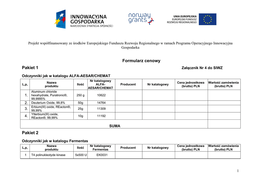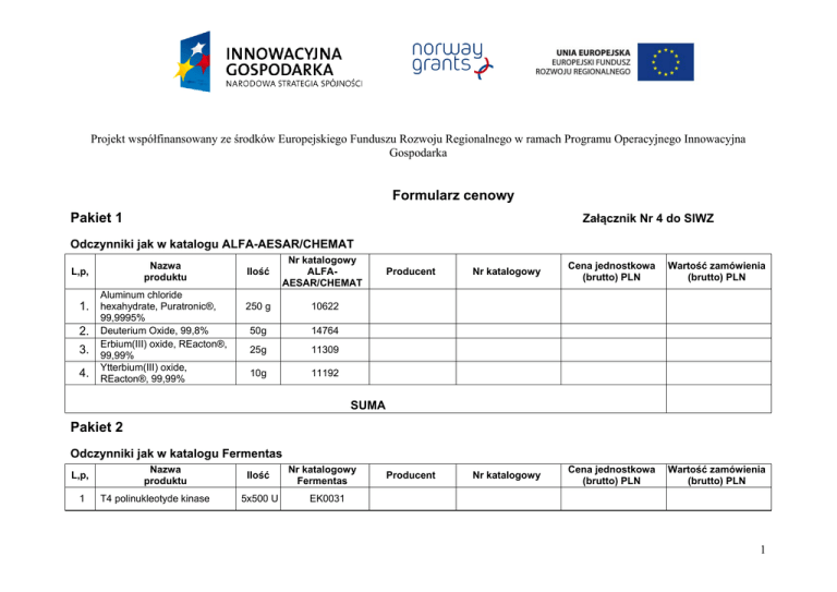 Projekt współfinansowany ze środków Europejskiego Funduszu Rozwoju Regionalnego w ramach Programu Operacyjnego Innowacyjna Gospodarka Formularz cenowy Pakiet 1 Załącznik Nr 4 do SIWZ Odczynniki jak w katalogu ALFA-AESAR/CHEMAT Nazwa produktu L,p, Ilość Nr katalogowy ALFAAESAR/CHEMAT 250 g 10622 50g 14764 25g 11309 10g 11192 Producent Nr katalogowy Cena jednostkowa (brutto) PLN Wartość zamówienia (brutto) PLN Producent Nr katalogowy Cena jednostkowa (brutto) PLN Wartość zamówienia (brutto) PLN Aluminum chloride 1. hexahydrate, Puratronic®, 2. 3. 4. 99,9995% Deuterium Oxide, 99,8% Erbium(III) oxide, REacton®, 99,99% Ytterbium(III) oxide, REacton®, 99,99% SUMA Pakiet 2 Odczynniki jak w katalogu Fermentas L,p, 1 Nazwa produktu T4 polinukleotyde kinase Ilość 5x500 U Nr katalogowy Fermentas EK0031 1 Pakiet 3 Odczynniki jak w katalogu Hartmann Analytic ( czas dostawy – 2 dni ) Nazwa produktu L,p, 1. [gamma-P32]ATP, 37 MBq (100μCi) Ilość Nr katalogowy Hartmann Analytic 6x10 µl Producent Nr katalogowy Cena jednostkowa (brutto) PLN Wartość zamówienia (brutto) PLN Producent Nr katalogowy Cena jednostkowa (brutto) PLN Wartość zamówienia (brutto) PLN SCP-301 Pakiet 4 Odczynniki jak w katalogu Sigma-Aldrich L,p, 1. 2. 3. 4. 5. 6. 7. 8. 9. 10. 11. 12. 13. 14. 15. 16. 17. 18. Nazwa produktu Agarose, Type Type IA Agarose, Type VII AgNO3 Ammonium persulfate Antibiotic-Antimycotic stabilized APS Bisbenzamide – Hoechst 33258 Bleomycyna BrdU BSA frakcja V Camptothecin Cytochalasin B DEANO(Diethylamine NONOate sodium salt hydrate) DL-Dithiothreitol DNA celuloza DNA from calf thymus Ester calceiny HEPES Ilość 2 op 2 op 25 g 1 op. Nr katalogowy Sigma-Aldrich A0169-10g A4018-10g 20,913-9 A3678-25G 5x20ml A5955 2x25g A9164 2x1g B2883-1G 2x 1mg 1g 1x50g 1x100mg 3x10µg 15361 B5002 A9418 C-9911 C6762 3x25mg D184-25mg 2 op, 5g 2x100mg 2 x 100µl 3 op D9779-1G D8515-5g D1501 C1359 H4034-500G 2 19. 20. 21. 22. 23. 24. 25. 26. 27. 28. 29. 30. 31. 32. 33. 34. 35. Imidazol Kalceina Kwas askorbinowy Kwas borowy Kwas tiobarbiturowy Lizozym MTT Thiazolyl Blue Tetrazolium Bromide Neutral Red Odczynnik Giemsy Oranż akrydyny Parafilm Phenylmethanesulfonyl fluoride Phenylmethanesulfonyl fluoride (PMSF) Protease Inhibitor Cocktail1BTL Sodium deoxycholate William’s medium E L-glutamine 36. DMEM-high glucose 37. Nutrient mixture F-12 ham 38. Pożywka RPMI 1640 39. TEMED In Vitro Toxicology Assay Kit, 40. Lactic Dehydrogenase based in Vitro Toxicology Assay Kit, 41. Resazurin based In Vitro Toxicology Assay Kit, 42. Sulforhodamine B based 4x25 g 5g 100 g 1 kg 1x250g 1x5g I5513 C0875-5g 3x10g M2128-10g 3x 5g 2l 1g 2 op. N4638 GS1L-1L 318337 P7668 2 op. P7626- 1G 5g P7626-5g 1 op. P2714 100g 60x500ml 2x100g 5x (6x500ml) 40x500 ml 5x (6x500ml) 1x 100ml D6750-100g W4128 G 8540 1 op. Tox-7 1 op. Tox-8 1 op. Tox-6 A5960 B6768 88481 L6876 D5796 N6658 T2397 T7024 SUMA 3 Pakiet 5 Odczynniki jak w katalogu Vector Laboratories Nazwa produktu L,p, DAPI mounting medium with 1. vectashield Ilość Nr katalogowy Vector Laboratories 4x10 ml H-1200 Producent Nr katalogowy Cena jednostkowa (brutto) PLN Wartość zamówienia (brutto) PLN Producent Nr katalogowy Cena jednostkowa (brutto) PLN Wartość zamówienia (brutto) PLN Cena jednostkowa (brutto) PLN Wartość zamówienia (brutto) PLN Cena jednostkowa (brutto) PLN Wartość zamówienia (brutto) PLN Pakiet 6 Odczynniki jak w katalogu Zeiss L,p, 1. Nazwa produktu Olejek imersyjny Immersol Ilość 200 ml Nr katalogowy Zeiss 518F Pakiet 7 Odczynniki jak w katalogu A&A Biotechnology L,p, 1. 2. Nazwa produktu Genomic Mini (50) Plasmid Mini (250) Ilość 2 1 Nr katalogowy A&A Biotechnology 116-50 020-250 Producent Nr katalogowy SUMA Pakiet 8 Odczynniki jak w katalogu Applied Biosystems L,p, 1. 2. 3. Nazwa produktu siPORT™ NeoFX™ Transfection Agent High Capacity cDNA Reverse Transcription Kit + RNAse Inhibitor TaqMan Gene Expression Ilość Nr katalogowy Applied Biosystems 1 AM4511 2 4374966 2 4369514 Producent Nr katalogowy 4 4. 5. 6. 7. Master Mix 2-pack TaqMan Gene Expression Assays, Inventoried TaqMan Gene Expression Assays, Made to order TaqMan Gene Expression Cells-to-CT Kit Rat GAPD (GAPDH) Endogenous Control (VIC/MGB Probe, Primer Limited) 10 4331182 5 4351372 1 AM1728 1 4352338E SUMA Pakiet 9 Odczynniki jak w katalogu BD Pharmingen L,p, 1. Nazwa produktu FITC Annexin V Apoptosis Detection Kit II Ilość Nr katalogowy BD Pharmingen 2x op/100 testów Producent Nr katalogowy Cena jednostkowa (brutto) PLN Wartość zamówienia (brutto) PLN 556570 Pakiet 10 Odczynniki jak w katalogu BIoVision Inc. L,p, 1. 2. Nazwa produktu Zestaw do oznaczania cholesterolu Total Antioxidant Capacity (TAC) Assay Kit Ilość Nr katalogowy BIoVision Inc. 2 K603-100 1 K274-100 Producent Nr katalogowy Cena jednostkowa (brutto) PLN Wartość zamówienia (brutto) PLN SUMA 5 Pakiet 11 Odczynniki jak w katalogu Cell Biolabs, Inc. L,p, 1. 2. 3. 4. 5. 6. 7. 8. 9. 10. 11. 12. 13. Nazwa produktu AOPP-HSA, 50 μL OxiSelect™ 8iso-Prostaglandin F2a Activity Assay Kit, 96 Assays OxiSelect™ Advanced Glycation End Products (AGE) ELISA. 96 Assays OxiSelect™ AOPP Assay Kit (200 assays) OxiSelect™ HNE-His Adduct ELISA Kit (96 assays) OxiSelect™ HORAC Activity Assay Kit. 192 assays OxiSelect™ MDA Adduct ELISA Kit (96 assays), 1 kit OxiSelect™ Nitrotyrosine ELISA Kit (96 Tests) OxiSelect™ ORAC Activity Assay Kit, 192 assays OxiSelect™ Protein Carbonyl ELISA Kit (96 tests) OxiSelect™ ROS Assay Kit, 96 Assays OxiSelect™ TBARS Assay Kit (MDA Quantitation, 200 assays) Protein Oxidation Immunoblot Control, 100 μg Ilość Nr katalogowy Cell Biolabs. Inc. 50 µl STA-319 2 STA-337 1 STA-317 1 STA-318 1 STA-334 1 STA-346 1 STA-332 1 STA-305 1 STA-345 1 STA-310 1 STA-342 1 STA-330 100 µg STA-309 Producent Nr katalogowy Cena jednostkowa (brutto) PLN Wartość zamówienia (brutto) PLN SUMA 6 Pakiet 12 Odczynniki jak w katalogu GE Heath Care/Amersham Nazwa produktu L,p, 1. Odczynnik ECL d