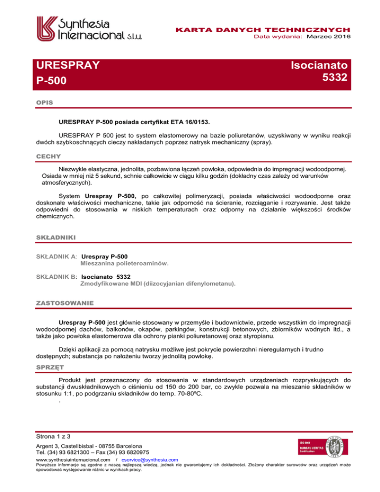 KARTA DANYCH TECHNICZNYCH Data wydania: Marzec 2016 URESPRAY P-500 Isocianato 5332 OPIS URESPRAY P-500 posiada certyfikat ETA 16/0153. URESPRAY P 500 jest to system elastomerowy na bazie poliuretanów, uzyskiwany w wyniku reakcji dwóch szybkoschnących cieczy nakładanych poprzez natrysk mechaniczny (spray). CECHY Niezwykle elastyczna, jednolita, pozbawiona łączeń powłoka, odpowiednia do impregnacji wodoodpornej. Osiada w mniej niż 5 sekund, schnie całkowicie w ciągu kilku godzin (dokładny czas zależy od warunków atmosferycznych). System Urespray P-500, po całkowitej polimeryzacji, posiada właściwości wodoodporne oraz doskonałe właściwości mechaniczne, takie jak odporność na ścieranie, rozciąganie i rozrywanie. Jest także odpowiedni do stosowania w niskich temperaturach oraz odporny na działanie większości środków chemicznych. SKŁADNIKI SKŁADNIK A: Urespray P-500 Mieszanina polieteroaminów. SKŁADNIK B: Isocianato 5332 Zmodyfikowane MDI (diizocyjanian difenylometanu). ZASTOSOWANIE Urespray P-500 jest głównie stosowany w przemyśle i budownictwie, przede wszystkim do impregnacji wodoodpornej dachów, balkonów, okapów, parkingów, konstrukcji betonowych, zbiorników wodnych itd., a także jako powłoka elastomerowa dla ochrony pianki poliuretanowej oraz styropianu. Dzięki aplikacji za pomocą natrysku możliwe jest pokrycie powierzchni nieregularnych i trudno dostępnych; substancja po nałożeniu tworzy jednolitą powłokę. SPRZĘT Produkt jest przeznaczony do stosowania w standardowych urządzeniach rozpryskujących do substancji dwuskładnikowych o ciśnieniu od 150 do 200 bar, co zwykle pozwala na mieszanie składników w stosunku 1:1, po podgrzaniu składników do temp. 70-80ºC. . Strona 1 z 3 Argent 3, Castellbisbal - 08755 Barcelona Tel. (34) 93 6821300 – Fax (34) 93 6820975 www.synthesiainternacional.com / [email protected] Powyższe informacje są zgodne z naszą najlepszą wiedzą, jednak nie gwarantujemy ich dokładności. Złożony charakter surowców oraz urządzeń może spowodować występowanie różnic w wynikach pracy. KARTA DANYCH TECHNICZNYCH Data wydania: Marzec 2016 URESPRAY P-500 Isocianato 5332 WARUNKI UŻYTKOWANIA Powierzchnie, na które nakładany będzie produkt, powinny być czyste, suche, odtłuszczone i wolne od kurzu. Temperatura powinna zawierać się w przedziale -10-70 ºC, a wilgotność względna poniżej 75%. Powierzchnię należy najpierw wypiaskować, zwłaszcza jeśli chcemy, by produkt został nałożony na idealnie płaską i gładką powierzchnię. Właściwości Urespray P-500 sprawiają, że substancja ta przylega do każdej powierzchni. Jednakże, jeśli nakładamy produkt na trudniejsze powierzchnie, należy najpierw nałożyć podkład celem polepszenia przyczepności. Prawidłowa aplikacja: pierwsza warstwa powinna być bardzo cienka. Kolejna warstwa (równie cienka) może zostać nałożona zaraz po wyschnięciu pierwszej, “na krzyż”. Aby wodoodporne właściwości produktu zostały zachowane, powierzchnia powinna być także wolna od skondensowanej wilgoci, ponieważ może ona prowadzić do powstawania pęcherzyków powietrza; cienka pierwsza warstwa pozwoli wykryć obecność wilgoci na podłożu, ponieważ wówczas pojawią się pęcherzyki powietrza. Jeśli takie zjawisko wystąpi, pierwszą warstwę należy usunąć i nałożyć ponownie po całkowitym wyschnięciu powierzchni. Urespray P-500 można wymieszać z pigmentami w różnych kolorach, dodając je “na miejscu” w formie odpowiedniego Urespray Paste do składnika A w ilości 5 %. Składnik A z czasem ma tendencję do rozwarstwiania się, dlatego też należy wymieszać go do uzyskania jednorodnej substancji, zwłaszcza, jeśli dodany został pigment. CHARAKTERYSTYKA SKŁADNIKÓW Cecha Jednostka 5332 P-500 g/ cm3 1.11 1.02 cPs 765 (25ºC) 550 (22ºC) % 15 -- Ciężar właściwy 25ºC Lepkość Zawartość NCO SPECYFIKACJA SYSTEMU Typowa laboratoryjna analiza specyfikacji w wyżej podanym stosunku mieszania, przy 22oC, zgodnie z własną normą (MAN - S01). Stosunek mieszania A / B: 100 / 100 objętości. Cecha Jednostka P-500 Czas żelowania s 3-5 Czas schnięcia powierzchni (tack free time) s 6 - 10 g/l 900 - 1100 Gęstość objętościowa Strona 2 z 3 Argent 3, Castellbisbal - 08755 Barcelona Tel. (34) 93 6821300 – Fax (34) 93 6820975 www.synthesiainternacional.com / [email protected] Powyższe informacje są zgodne z naszą najlepszą wiedzą, jednak nie gwarantujemy ich dokładności. Złożony charakter surowców oraz urządzeń może spowodować występowanie różnic w wynikach pracy. KARTA DANYCH TECHNICZNYCH Data wydania: Marzec 2016 URESPRAY P-500 Isocianato 5332 SPECYFIKACJE PRODUKTU Cechy Średnia gęstość Jednostka P-500 UNE EN 1602 kg/m³ 1000 Odporność na rozciąganie UNE 53205 N/mm2 % 23 450 Odporność na rozrywanie UNE 53516 N/mm 92 Twardość wg skali Shore’a DIN 53505 ShD 47 mg 110 Odporność na ścieranie metodą Tabera DIN 53516 ZALECENIA DOTYCZĄCE PRZECHOWYWANIA Wszystkie składniki są higroskopijne, zatem należy je przechowywać w beczkach lub hermetycznych pojemnikach. Temperatura przechowywania powinna zawierać się pomiędzy +15ºC a +25ºC. Niższe temperatury mogą prowadzić do krystalizacji izocyjanianu, natomiast wyższe temperatury mogą wywołać zmiany w składniku A, dlatego należy ich unikać. Jeśli składnik A (Urespray P-500) jest prawidłowo przechowywany, jego okres przydatności to 12 miesięcy; w przypadku składnika B (Isocianato 5332) jest to 9 miesięcy. ZALECENIA DOTYCZĄCE BEZPIECZEŃSTWA Jeśli stosuje się go zgodnie z przeznaczeniem, system nie stwarza znaczącego ryzyka dla użytkownika. Należy unikać kontaktu substancji ze skórą i oczami. W przypadku kontaktu z oczami należy dokładnie przemyć je wodą. Instrukcje zawarte w Karcie danych dot. bezpieczeństwa muszą być przestrzegane podczas produkcji oraz stosowania systemu. Więcej informacji można znale