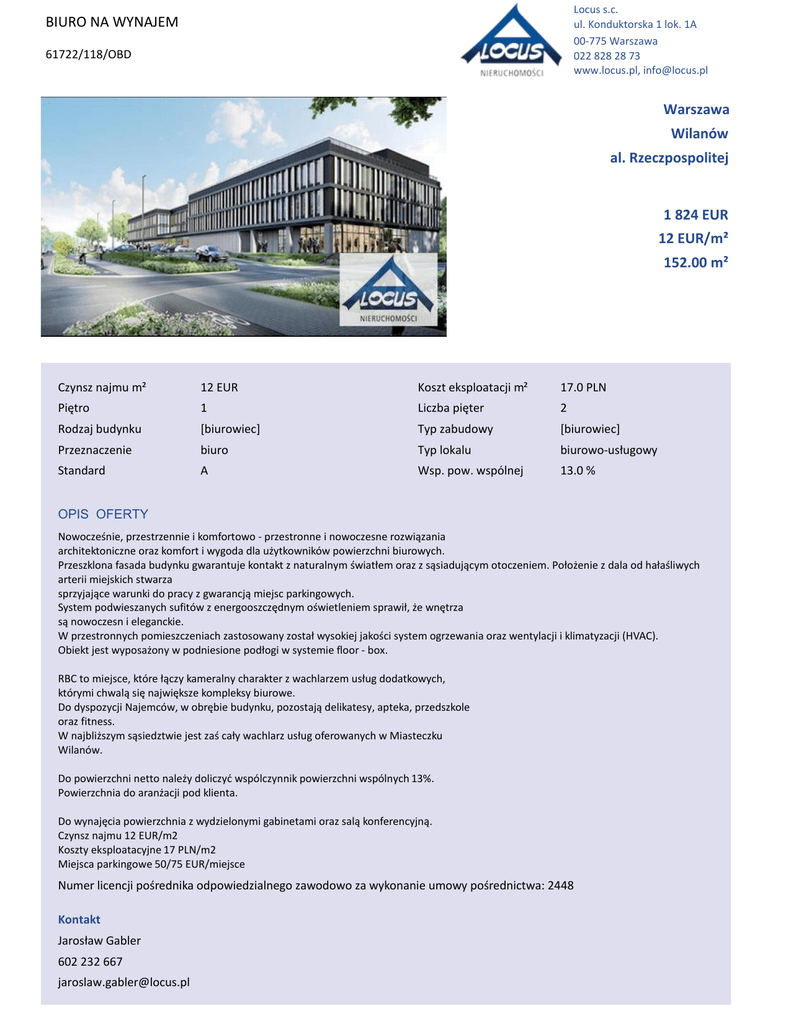 Locus s.c. ul. Konduktorska 1 lok. 1A 00-775 Warszawa 022 828 28 73 www.locus.pl, [email protected] BIURO NA WYNAJEM 61722/118/OBD Warszawa Wilanów al. Rzeczpospolitej 1 824 EUR 12 EUR/m² 152.00 m² Czynsz najmu m² 12 EUR Koszt eksploatacji m² 17.0 PLN WŝħƚƌŽ 1 >ŝĐnjďĂƉŝħƚĞƌ 2 Rodzaj budynku [biurowiec] Typ zabudowy [biurowiec] Przeznaczenie biuro Typ lokalu ďŝƵƌŽǁŽͲƵƐųƵŐŽǁLJ Standard A Wsp. pow. wspólnej 13.0 % OPIS OFERTY EŽǁŽĐnjĞƑŶŝĞ͕ƉƌnjĞƐƚƌnjĞŶŶŝĞŝŬŽŵĨŽƌƚŽǁŽͲƉƌnjĞƐƚƌŽŶŶĞŝŶŽǁŽĐnjĞƐŶĞƌŽnjǁŝČnjĂŶŝĂ ĂƌĐŚŝƚĞŬƚŽŶŝĐnjŶĞŽƌĂnjŬŽŵĨŽƌƚŝǁLJŐŽĚĂĚůĂƵǏLJƚŬŽǁŶŝŬſǁƉŽǁŝĞƌnjĐŚŶŝďŝƵƌŽǁLJĐŚ͘ WƌnjĞƐnjŬůŽŶĂĨĂƐĂĚĂďƵĚLJŶŬƵŐǁĂƌĂŶƚƵũĞŬŽŶƚĂŬƚnjŶĂƚƵƌĂůŶLJŵƑǁŝĂƚųĞŵŽƌĂnjnjƐČƐŝĂĚƵũČĐLJŵŽƚŽĐnjĞŶŝĞŵ͘WŽųŽǏĞŶŝĞnjĚĂůĂŽĚŚĂųĂƑůŝǁLJĐŚ arterii miejskich stwarza ƐƉƌnjLJũĂũČĐĞǁĂƌƵŶŬŝĚŽƉƌĂĐLJnjŐǁĂƌĂŶĐũČŵŝĞũƐĐƉĂƌŬŝŶŐŽǁLJĐŚ͘ ^LJƐƚĞŵƉŽĚǁŝĞƐnjĂŶLJĐŚƐƵĨŝƚſǁnjĞŶĞƌŐŽŽƐnjĐnjħĚŶLJŵŽƑǁŝĞƚůĞŶŝĞŵƐƉƌĂǁŝų͕ǏĞǁŶħƚƌnjĂ ƐČŶŽǁŽĐnjĞƐŶŝĞůĞŐĂŶĐŬŝĞ͘ tƉƌnjĞƐƚƌŽŶŶLJĐŚƉŽŵŝĞƐnjĐnjĞŶŝĂĐŚnjĂƐƚŽƐŽǁĂŶLJnjŽƐƚĂųǁLJƐŽŬŝĞũũĂŬŽƑĐŝƐLJƐƚĞŵŽŐƌnjĞǁĂŶŝĂŽƌĂnjǁĞŶƚLJůĂĐũŝŝŬůŝŵĂƚLJnjĂĐũŝ;,sͿ͘ KďŝĞŬƚũĞƐƚǁLJƉŽƐĂǏŽŶLJǁƉŽĚŶŝĞƐŝŽŶĞƉŽĚųŽŐŝǁƐLJƐƚĞŵŝĞĨůŽŽƌͲďŽdž͘ ZƚŽŵŝĞũƐĐĞ͕ŬƚſƌĞųČĐnjLJŬĂŵĞƌĂůŶLJĐŚĂƌĂŬƚĞƌnjǁĂĐŚůĂƌnjĞŵƵƐųƵŐĚŽĚĂƚŬŽǁLJĐŚ͕ ŬƚſƌLJŵŝĐŚǁĂůČƐŝħŶĂũǁŝħŬƐnjĞŬŽŵƉůĞŬƐLJďŝƵƌŽǁĞ͘ ŽĚLJƐƉŽnjLJĐũŝEĂũĞŵĐſǁ͕ǁŽďƌħďŝĞďƵĚLJŶŬƵ͕ƉŽnjŽƐƚĂũČĚĞůŝŬĂƚĞƐLJ͕ĂƉƚĞŬĂ͕ƉƌnjĞĚƐnjŬŽůĞ oraz fitness. tŶĂũďůŝǏƐnjLJŵƐČƐŝĞĚnjƚǁŝĞũĞƐƚnjĂƑĐĂųLJǁĂĐŚůĂƌnjƵƐųƵŐŽĨĞƌŽǁĂŶLJĐŚǁDŝĂƐƚĞĐnjŬƵ Wilanów. ŽƉŽǁŝĞƌnjĐŚŶŝŶĞƚƚŽŶĂůĞǏLJĚŽůŝĐnjLJđǁƐƉſůĐnjLJŶŶŝŬƉŽǁŝĞƌnjĐŚŶŝǁƐƉſůŶLJĐŚ13%. WŽǁŝĞƌnjĐŚŶŝĂĚŽĂƌĂŶǏĂĐũŝƉŽĚŬůŝĞŶƚĂ͘ ŽǁLJŶĂũħĐŝĂƉŽǁŝĞƌnjĐŚŶŝĂnjǁLJĚnjŝĞůŽŶLJŵŝŐĂďŝŶĞƚĂŵŝŽƌĂnjƐĂůČŬŽŶĨĞƌĞŶĐLJũŶČ͘ Czynsz najmu 12 EUR/m2 Koszty eksploatacyjne 17 PLN/m2 Miejsca parkingowe 50/75 EUR/miejsce EƵŵĞƌůŝĐĞŶĐũŝƉŽƑƌĞĚŶŝŬĂŽĚƉŽǁŝĞĚnjŝĂůŶĞŐŽnjĂǁŽĚŽǁŽnjĂǁLJŬŽŶĂŶŝĞƵŵŽǁLJƉŽƑƌĞĚŶŝĐƚǁĂ͗Ϯϰϰϴ Kontakt :ĂƌŽƐųĂǁ'ĂďůĞƌ 602 232 667 [email protected] BIURO NA WYNAJEM 61722/118/OBD KK&Zd% Locus s.c. ul. Konduktorska 1 lok. 1A 00-775 Warszawa 022 828 28 73 www.locus.pl, [email protected]