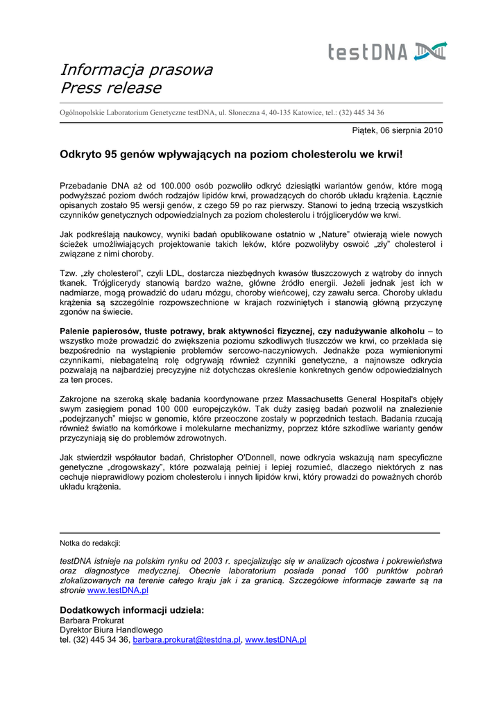 Informacja prasowa Press release Ogólnopolskie Laboratorium Genetyczne testDNA, ul. Słoneczna 4, 40-135 Katowice, tel.: (32) 445 34 36 Piątek, 06 sierpnia 2010 Odkryto 95 genów wpływających na poziom cholesterolu we krwi! Przebadanie DNA aż od 100.000 osób pozwoliło odkryć dziesiątki wariantów genów, które mogą podwyższać poziom dwóch rodzajów lipidów krwi, prowadzących do chorób układu krążenia. Łącznie opisanych zostało 95 wersji genów, z czego 59 po raz pierwszy. Stanowi to jedną trzecią wszystkich czynników genetycznych odpowiedzialnych za poziom cholesterolu i trójglicerydów we krwi. Jak podkreślają naukowcy, wyniki badań opublikowane ostatnio w „Nature” otwierają wiele nowych ścieżek umożliwiających projektowanie takich leków, które pozwoliłyby oswoić „zły” cholesterol i związane z nimi choroby. Tzw. „zły cholesterol”, czyli LDL, dostarcza niezbędnych kwasów tłuszczowych z wątroby do innych tkanek. Trójglicerydy stanowią bardzo ważne, główne źródło energii. Jeżeli jednak jest ich w nadmiarze, mogą prowadzić do udaru mózgu, choroby wieńcowej, czy zawału serca. Choroby układu krążenia są szczególnie rozpowszechnione w krajach rozwiniętych i stanowią główną przyczynę zgonów na świecie. Palenie papierosów, tłuste potrawy, brak aktywności fizycznej, czy nadużywanie alkoholu – to wszystko może prowadzić do zwiększenia poziomu szkodliwych tłuszczów we krwi, co przekłada się bezpośrednio na wystąpienie problemów sercowo-naczyniowych. Jednakże poza wymienionymi czynnikami, niebagatelną rolę odgrywają również czynniki genetyczne, a najnowsze odkrycia pozwalają na najbardziej precyzyjne niż dotychczas określenie konkretnych genów odpowiedzialnych za ten proces. Zakrojone na szeroką skalę badania koordynowane przez Massachusetts General Hospital's objęły swym zasięgiem ponad 100 000 europejczyków. Tak duży zasięg badań pozwolił na znalezienie „podejrzanych” miejsc w genomie, które przeoczone zostały w poprzednich testach. Badania rzucają również światło na komórkowe i molekularne mechanizmy, poprzez które szkodliwe warianty genów przyczyniają się do problemów zdrowotnych. Jak stwierdził współautor badań, Christopher O'Donnell, nowe odkrycia wskazują nam specyficzne genetyczne „drogowskazy”, które pozwalają pełniej i lepiej rozumieć, dlaczego niektórych z nas cechuje nieprawidłowy poziom cholesterolu i innych lipidów krwi, który prowadzi do poważnych chorób układu krążenia. Notka do redakcji: testDNA istnieje na polskim rynku od 2003 r. specjalizując się w analizach ojcostwa i pokrewieństwa oraz diagnostyce medycznej. Obecnie laboratorium posiada ponad 100 punktów pobrań zlokalizowanych na terenie całego kraju jak i za granicą. Szczegółowe informacje zawarte są na stronie www.testDNA.pl Dodatkowych informacji udziela: Barbara Prokurat Dyrektor Biura Handlowego tel. (32) 445 34 36, [email protected], www.testDNA.pl