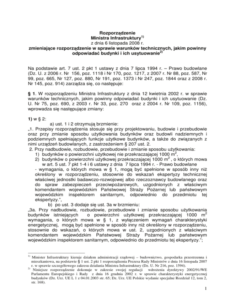 Rozporządzenie Ministra Infrastruktury1) z dnia 6 listopada 2008 r. zmieniające rozporządzenie w sprawie warunków technicznych, jakim powinny odpowiadaü budynki i ich usytuowanie2) Na podstawie art. 7 ust. 2 pkt 1 ustawy z dnia 7 lipca 1994 r. – Prawo budowlane (Dz. U. z 2006 r. Nr 156, poz. 1118 i Nr 170, poz. 1217, z 2007 r. Nr 88, poz. 587, Nr 99, poz. 665, Nr 127, poz. 880, Nr 191, poz. 1373 i Nr 247, poz. 1844 oraz z 2008 r. Nr 145, poz. 914) zarządza siĊ, co nastĊpuje: § 1. W rozporządzeniu Ministra Infrastruktury z dnia 12 kwietnia 2002 r. w sprawie warunków technicznych, jakim powinny odpowiadaü budynki i ich usytuowanie (Dz. U. Nr 75, poz. 690, z 2003 r. Nr 33, poz. 270 oraz z 2004 r. Nr 109, poz. 1156), wprowadza siĊ nastĊpujące zmiany: 1) w § 2: a) ust. 1 i 2 otrzymują brzmienie: „1. Przepisy rozporządzenia stosuje siĊ przy projektowaniu, budowie i przebudowie oraz przy zmianie sposobu uĪytkowania budynków oraz budowli nadziemnych i podziemnych spełniających funkcje uĪytkowe budynków, a takĪe do związanych z nimi urządzeĔ budowlanych, z zastrzeĪeniem § 207 ust. 2. 2. Przy nadbudowie, rozbudowie, przebudowie i zmianie sposobu uĪytkowania: 1) budynków o powierzchni uĪytkowej nie przekraczającej 1000 m2, 2) budynków o powierzchni uĪytkowej przekraczającej 1000 m2 , o których mowa w art. 5 ust. 7 pkt 1-4 i 6 ustawy z dnia 7 lipca 1994 r. - Prawo budowlane - wymagania, o których mowa w § 1, mogą byü spełnione w sposób inny niĪ okreĞlony w rozporządzeniu, stosownie do wskazaĔ ekspertyzy technicznej właĞciwej jednostki badawczo-rozwojowej albo rzeczoznawcy budowlanego oraz do spraw zabezpieczeĔ przeciwpoĪarowych, uzgodnionych z właĞciwym komendantem wojewódzkim PaĔstwowej StraĪy PoĪarnej lub paĔstwowym wojewódzkim inspektorem sanitarnym, odpowiednio do przedmiotu tej ekspertyzy.”, b) po ust. 3 dodaje siĊ ust. 3a w brzmieniu: „3a. Przy nadbudowie, rozbudowie, przebudowie i zmianie sposobu uĪytkowania budynków istniejących o powierzchni uĪytkowej przekraczającej 1000 m2 wymagania, o których mowa w § 1, z wyłączeniem wymagaĔ charakterystyki energetycznej, mogą byü spełnione w sposób inny niĪ okreĞlony w rozporządzeniu, stosownie do wskazaĔ, o których mowa w ust. 2, uzgodnionych z właĞciwym komendantem wojewódzkim PaĔstwowej StraĪy PoĪarnej lub paĔstwowym wojewódzkim inspektorem sanitarnym, odpowiednio do przedmiotu tej ekspertyzy.”; 1) 2) Minister Infrastruktury kieruje działem administracji rządowej – budownictwo, gospodarka przestrzenna i mieszkaniowa, na podstawie § 1 ust. 2 pkt 1 rozporządzenia Prezesa Rady Ministrów z dnia 16 listopada 2007 r. w sprawie szczegółowego zakresu działania Ministra Infrastruktury (Dz. U. Nr 216, poz. 1594). Niniejsze rozporządzenie dokonuje w zakresie swojej regulacji wdroĪenia dyrektywy 2002/91/WE Parlamentu Europejskiego i Rady z dnia 16 grudnia 2002 r. w sprawie charakterystyki energetycznej budynków (Dz. Urz. UE L 1 z 04.01.2003 str. 65; Dz. Urz. UE Polskie wydanie specjalne Rozdział 12, tom 2, str. 168). 1 2) w § 118 dodaje siĊ ust. 3 w brzmieniu: „3. Straty ciepła na przesyle ciepłej wody uĪytkowej i w przewodach cyrkulacyjnych powinny byü na racjonalnie niskim poziomie. Izolacja cieplna tych przewodów powinna spełniaü wymagania okreĞlone w załączniku nr 2 do rozporządzenia.”; 3) w § 133 dodaje siĊ ust. 9 i 10 w brzmieniu: „9. Straty ciepła na przewodach zasilających i powrotnych instalacji wodnej centralnego ogrzewania powinny byü na racjonalnie niskim poziomie. Izolacja cieplna tych przewodów powinna spełniaü wymagania okreĞlone w załączniku nr 2 do rozporządzenia. 10. Straty ciepła na przewodach ogrzewania powietrznego powinny byü na racjonalnie niskim poziomie. Izolacja cieplna tych przewodów powinna spełniaü wymagania okreĞlone w załączniku nr 2 do rozporządzenia.”; 4) w §150 ust. 3 otrzymuje brzmienie: „3. W instalacjach wentylacji i klimatyzacji nie naleĪy łączyü ze sobą przewodów z pomieszczeĔ o róĪnych wymaganiach uĪytkowych i sanitarno-zdrowotnych. Nie dotyczy to budynków jednorodzinnych i rekreacji indywidualnej oraz wydzielonych lokali mieszkalnych lub uĪytkowych z indywidualną zorganizowaną wentylacją nawiewno-wywiewną.”; 5) w § 151: a) ust.1 otrzymuje brzmienie: „1. W instalacjach wentylacji mechanicznej ogólnej nawiewno-wywiewnej lub klimatyzacji komfortowej o wydajnoĞci 2000 m3/h i wiĊcej, naleĪy stosowaü urządzenia do odzyskiwania ciepła z powietrza wywiewanego o skutecznoĞci co najmniej 50% lub recyrkulacjĊ, gdy jest to dopuszczalne. W przypadku zastosowania recyrkulacji strumieĔ powietrza zewnĊtrznego nie moĪe byü mniejszy niĪ wynika to z wymagaĔ higienicznych, jednak nie mniej niĪ 10% powietrza nawiewanego. Dla wentylacji technologicznej zastosowanie odzysku ciepła powinno wynikaü z uwarunkowaĔ technologicznych i rachunku ekonomicznego.”, b) dodaje siĊ ust. 5-7 w brzmieniu: „5. W przypadku stosowania recyrkulacji powietrza w instalacjach wentylacji mechanicznej nawiewno-wywiewnej lub klimatyzacji naleĪy stosowaü układy regulacji umoĪliwiające w korzystnych warunkach pogodowych zwiĊkszanie udziału powietrza zewnĊtrznego do 100%. 6. Przepisu ust. 5 nie stosuje siĊ w przypadkach, gdy zwiĊkszanie strumienia powietrza wentylacyjnego uniemoĪliwiałoby dotrzymanie poziomu czystoĞci powietrza wymaganego przez wzglĊdy technologiczne. 7. WymagaĔ ust. 1 moĪna nie stosowaü w przypadku instalacji uĪywanych krócej niĪ przez 1 000 godzin w roku.”; 6) w § 154: a) ust. 1 otrzymuje brzmienie: „1. Urządzenia i elementy wentylacji mechanicznej i klimatyzacji powinny byü stosowane w sposób umoĪliwiający uzyskanie zakładanej jakoĞci Ğrodowiska w pomieszczeniu przy racjonalnym zuĪyciu energii do ogrzewania i chłodzenia oraz energii elektrycznej.”, b) dodaje ust. 10 i 11 w brzmieniu: „10. Moc właĞciwa wentylator