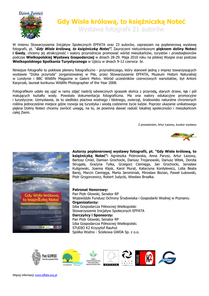 Gdy Wisła królową, to księżniczką Noteć Wystawa fotografii 21 autorów W imieniu Stowarzyszenia Inicjatyw Społecznych EFFATA oraz 23 autorów, zapraszam na poplenerową wystawę fotografii, pt. "Gdy Wisła królową, to księżniczką Noteć”. Zauroczeni nietuzinkowym pięknem doliny Noteci i Gwdy, chcemy jej atrakcyjność i walory przyrodnicze promować wśród mieszkańców, turystów i przedsiębiorców podczas Wielkopolskiej Wystawy Gospodarczej w dniach 28-29. Maja 2010 roku na pilskiej Wyspie oraz podczas Wielkopolskiego Spotkania Turystycznego w Ujściu w dniach 9-12 czerwca br. Niniejsze fotografie to pokłosie pleneru fotograficzno - przyrodniczego, który stanowił jedną z imprez towarzyszących wystawie "Dzika przyroda" zorganizowanej w Pile, przez Stowarzyszenie EFFATA, Muzeum Historii Naturalnej w Londynie i BBC Wildlife Magazine w Galerii Metro. Wśród uczestników czerwcowych warsztatów, był Antoni Kacprzak, laureat konkursu Wildlife Photographer of the Year 2008. Fotografikom udało się ująć w ramy zdjęć nastrój odwiecznych igraszek słońca z przyrodą, starych drzew, łąk i pól malujących kształty wody. Powstała dokumentacja fotograficzna. Ma ona walory edukacyjne promocyjne i turystyczne. Uzmysławia, że to siedlisko ptactwa wodnego i błotnego, zwierząt, środowisko naturalne chronionych roślina jednocześnie miejsce gdzie rozwija się turystyka i wiodą codzienne życie ludzie. Poprzez ukazanie unikatowego piękna Doliny Noteci chcemy zwrócić uwagę, na to, że powinna dawać radość lokalnej społeczności i mieszkańcom całej Ziemi. Z poważaniem, Artur Łazowy, kurator wystawy Autorzy poplenerowej wystawy fotografii, pt. "Gdy Wisła królową, to księżniczką Noteć”: Agnieszka Piotrowska, Anna Parysz, Artur Łazowy, Bartosz Ćmiel, Damian Grochocki, Dariusz Trojanowski, Dariusz Witek, Dorota Strugała, Grażyna Tylka, Grzegorz Ciemięga, Jan Grochocki, Jarosław Kuligowski, Joanna Klęsk, Karol Murat, Katarzyna Kordylewicz, Lidia Beata Barej, Marcin Ciemięga, Marta Jarominiak, Mirosław Bocian, Paweł Łukowski, Piotr Grygorcewicz, Robert Judycki, Wiesław Broalka. Patronat Honorowy: Pan Piotr Głowski, Senator RP Wojewódzki Fundusz Ochrony Środowiska i Gospodarki Wodnej w Poznaniu Organizatorzy: Izba Gospodarcza Północnej Wielkopolski Stowarzyszenie Inicjatyw Społecznych EFFATA Darczyńcy i Sponsorzy: Pan Piotr Głowski, Senator RP Izba Gospodarcza Północnej Wielkopolski. STUDIO K2 Krzysztof Rauhut Spółka Wodno - Ściekowa GWDA Sp. z o.o. Więcej informacji www.effata.org.pl Wstęp do poplenerowej wystawy fotografii, pt.: "Gdy Wisła królową, to księżniczką Noteć”. Dolina Noteci jest zachodnim przedłużeniem pradoliny Wisły. Dolina Noteci osiąga szerokość około 9 km i wcina się w otaczające wysoczyzny na głębokość 40-60 m. Charakterystyczną cechą doliny jest szerokie (2-6 km), zatorfione i podmokłe dno. W strefie kontaktu doliny i wzgórz morenowych występują najwyższe kontrasty wysokościowe w województwie kujawsko-pomorskim. Atrakcyjność doliny podnoszą występujące tu: park narodowy, rezerwaty przyrody, obszary chronionego krajobrazu, pomniki przyrody. Europejska sieć obszarów chronionych "Natura 2000" obejmuje w dolinie Noteci dwa obszary specjalnej ochrony ptaków oraz projektowany specjalny obszar ochrony siedlisk. Dolina Noteci jest największym i najlepiej zachowanym kompleksem dolinowo-bagiennym z dużą różnorodnością świata roślinnego, w tym rzadkich i ginących w skali Europy zbiorowisk roślinnych oraz bogactwem świata zwierzęcego, szczególnie ptactwa wodnego i błotnego. Obszar ostoi Dolina Noteci częściowo pokrywa się z ważną ostoją ptasią o randze europejskiej – Nadnoteckie Łęgi. Występują tu 22 gatunki ptaków z załącznika I Dyrektywy Ptasiej. Są to: bąk, bączek, bocian biały, kania czarna, kania ruda, bielik, błotniak stawowy, błotniak łąkowy, orlik krzykliwy, kropiatka, zielonka, derkacz, żuraw, dubelt, rybitwa czarna, zimorodek, dzięcioł czarny, świergotek polny, podróżniczek, jarzębata, dzierzba pustynna i ortolan. To prawdziwe ptasie królestwo. Z pośród ssaków żyją tu wydry i bobry, a świat płazów reprezentuje kumak nizinny z rodziny ropuszkowatych. W Dolinie Noteci spotkać można ponadto czerwończyka fioletka (motyla z Polskiej Czerwonej Księgi zwierząt oraz objętą ochroną ważkę - łątkę ozdobną. Rzekę zamieszkują natomiast chronione gatunki ryb: bolenie, piskorze i głowacze białopłetwe. Dolina rzeki Noteci należy do naturalnych zasobów regionu, które w szczególny sposób mogą służą rozwojowi turystyki wodnej, turystyki rowerowej, agroturystyki, jeździectwu. Przez część Doliny Noteci biegnie Kanał Bydgoski, którego atutem jest połączenie szlaków wodnych między wschodem i zachodem Europy. Rejs można rozpocząć w Paryżu, żeby kanałami dopłynąć do pięknych zakątków ziemi polskiej i zobaczyć z perspektywy statku Dolinę Warty, Noteci i zakończyć "wodną przygodę" w Królewcu. W 1999 powstało Stowarzyszenia Gmin i Powiatów Nadnoteckich, do którego należy 21 gmin i Powiat Pilski. Stowarzyszenie działa ponadregionalnie w województwach: wielkopolskim, kujawsko-pomorskim i zachodniopomorskim; w powiatach: pilskim, chodzieskim, czarnkowsko-trzcianeckim, złotowskim, wągrowieckim, nakielskim i wałeckim. Celem stowarzyszenia jest w aktywizacja gospodarcza, turystyczna, kulturalna obszarów nadnoteckich. Stowarzyszenie wspiera projekt „Turystyki wodnej na Noteci”, którego celem jest odtworzenia szlaku wodnego. W związku z tym podjęte zostały: działania nad poprawą żeglowności rzeki Noteci - budowa przystani, modernizacja istniejących już śluz, prace związane z regulacją rzeki Noteci i jej dopływów na wybranych odcinkach rzek dla lepszego gospodarczego ich wykorzystania i poprawy bezpieczeństwa obszarów zalewowych. Stowarzyszenie podejmuje działania