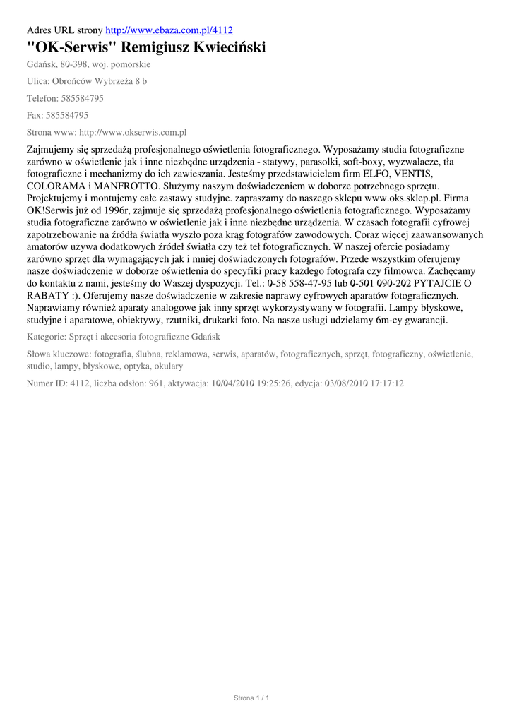 Adres URL strony http://www.ebaza.com.pl/4112 "OK-Serwis" Remigiusz Kwieciński Gdańsk, 80-398, woj. pomorskie Ulica: Obrońców Wybrzeża 8 b Telefon: 585584795 Fax: 585584795 Strona www: http://www.okserwis.com.pl Zajmujemy się sprzedażą profesjonalnego oświetlenia fotograficznego. Wyposażamy studia fotograficzne zarówno w oświetlenie jak i inne niezbędne urządzenia - statywy, parasolki, soft-boxy, wyzwalacze, tła fotograficzne i mechanizmy do ich zawieszania. Jesteśmy przedstawicielem firm ELFO, VENTIS, COLORAMA i MANFROTTO. Służymy naszym doświadczeniem w doborze potrzebnego sprzętu. Projektujemy i montujemy całe zastawy studyjne. zapraszamy do naszego sklepu www.oks.sklep.pl. Firma OK!Serwis już od 1996r, zajmuje się sprzedażą profesjonalnego oświetlenia fotograficznego. Wyposażamy studia fotograficzne zarówno w oświetlenie jak i inne niezbędne urządzenia. W czasach fotografii cyfrowej zapotrzebowanie na źródła światła wyszło poza krąg fotografów zawodowych. Coraz więcej zaawansowanych amatorów używa dodatkowych źródeł światła czy też teł fotograficznych. W naszej ofercie posiadamy zarówno sprzęt dla wymagających jak i mniej doświadczonych fotografów. Przede wszystkim oferujemy nasze doświadczenie w doborze oświetlenia do specyfiki pracy każdego fotografa czy filmowca. Zachęcamy do kontaktu z nami, jesteśmy do Waszej dyspozycji. Tel.: 0-58 558-47-95 lub 0-501 090-202 PYTAJCIE O RABATY :). Oferujemy nasze doświadczenie w zakresie naprawy cyfrowych aparatów fotograficznych. Naprawiamy również aparaty analogowe jak inny sprzęt wykorzystywany w fotografii. Lampy błyskowe, studyjne i aparatowe, obiektywy, rzutniki, drukarki foto. Na nasze usługi udzielamy 6m-cy gwarancji. Kategorie: Sprzęt i akcesoria fotograficzne Gdańsk Słowa kluczowe: fotografia, ślubna, reklamowa, serwis, aparatów, fotograficznych, sprzęt, fotograficzny, oświetlenie, studio, lampy, błyskowe, optyka, okulary Numer ID: 4112, liczba odsłon: 961, aktywacja: 10/04/2010 19:25:26, edycja: 03/08/2010 17:17:12 Strona 1 / 1