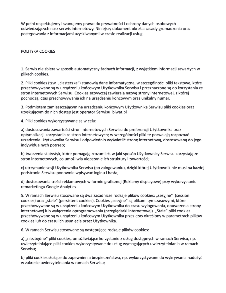 W pełni respektujemy i szanujemy prawo do prywatności i ochrony danych osobowych odwiedzających nasz serwis internetowy. Niniejszy dokument określa zasady gromadzenia oraz postępowania z informacjami uzyskiwanymi w czasie realizacji usług. POLITYKA COOKIES 1. Serwis nie zbiera w sposób automatyczny żadnych informacji, z wyjątkiem informacji zawartych w plikach cookies. 2. Pliki cookies (tzw. „ciasteczka”) stanowią dane informatyczne, w szczególności pliki tekstowe, które przechowywane są w urządzeniu końcowym Użytkownika Serwisu i przeznaczone są do korzystania ze stron internetowych Serwisu. Cookies zazwyczaj zawierają nazwę strony internetowej, z której pochodzą, czas przechowywania ich na urządzeniu końcowym oraz unikalny numer. 3. Podmiotem zamieszczającym na urządzeniu końcowym Użytkownika Serwisu pliki cookies oraz uzyskującym do nich dostęp jest operator Serwisu biwat.pl 4. Pliki cookies wykorzystywane są w celu: a) dostosowania zawartości stron internetowych Serwisu do preferencji Użytkownika oraz optymalizacji korzystania ze stron internetowych; w szczególności pliki te pozwalają rozpoznać urządzenie Użytkownika Serwisu i odpowiednio wyświetlić stronę internetową, dostosowaną do jego indywidualnych potrzeb; b) tworzenia statystyk, które pomagają zrozumieć, w jaki sposób Użytkownicy Serwisu korzystają ze stron internetowych, co umożliwia ulepszanie ich struktury i zawartości; c) utrzymanie sesji Użytkownika Serwisu (po zalogowaniu), dzięki której Użytkownik nie musi na każdej podstronie Serwisu ponownie wpisywać loginu i hasła; d) dostosowania treści reklamowych w formie graficznej (Reklamy displayowe) przy wykorzystaniu remarketingu Google Analytics 5. W ramach Serwisu stosowane są dwa zasadnicze rodzaje plików cookies: „sesyjne” (session cookies) oraz „stałe” (persistent cookies). Cookies „sesyjne” są plikami tymczasowymi, które przechowywane są w urządzeniu końcowym Użytkownika do czasu wylogowania, opuszczenia strony internetowej lub wyłączenia oprogramowania (przeglądarki internetowej). „Stałe” pliki cookies przechowywane są w urządzeniu końcowym Użytkownika przez czas określony w parametrach plików cookies lub do czasu ich usunięcia przez Użytkownika. 6. W ramach Serwisu stosowane są następujące rodzaje plików cookies: a) „niezbędne” pliki cookies, umożliwiające korzystanie z usług dostępnych w ramach Serwisu, np. uwierzytelniające pliki cookies wykorzystywane do usług wymagających uwierzytelniania w ramach Serwisu; b) pliki cookies służące do zapewnienia bezpieczeństwa, np. wykorzystywane do wykrywania nadużyć w zakresie uwierzytelniania w ramach Serwisu; c) „wydajnościowe” pliki cookies, umożliwiające zbieranie informacji o sposobie korzystania ze stron internetowych Serwisu; d) „funkcjonalne” pliki cookies, umożliwiające „zapamiętanie” wybranych przez Użytkownika ustawień i personalizację interfejsu Użytkownika, np. w zakresie wybranego języka lub regionu, z którego pochodzi Użytkownik, rozmiaru czcionki, wyglądu strony internetowej itp.; e) „reklamowe” pliki cookies, umożliwiające dostarczanie Użytkownikom treści reklamowych bardziej dostosowanych do ich zainteresowań. 7. W wielu przypadkach oprogramowanie służące do przeglądania stron internetowych (przeglądarka internetowa) domyślnie dopuszcza przechowywanie plików cookies w urządzeniu końcowym Użytkownika. Użytkownicy Serwisu mogą dokonać w każdym czasie zmiany ustawień dotyczących plików cookies. Ustawienia te mogą zostać zmienione w szczególności w taki sposób, aby blokować automatyczną obsługę plików cookies w ustawieniach przeglądarki internetowej bądź informować o ich każdorazowym zamieszczeniu w urządzeniu Użytkownika Serwisu. Szczegółowe informacje o możliwości i sposobach obsługi plików cookies dostępne są w ustawieniach oprogramowania (przeglądarki internetowej). Użytkownicy mogą zablokować usługę Analytics dla reklam displayowych oraz dostosowywać reklamy w sieci reklamowej Google w Menedżerze preferencji reklam. Można również pobrać program blokujący Google Analytics ze strony https://tools.google.com/dlpage/gaoptout/ 8. Operator Serwisu informuje, że ograniczenia stosowania plików cookies mogą wpłynąć na niektóre funkcjonalności dostępne na stronach internetowych Serwisu. 9. Pliki cookies zamieszczane w urządzeniu końcowym Użytkownika Serwisu i wykorzystywane mogą być również przez współpracujących z operatorem Serwisu reklamodawców oraz partnerów. 10. Więcej informacji na temat plików cookies dostępnych jest pod adresem http://wszystkoociasteczkach.pl lub w sekcji „Pomoc” w menu przeglądarki internetowej.