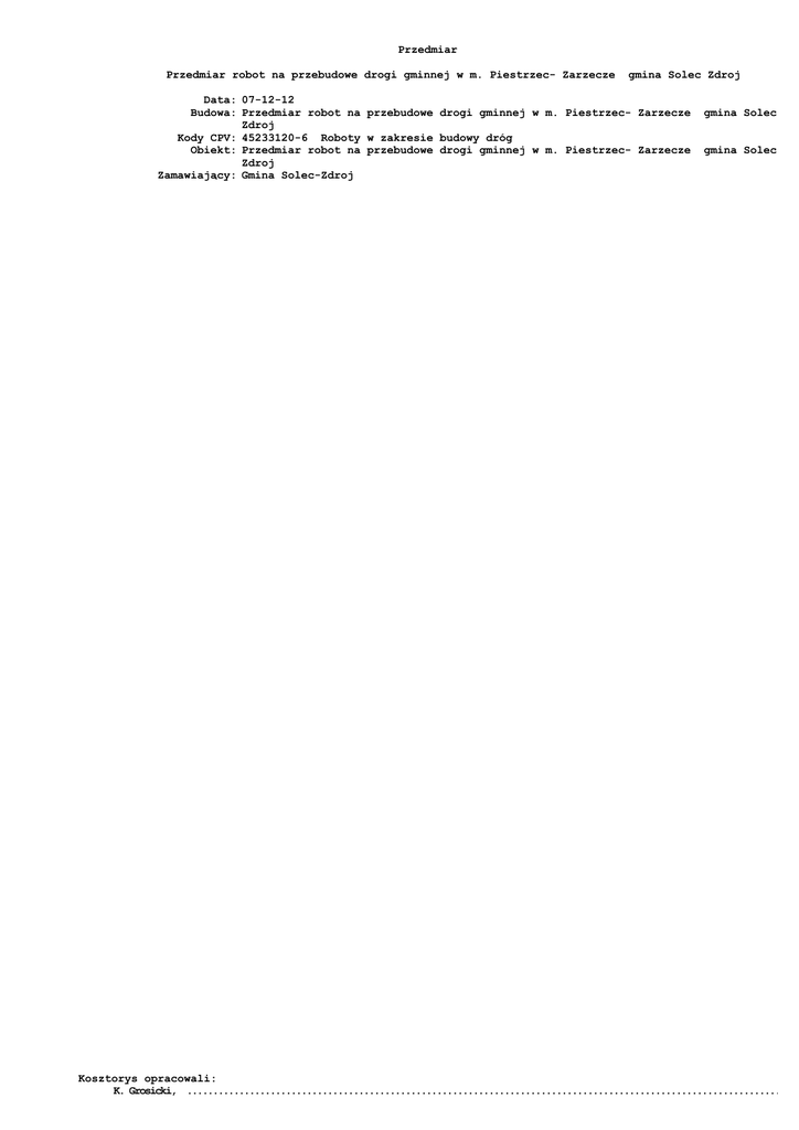 Przedmiar Przedmiar robot na przebudowe drogi gminnej w m. Piestrzec- Zarzecze gmina Solec Zdroj Data: 07-12-12 Budowa: Przedmiar robot na przebudowe drogi gminnej w m. Piestrzec- Zarzecze Zdroj Kody CPV: 45233120-6 Roboty w zakresie budowy dróg Obiekt: Przedmiar robot na przebudowe drogi gminnej w m. Piestrzec- Zarzecze Zdroj Zamawiający: Gmina Solec-Zdroj gmina Solec gmina Solec Kosztorys opracowali: K. Grosicki, ...................................................................................................................... Piestrzec-Zarzecze -przedmiar Zuzia (C) DataComp 1994-2005(lic. 1234) strona nr: 2 Przedmiar Opis pozycji, wyliczenie ilości robót Ilość Krot. Jedn. 1 roboty przygotowawcze kod CPV 45100000-8 1 Nr STWiOR: SST-D-01.01.01 Roboty pomiarowe przy liniowych robotach ziemnych, trasa dróg w terenie równinnym 2 roboty rozbiorkowe 2 Nr STWiOR: SST-D-05.03.11 Frezowanie istniejacej nawierzchni bitumicznej o grub. 5 cm 3 Nr STWiOR: SST-D-01.02.04 Wywiezienie destruktu z terenu rozbiórki przy mechanicznym załadowaniu i wyładowaniu, załadowanie koparko-ładowarką samochodów samowyładowczych, przy obsłudze 3 samochodów na zmianę odleglosc 5 km 3 roboty ziemne 131,62 m2 7,03 m3 214,13 m3 360,90 m3 214,13 m3 2 828,0 m2 1 038,0 m2 1 790,0 m2 1 790,0 m2 1 790,0 m2 84,0 m2 84,0 m2 84,0 m2 70,13 m3 808,0 m nowej jezdni kod CPV 45233000-9 9 Nr STWiOR: SST-D-04.05.01 Podbudowy z gruntu stabilizowanego cementem Rm=2,5 MPa wykonywane sprzętem mechanicznym, mieszarki doczepne, grubość podbudowy po zagęszczeniu 15·cm 10 Nr STWiOR: SST-D-04.04.01 Podbudowy z kruszyw, tłuczeń, warstwa dolna, grubość warstwy po zagęszczeniu 20·cm 5 konstrukcja jezdni kod CPV 45233000-9 11 Nr STWiOR: SST-D-05.03.23 Nawierzchnie z kostki brukowej betonowej, grubość 8·cm, na podsypce cementowo-piaskowej, kostka szara 6 zjazdy km kod CPV 45100000-8 4 Nr STWiOR: SST-D-02.01.01 Roboty ziemne koparkami podsiębiernymi z transportem urobku samochodami samowyładowczymi do 1·km, koparka 0,60·m3, grunt kategorii IV, samochód do 5·t 5 Nr STWiOR: SST-D-02.01.01 Roboty ziemne koparkami podsiębiernymi z transportem urobku samochodami samowyładowczymi do 1·km, koparka 0,60·m3, grunt kategorii IV, samochód do 5·t odwoz na 5 km 6 Nr STWiOR: SST-D-02.01.01 Formowanie i zagęszczanie nasypów spycharkami, wysokość do 3,0·m, grunt kategorii V-VI, spycharka 55·kW (75·KM) 7 Nr STWiOR: SST-D-04.01.01 Plantowanie (obrobienie na czysto), skarp i korony nasypów, kategoria gruntu IV 8 Nr STWiOR: SST-D-06.01.01 Humusowanie i obsianie skarp, przy grubości warstwy humusu 5·cm 4 podbudowa 0,379 kod CPV 45100000-8 na pola i posesje kod CPV 45233253-7 12 Nr STWiOR: SST-D-04.05.01 Podbudowy z gruntu stabilizowanego cementem Rm=1,5 MPa wykonywane sprzętem mechanicznym, mieszarki doczepne, grubość podbudowy po zagęszczeniu 15·cm 13 Nr STWiOR: SST-D-05.02.01 Nawierzchnie z tłucznia kamiennego, warstwa górna z tłucznia, grubość warstwy po uwałowaniu 15·cm 14 Nr STWiOR: SST-D-05.03.23 Nawierzchnie z kostki brukowej betonowej, grubość 8·cm, na podsypce cementowo-piaskowej, kostka szara 7 obrzeza kod CPV 45233100-0 15 Nr STWiOR: SST-D 08.01.01 Ławy pod obrzeza, betonowa z oporem B10 typ krakowski 16 Nr STWiOR: SST-D-08.03.01 ObrzeŜa betonowe, 30x8·cm na podsypce piaskowej z wypełnieniem spoin zaprawą cementową 8 oznakowanie kod CPV 45233280-5 17 Nr STWiOR: SST-D-07.02.01 Słupki do znaków drogowych, z rur stalowych, Fi·70·mm 18 Nr STWiOR: SST-D-07.02.01 Przymocowanie tablic znaków drogowych, znaki zakazu, nakazu, ostrzegawcze, informacyjne, powierzchnia do 0,3·m2 7,0 szt 7,0 szt 13,0 szt 9 regulacja urzadzen podziemnych kod CPV 45233280-5 19 Nr STWiOR: D-03.02.01 Regulacja pionowa studzienek dla urządzeń podziemnych, zawory wodociągowe i gazowe Przedmiar robot na przebudowe drogi gminnej w m. Piestrzec- Zarzecze gmina Solec Zdroj Piestrzec-Zarzecze -przedmiar Zuzia (C) DataComp 1994-2005(lic. 1234) strona nr: 3 Spis działów Lp. 1 2 3 4 5 6 7 8 9 Nr CPV Opis roboty przygotowawcze kod CPV 45100000-8 roboty rozbiorkowe kod CPV 45100000-8 roboty ziemne kod CPV 45100000-8 podbudowa nowej jezdni kod CPV 45233000-9 konstrukcja jezdni kod CPV 45233000-9 zjazdy na pola i posesje kod CPV 45233253-7 obrzeza kod CPV 45233100-0 oznakowanie kod CPV 45233280-5 regulacja urzadzen podziemnych kod CPV 45233280-5 Przedmiar robot na przebudowe drogi gminnej w m. Piestrzec- Zarzecze gmina Solec Zdroj