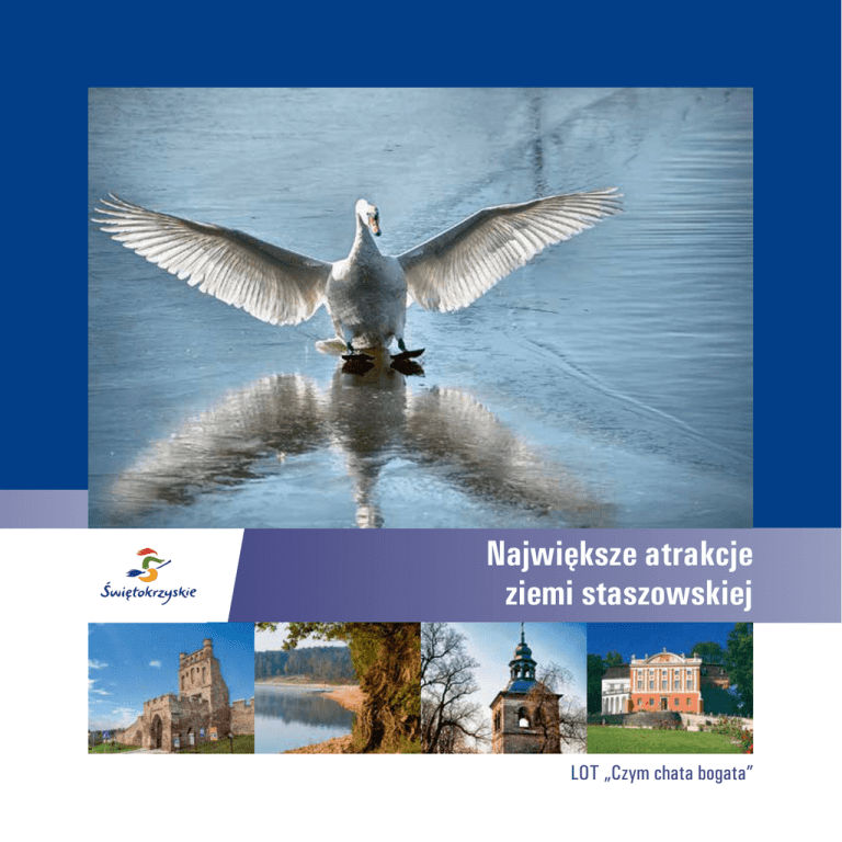 Największe atrakcje ziemi staszowskiej LOT „Czym chata bogata” Pieszo, konno i kajakiem - poznaj region nasz ze smakiem 2 Lokalna Organizacja Turystyczna „Czym chata bogata” zaprasza do zwiedzania największych atrakcji turystycznych powiatu staszowskiego. U nas podładujecie akumulatory i poznacie smak przygody. Nasz region to wspaniałe miejsce dla aktywnych odkrywców, ludzi, którzy chcą wiedzieć więcej, widzieć dalej i czuć mocniej oraz fanów niezbyt mocnych, ale klimatycznych doznań. Tylko u nas możecie wcielić się w średniowiecznego rycerza (Szydłów), kowboja otoczonego stadem potężnych bizonów (Kurozwęki), albo dzielnego żeglarza przemierzającego bezmiar morza świętokrzyskiego (Chańcza), czy zagubionego w bagnistej amazońskiej dżungli podróżnika (Golejów). Kto woli może przysiąść na diabelskim kamieniu i przeczytać dzieciom legendę o złych czarownicach, albo odpocząć u gościnnego gospodarza i skosztować wyśmienitego wiejskiego jedzenia. Każdego dnia możecie odkrywać i poznawać, bo czekają na Was pałace, dwory, wspaniałe kościoły. Możecie je zwiedzać, ale nie musicie, bo nasz region to także wymarzone miejsce dla lubiących poleniuchować na plaży lub powędkować. Chańcza i Golejów to znane i cenione wśród wędkarzy zbiorniki wodne. Można tu złowić potężnego karpia lub zapolować na szczupaka giganta. W którąkolwiek stronę nie pojedziecie, zaskoczy Was, że tak blisko można znaleźć tak piękne miejsca. Od Staszowa - centrum regionu - w zasięgu jednodniowej wycieczki rowerowej lub samochodowej są najbardziej atrakcyjne miejsca województwa świętokrzyskiego: Sandomierz, Ujazd, Opatów, Święty Krzyż, Kielce, Chęciny, Jaskinia Raj, Busko-Zdrój, Pacanów i Rytwiany, a tuż za Wisłą - Baranów Sandomierski. Zapraszamy Czym chata bogata Lokalna Organizacja Turystyczna „Czym chata bogata” działa w południowo-wschodniej części województwa świętokrzyskiego, w powiecie staszowskim. Zrzesza trzy gminy: Bogorię, Staszów i Szydłów. Łączna powierzchnia jaką zajmują to 456,8 km², z czego Staszów - 225,86 km² w tym miasto - 26,88 km², Szydłów - 107,53 km² i Bogoria - 123,41 km². Największą miejscowością jest liczący 15 tys. mieszkańców Staszów, będący jednocześnie stolicą powiatu i centrum regionu. Teren LOT „Czym chata bogata” położony jest na pograniczu Gór Świętokrzyskich, Sandomierszczyzny i Ponidzia. Ten teren to niezwykłe połączenie form i kontrastów. Są tu zarówno wzniesienia Pasma Wygiełzowskiego Gór Świętokrzyskich, jak i obniżenia dolin rzecznych Czarnej i Kacanki. Liczne jeziora i rzeki, graniczą z przeciętymi wąwozami wzniesieniami. Podobnie dzieje się w odniesieniu do sposobu zagospodarowania terenu. Żyzne, gęsto zaludnione tereny, graniczą ze wspaniałymi przyrodniczo i pięknymi lasami. To region o bardzo bogatym dziedzictwie kulturowym, pełen zamków, dworów, kościołów, ale także licznych śladów gospodarczej przeszłości. Staszów położony jest w odległości 54 km od Kielc i 120 km od Krakowa. Przebiegają drogi wojewódzkie: • 764 (Kielce - Staszów - Połaniec) • 757 (Opatów - Staszów - Stopnica) • 765 (Chmielnik - Staszów - Osiek) Lokalna Organizacja Turystyczna „Czym chata bogata” ul. Parkowa 6, 28-200 Staszów Serce regionu 4 Serce regionu 5 Staszów Staszów to historyczne miasto, którego nazwa pochodzi od legendarnego założyciela Stasza Kmiotko. Pierwsze wzmianki pisane pojawiły się już w XII w., a prawa miejskie Staszów uzyskał w 1525 r. Od tamtej pory, przez długie wieki działał prężnie, słynąc m.in. ze znakomitych wyrobów szabelniczych i ceramicznych. Największe straty poniósł w okresie II wojny światowej. Drugą szansą dla Staszowa stał się rozwój przemysłu wydobniczego w pobliskim Grzybowie. W miejscowości tej dokonano pierwszego w Polsce wydobycia siarki metodą podziemnego wytopu. Miasto i gmina Staszów położona jest na brzegach rzeki Czarnej, w południowo-wschodniej części województwa świętokrzyskiego, ok. 50 km od Kielc. Najbardziej charakterystycznym dla miasta elementem architektonicznym jest zabytkowy rynek z dawnymi kramnicami, pełniącymi niegdyś funkcję bliźniaczą do krakowskich sukiennic. W mieście znajduje się kilka bardzo cennych zabytków m.in. kościół św. Bartłomieja, z 1343 r. wraz z renesansową kaplicą Matki Boskiej Różańcowej oraz XVII-wieczny ratusz, w którym mieszczą się obecnie Biblioteka Publiczna, Galeria „Punkt” oraz restauracja „Pod Zegarem”. Zabytkowy jest także układ architektoniczny Rynku i przyległych ulic, gdzie można znaleźć przykłady dawnej architektury małomiejskiej i przemysłowej. W Staszowie są trzy parki. W parku im. Adama Bienia znajduje się pomnik upamiętniający patrona, jest też drugi - poświęcony pomordowanym na Wschodzie policjantom. W parku „Nad Czarną” jest natomiast amfiteatr, plac zabaw, staw oraz wiele pomnikowych drzew. Staszów ma także gęstą sieć darmowego, bezprzewodowego internetu. 6 Staszów jest gospodarczym centrum regionu, z bardzo dobrą ofertą handlową. Znajdują się tu liczne sklepy, centra handlowe, punkty usługowe, lokale gastronomiczne i noclegowe. Na terenie miasta znajduje się także otoczone pięknym lasem jezioro Golejów, z kąpieliskiem, plażą oraz ośrodkami wypoczynkowymi, gwarantującymi kilkaset miejsc noclegowych w różnym standardzie. Można także skorzystać z oferty Powiatowego Centrum Sportowego, w tym basenu i hali ze ścianką wspinaczkową. W mieście aktywnie działa Staszowski Ośrodek Kultury, który organizuje m.in. imprezy kulturalne. Należą do nich cieszące się dużym uznaniem ogólnopolski Turniej Tańca Towarzyskiego, Dzień Chleba oraz klimatyczne: „Wieczór w kolorach jesieni” i „W świątecznym nastroju”. Przez Staszów przebiega zielony szlak turystyczny PTTK Chańcza - Pielaszów, Szlak Przygody -