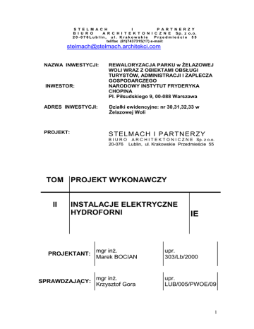 S T E L M A C H I P A R T N E R Z Y B I U R O A R C H I T E K T O N I C Z N E Sp. z o.o. 20-076Lublin, ul. Krakowskie Przedmieście 55 tel/fax (81)7437315(17) e-mail: [email protected] NAZWA INWESTYCJI: INWESTOR: REWALORYZACJA PARKU w śELAZOWEJ WOLI WRAZ Z OBIEKTAMI OBSŁUGI TURYSTÓW, ADMINISTRACJI I ZAPLECZA GOSPODARCZEGO NARODOWY INSTYTUT FRYDERYKA CHOPINA Pl. Piłsudskiego 9, 00-088 Warszawa ADRES INWESTYCJI: Działki ewidencyjne: nr 30,31,32,33 w śelazowej Woli PROJEKT: S TELMACH I P A RTNE RZY BIURO 20-076 A R C H I T E K T O N I C Z N E Sp. z o.o. Lublin, ul. Krakowskie Przedmieście 55 TOM PROJEKT WYKONAWCZY II INSTALACJE ELEKTRYCZNE HYDROFORNI IE PROJEKTANT: mgr inŜ. Marek BOCIAN upr. 303/Lb/2000 SPRAWDZAJĄCY: mgr inŜ. Krzysztof Gora upr. LUB/005/PWOE/09 1 SPIS ZAWARTOŚCI PROJEKTU INSTALACJI ELEKTRYCZNYCH CZĘŚĆ OPISOWA INSTALACJE ELEKTRYCZNE 1. Podstawa opracowania 2. Zakres opracowania 3. Opis techniczny 4. Tabela doboru kabli 5. Zestawienie materiałów CZĘŚĆ RYSUNKOWA RYSUNKI Schemat strukturalny rozdzielnicy RH-0,4kV Plan instalacji elektrycznych Hydroforni Plan sieci zewnętrznych Schematy sterowania NR 1 2 3 4 SKALA 2 1. PODSTAWA OPRACOWANIA Postawą opracowania projektu są: • Zlecenie Inwestora. • Projekt architektoniczno-budowlany budynku. • Wytyczne branŜowe. • Wytyczne i robocze uzgodnienia z Inwestorem. • Uzgodnienia międzybranŜowe. • Obowiązujące normy i przepisy. 2. ZAKRES OPRACOWANIA Niniejsze opracowanie zakresem swym obejmuje: − rozdzielnicę elektryczną hydroforni − instalacje siłowe, − instalacje oświetlenia i gniazd wtyczkowych 230V, − zasilanie oraz sterowanie pomp w pompowni oraz w studniach głębinowych na terenie parku − instalację podgrzewania wpustu dachowego. 3. OPIS TECHNICZNY 3.1. Zasilanie budynku hydroforni Zasilanie budynków hydroforni zaprojektowano jedną linią kablową typy YAKY 4x70mm2 z rozdzielnicy RGNN-0,4kV nowoprojektowanej stacji transformatorowej zlokalizowanej obok budynku A. W budynku hydroforni zlokalizowano rozdzielnicę RH-0,4kV, z której zasilane będą instalacje i urządzenia wewnątrz budynku oraz pompy w studniach głębinowych zlokalizowanych na terenie parku. Linia kablowa, zasilająca hydrofornie oraz kabel zasilający pompownie ujęte są w odrębnym opracowaniu i nie wchodzą w zakres niniejszego opracowania. 3.2. Rozdzielnica hydroforni – RH-0,4kV. W budynku hydroforni zaprojektowano rozdzielnicę RH – 0,4kV zasilaną linią kablową typu YAKY 4x70mm2 ze stacji transformatorowej. Rozdzielnicę zaprojektowano w modułowej obudowie natynkowej, izolacyjnej, IP66 typu Thalassa S59336 z drzwiami pełnymi, firmy Schneider. Rozdzielnica zlokalizowana będzie na ścianie w pobliŜu drzwi wejściowych do budynku. W polu zasilającym zaprojektowano rozłącznik 100A, z napędem ręcznym. Jako zabezpieczenia obwodów odpływowych zastosowane zostaną wyłączniki instalacyjne nadprądowe i róŜnicowoprądowe, rozłączniki bezpiecznikowe, oraz wyłączniki silnikowe w obwodach zasilających pompy. 3 Uwaga: Nastawy wyzwalaczy przeciąŜeniowych wyłączników silnikowych naleŜy dobrać do prądów znamionowych pomp, które ostatecznie zostaną zamontowane na obiekcie. W razie konieczności dokonać korekty typów wyłączników silnikowych tak, aby zakres wyzwalacza umoŜliwiał nastawienie wartości 1,05 x Jn (gdzie Jn – prąd znamionowy silnika pompy). Schemat oraz rozmieszczenie urządzeń w rozdzielnicy przedstawione zostało na rysunku nr 1. 3.3. Instalacja gniazd wtyczkowych 230V W budynku hydroforni zaprojektowano instalacje gniazd wtyczkowych 230V/16A przeznaczonych do zasilania grzejnika elektrycznego, sterowników systemu nawadniania oraz odŜelaziacz i filtra. Obwody gniazd wtyczkowych zasilane będą z rozdzielnicy RH-0,4kV. Gniazda montować naleŜy na ścianach na wysokości około 80cm w pobliŜu urządzeń zasilanych. NaleŜy stosować gniazda natynkowe, bryzgoszczelne IP44. Instalacje gniazd wtyczkowych zaprojektowano przewodami typu YDY 3x2,5mm2/750V prowadzonymi w rurkach instalacyjnych RVS28 układanych na tynku. Plan instalacji gniazd wtyczkowych pokazano na rysunku nr 2. 3.4. Instalacja oświetleniowa Do oświetlenia pomieszczenia hydroforni zaprojektowano oprawę świetlówkową 2x36W, szczelną IP65 montowaną do stropu. Oprawa wyposaŜona będzie w moduł zasilania awaryjnego z czasem podtrzymania 2 godziny i pełnić będzie jednocześnie funkcję oświetlenia podstawowego i awaryjnego. Obwód oświetlenia zasilany z rozdzielnicy RH-0,4kV. Instalację oświetleniową zaprojektowano przewodami typu YDY 3(2,4,)x1,5mm2/750V prowadzonymi w rurkach instalacyjnych RVS28 układanych na tynku. Plan instalacji oświetleniowej pokazano na rysunku nr 2. 3.5. Zasilanie i sterowanie praca pomp. Jako zabezpieczenia obwodów zasilających pompy w rozdzielnicy RH, zaprojektowano wyłączniki silnikowe z wyzwalaczem zwarciowym oraz przeciąŜeniowym. Sterowanie praca pomp odbywać się będzie w sposób następujący: - Pompa cyrkulacyjna Sterowanie pracą za pomocą elektronicznego programatora dobowego typu IHP, umoŜliwiającego zaprogramowanie maksymalnie 32 czasów załączania i wyłączania, dla kaŜdego dnia tygodnia. Szczegółowy program czasowy pracy pompy ustalony zostanie podczas eksploatacji systemu nawadniania. - Pompy zanurzeniowe zamontowane w studni w hydroforni. Sterowanie pracą realizowane przez automatykę fabryczną, zamontowaną w szafce zasilająco sterowniczej pomp. Szafkę zasilająco-sterownicza dostarcza dostawca pomp zanurzeniowych - Pompy głębinowe zamontowane w studniach głębinowych na terenie parku. Sterowanie praca pomp za pomocą łącznika ciśnieniowego, wspólnego dla obydwu pomp. Załączanie i wyłączanie pomp następować będzie jednocześnie. 4 Pompy zanurzeniowe zamontowane w studni, w budynku hydroforni zasilane będą z szafki zasilająco sterowniczej dostarczanej w komplecie z pompami. Dla zasilania szafki zaprojektowa