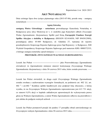 Repertorium A nr 2624 /2015 AKT NOTARIALNY Dnia szóstego lipca dwa tysiące piętnastego roku (2015-07-06), przede mną – zastępcą notarialnym -------------------------------------------------------------------------------------------Agatą Górecką zastępcą Piotra Góreckiego - notariusza prowadzącego Kancelarię Notarialną w Bydgoszczy przy ulicy Mostowej nr 1, w siedzibie jego Kancelarii odbyło Zwyczajne Walne Zgromadzenie Akcjonariuszy Spółki pod firmą Europejski Fundusz Energii Spółka Akcyjna z siedzibą w Bydgoszczy (REGON 021416030, NIP 8943012989), posiadającej adres: 85-005 Bydgoszcz, ul. Gdańska 27, wpisanej do rejestru przedsiębiorców Krajowego Rejestru Sądowego przez Sąd Rejonowy w Bydgoszcz, XIII Wydział Gospodarczy Krajowego Rejestru Sądowego pod numerem KRS: 0000372335, z którego zastępca notarialny spisał niniejszy ----------------------------------------------------PROTOKÓŁ ZWYCZJNEGO WALNEGO ZGROMADZENIA Leszek Jan Piekut -------------------------------------- jako Przewodniczący Zgromadzenia oświadczył, że Zgromadzenie niniejsze stanowi kontynuację Zwyczajnego Walnego Zgromadzenia Akcjonariuszy z dnia 30 czerwca 2015 roku, które zostało przerwane. -------------------------------------------------------------Leszek Jan Piekut stwierdził, że druga część Zwyczajnego Walnego Zgromadzenia została zwołana z zachowaniem wymogów formalnych, na podstawie art. 402 ¹§1, art. 402 2 i art.402 3 Kodeksu spółek handlowych oraz podpisał listę obecności, z której wynika, że na Zwyczajnym Walnym Zgromadzeniu reprezentowane jest 613 731 akcji, co stanowi 0,5% akcji w kapitale zakładowym uprawnionych do wykonywania prawa głosu na Walnym Zgromadzeniu, a zatem Walne Zgromadzenie odbywa się prawidłowo i jest zdolne do podjęcia ważnych uchwał. ---------------------------------------------------------- Leszek Jan Piekut postanowił przejść do punktu 17 porządku obrad zatwierdzonego na Zwyczajnym walnym Zgromadzeniu z dnia 30 czerwca 2015 roku.-------------------------- 2 UCHWAŁA NR 15 Zwyczajnego Walnego Zgromadzenia Spółki pod firmą Europejski Fundusz Energii Spółka Akcyjna z siedzibą w Bydgoszczy w sprawie zmiany Statutu Spółki przez udzielenie Zarządowi Spółki upoważnienia do podwyższenia kapitału zakładowego w ramach kapitału docelowego wraz z możliwością wyłączenia przez Zarząd prawa poboru dotychczasowych akcjonariuszy za zgodą Rady Nadzorczej Działając na podstawie art. 430, art. 444, art. 445 i art. 447 kodeksu spółek handlowych Zwyczajne Walne Zgromadzenie uchwala co następuje: ---------------------------------------§1 Udziela się Zarządowi upoważnienia do podwyższenia kapitału zakładowego w ramach kapitału docelowego wraz z możliwością wyłączenia przez Zarząd prawa poboru dotychczasowych Akcjonariuszy za zgodą Rady Nadzorczej, zmienia się Statut w ten sposób, że po §7 Statutu Spółki dodaje się § 71 który otrzymuje następujące brzmienie: " § 71 Kapitał docelowy -----------------------------------------------------------------------------1.Zarząd Spółki jest upoważniony, w okresie do dnia 01.06.2018 roku, do podwyższenia kapitału zakładowego o kwotę nie wyższą niż 9 147 000,00 zł (dziewięć milionów sto czterdzieści siedem tysięcy złotych) (kapitał docelowy). ---------------------------------------2. Zarząd w ramach upoważnienia do podwyższenia kapitału zakładowego może emitować warranty subskrypcyjne, z terminem wykonania prawa zapisu na akcje upływającym nie później niż okres, na który zostało udzielone Zarządowi upoważnienie do podwyższenia kapitału zakładowego. ---------------------------------------------------------3. Zarząd może wykonywać upoważnienie, o którym mowa w ust.1, poprzez dokonanie jednego lub kilku kolejnych podwyższeń kapitału zakładowego. ------------------------------4. Zarząd Spółki może wydawać akcje w zamian za wkłady pieniężne lub wkłady niepieniężne. -----------------------------------------------------------------------------------------5. Zarząd Spółki może, za zgodą Rady Nadzorczej, wyłączyć albo ograniczyć prawo pierwszeństwa dotychczasowych akcjonariuszy do objęcia akcji Spółki, emitowanych w ramach kapitału docelowego, w tym w stosunku do warrantów subskrypcyjnych uprawniających do obejmowania akcji emitowanych w ramach kapitału docelowego (prawo poboru). -------------------------------------------------------------------------------------6. Z zastrzeżeniem ust. 5, Zarząd decyduje o wszystkich sprawach związanych z podwyższeniem kapitału zakładowego w ramach kapitału docelowego, w szczególności 3 Zarząd jest umocowany do: ustalenia ceny emisyjnej akcji ; określania innych warunków emisji akcji w tym daty (dat), od której akcje będą uczestniczyć w dywidendzie ; ustalania wszelkich warunków emisji warrantów subskrypcyjnych oraz do podejmowania wszelkich czynności prawnych i organizacyjnych związanych z wprowadzenia kolejnych emisji do obrotu publicznego, w tym organizowanego na rynku NewConnect, jak i parkiecie głównym prowadzonym przez Giełdę Papierów Wartościowych w Warszawie S.A. oraz ich dematerializacji. ---------------------------------------------------------------------7.Zarząd jest upoważniony do podejmowania wszelkich czynności prawnych i organizacyjnych w celu przeniesienia notowań wprowadzonych wcześniej akcji do obrotu na rynku alternatywnym NewConnect j do obrotu publicznego, zorganizowanego na rynku regulowanym prowadzonym przez Giełdę Papierów Wartościowych w Warszawie S.A. oraz ich dematerializacji". --------------------------------------------------------------------§2 Uzasadnieniem zmiany Statutu Spółki polegającej na udzieleniu Zarządowi upoważnienia do dokonywania podwyższenia kapitału zakładowego w granicach kapitału docelowego jest ułatwienie Spółce pozyskiwania środków finansowych dla rozwoju