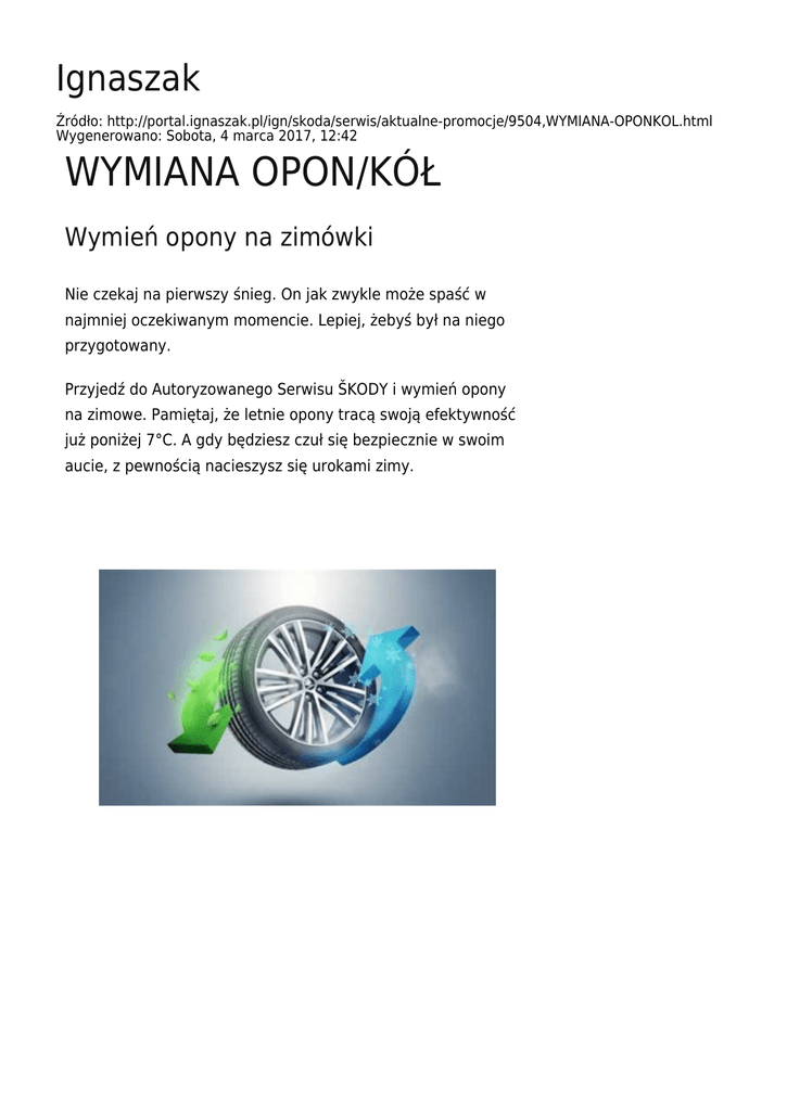 Ignaszak Źródło: http://portal.ignaszak.pl/ign/skoda/serwis/aktualne-promocje/9504,WYMIANA-OPONKOL.html Wygenerowano: Sobota, 4 marca 2017, 12:42 WYMIANA OPON/KÓŁ Wymień opony na zimówki Nie czekaj na pierwszy śnieg. On jak zwykle może spaść w najmniej oczekiwanym momencie. Lepiej, żebyś był na niego przygotowany. Przyjedź do Autoryzowanego Serwisu ŠKODY i wymień opony na zimowe. Pamiętaj, że letnie opony tracą swoją efektywność już poniżej 7°C. A gdy będziesz czuł się bezpiecznie w swoim aucie, z pewnością nacieszysz się urokami zimy.