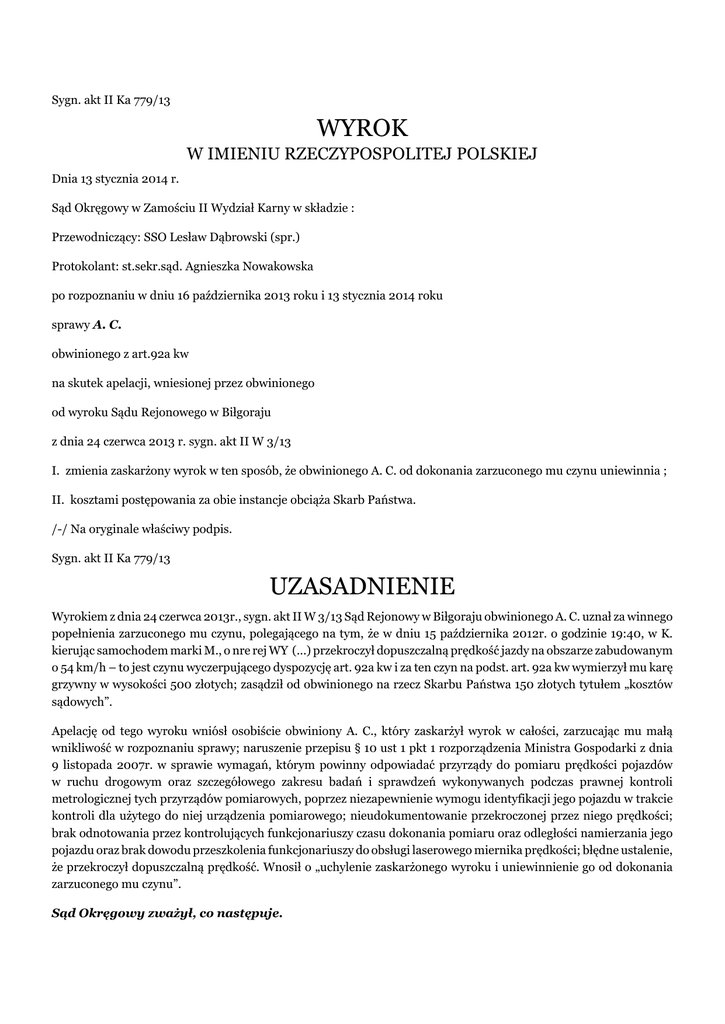 Sygn. akt II Ka 779/13 WYROK W IMIENIU RZECZYPOSPOLITEJ POLSKIEJ Dnia 13 stycznia 2014 r. Sąd Okręgowy w Zamościu II Wydział Karny w składzie : Przewodniczący: SSO Lesław Dąbrowski (spr.) Protokolant: st.sekr.sąd. Agnieszka Nowakowska po rozpoznaniu w dniu 16 października 2013 roku i 13 stycznia 2014 roku sprawy A. C. obwinionego z art.92a kw na skutek apelacji, wniesionej przez obwinionego od wyroku Sądu Rejonowego w Biłgoraju z dnia 24 czerwca 2013 r. sygn. akt II W 3/13 I. zmienia zaskarżony wyrok w ten sposób, że obwinionego A. C. od dokonania zarzuconego mu czynu uniewinnia ; II. kosztami postępowania za obie instancje obciąża Skarb Państwa. /-/ Na oryginale właściwy podpis. Sygn. akt II Ka 779/13 UZASADNIENIE Wyrokiem z dnia 24 czerwca 2013r., sygn. akt II W 3/13 Sąd Rejonowy w Biłgoraju obwinionego A. C. uznał za winnego popełnienia zarzuconego mu czynu, polegającego na tym, że w dniu 15 października 2012r. o godzinie 19:40, w K. kierując samochodem marki M., o nre rej WY (...) przekroczył dopuszczalną prędkość jazdy na obszarze zabudowanym o 54 km/h – to jest czynu wyczerpującego dyspozycję art. 92a kw i za ten czyn na podst. art. 92a kw wymierzył mu karę grzywny w wysokości 500 złotych; zasądził od obwinionego na rzecz Skarbu Państwa 150 złotych tytułem „kosztów sądowych”. Apelację od tego wyroku wniósł osobiście obwiniony A. C., który zaskarżył wyrok w całości, zarzucając mu małą wnikliwość w rozpoznaniu sprawy; naruszenie przepisu § 10 ust 1 pkt 1 rozporządzenia Ministra Gospodarki z dnia 9 listopada 2007r. w sprawie wymagań, którym powinny odpowiadać przyrządy do pomiaru prędkości pojazdów w ruchu drogowym oraz szczegółowego zakresu badań i sprawdzeń wykonywanych podczas prawnej kontroli metrologicznej tych przyrządów pomiarowych, poprzez niezapewnienie wymogu identyfikacji jego pojazdu w trakcie kontroli dla użytego do niej urządzenia pomiarowego; nieudokumentowanie przekroczonej przez niego prędkości; brak odnotowania przez kontrolujących funkcjonariuszy czasu dokonania pomiaru oraz odległości namierzania jego pojazdu oraz brak dowodu przeszkolenia funkcjonariuszy do obsługi laserowego miernika prędkości; błędne ustalenie, że przekroczył dopuszczalną prędkość. Wnosił o „uchylenie zaskarżonego wyroku i uniewinnienie go od dokonania zarzuconego mu czynu”. Sąd Okręgowy zważył, co następuje. Apelacja obwinionego oraz jej wniosek są zasadne. Uzupełniony przez Sąd Okręgowy w postępowaniu odwoławczym materiał dowodowy o opinię biegłego z zakresu technologii pomiaru prędkości pojazdów J. T. potwierdził zarzut dokonania błędnych ustaleń faktycznych odnośnie do rzeczywistego przekroczenia przez obwinionego dopuszczalnej administracyjnie w terenie zabudowanym prędkości. Owo ustalenie należy uznawać za błędne wobec podważenia przez biegłego J. T. poprawności dokonania pomiaru prędkości. Mianowicie, biegły ten podważył przekonanie (a tym samym i oparte na nim ustalenia), zeznających w sprawie w charakterze świadków funkcjonariuszy Policji dokonujących czynności kontrolno pomiarowych w osobach B. K. i A. P. co do tego, że dysponując laserowym miernikiem prędkości ULTRALYTE LTI 20-20 100 LR byli w stanie dokonywać precyzyjnych pomiarów prędkości poszczególnych pojazdów, a to dzięki optycznemu celownikowi umożliwiającemu wybór dowolnego celu na drodze, niezależnie od liczby pojazdów oraz pasów ruchu (zob. fabryczna instrukcja obsługi laserowego miernika prędkości k. 56 – 58). Otóż, jak wynika z rzeczonej opinii, punkt celowniczy widoczny w wizjerze przyrządu ULTRALYTE LTI 20-20 w rzeczywistości nie jest wcale obrazem promienia lasera (które pozostaje w zakresie światła podczerwonego niewidocznego dla ludzkiego oka), lecz symulowanym punktem celowniczym, który jest tworzony w wizjerze przyrządu i może w zasadniczy sposób odbiegać od rzeczywistego miejsca padania wiązki pomiarowej. W szczególności, rozmiar punktu celowniczego nie odzwierciedla rzeczywistego rozmiaru wiązki pomiarowej. Światło laserowe używane przez przyrząd ma duże skupienie, nie mniej jednak wraz z odległością od przyrządu wiązka światła ulega tzw. dywergencji (rozbieżności), która dla tego przyrządu wynosi nie więcej, jak 2,07 miliradiana. Powyższe oznacza, że w odległości 500 metrów od przyrządu wiązka pomiarowa ma średnicę co najmniej jednego metra. Tak więc w zależności od odległości namierzanego pojazdu punkt celowniczy ukazywany w wizjerze może być większy niż rzeczywisty rozmiar wiązki, co określa zależność, że dla celów bliskich jest większy, zaś dla celów dalekich mniejszy. Z § 18 ust.1 pkt 1 Rozporządzenia Ministra Gospodarki z dnia 9 listopada 2007 r. w sprawie wymagań, którym powinny odpowiadać przyrządy do pomiaru prędkości pojazdów w ruchu drogowym oraz szczegółowego zakresu badań i sprawdzeń wykonywanych podczas prawnej kontroli metrologicznej tych przyrządów pomiarowych wynika, że przyrząd laserowy powinien być wyposażony w urządzenie celownicze z wizjerem, umożliwiające zachowanie zbieżności osi optycznej celownika (promienia wizjera) z wiązką promieniowania lasera. Ze względu na to, że promieniowanie laserowe jest generowane w oddzielnym względem wizjera układzie optycznym, który znajduje się poniżej celownika, to możliwe jest zapewnienie , że punkt celowniczy nie będzie przesunięty względem pomiarowej wiązki laserowej tylko w poziomie, natomiast nie jest możliwe zapewnienie takiej zbieżności w pionie, co oznacza, że wszystkie cele, które będą bliższe niż odległość punktu zbieżności w rzeczywistości będą przesunięte niżej niż punkt pokazywany przez celownik, zaś cele dalsze będą przesunięte wyżej, a wielkość tego przesunięcia będzie zależała od odległości celu od punktu zbieżności. Zbieżność celownika jes