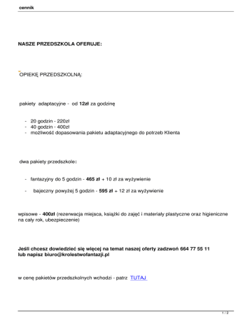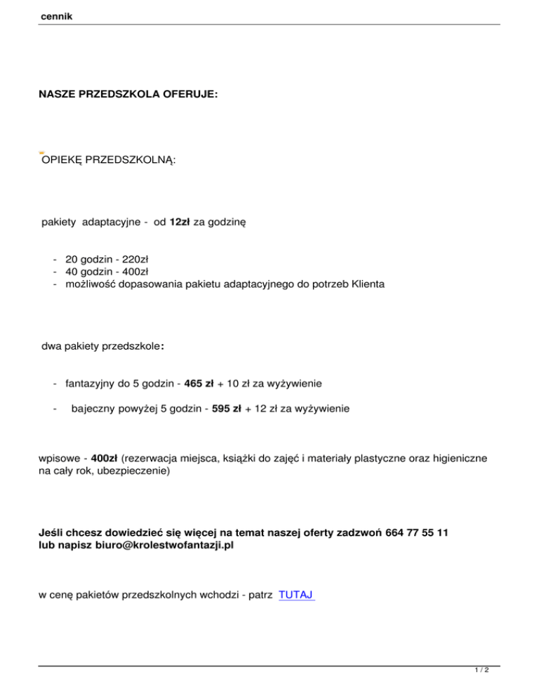 cennik NASZE PRZEDSZKOLA OFERUJE: OPIEKĘ PRZEDSZKOLNĄ: pakiety adaptacyjne - od 12zł za godzinę - 20 godzin - 220zł - 40 godzin - 400zł - możliwość dopasowania pakietu adaptacyjnego do potrzeb Klienta dwa pakiety przedszkole: - fantazyjny do 5 godzin - 465 zł + 10 zł za wyżywienie - bajeczny powyżej 5 godzin - 595 zł + 12 zł za wyżywienie wpisowe - 400zł (rezerwacja miejsca, książki do zajęć i materiały plastyczne oraz higieniczne na cały rok, ubezpieczenie) Jeśli chcesz dowiedzieć się więcej na temat naszej oferty zadzwoń 664 77 55 11 lub napisz [email protected] w cenę pakietów przedszkolnych wchodzi - patrz TUTAJ 1/2 cennik WYŻYWIENIE - śniadania, obiady, podwieczorek, owocowe przekąski między posiłkami OFERTĘ Urodzinki dziec i -- Koszt urodzin zależny od dzieci oferty spoza Logopeda 20zł-DODATKOWĄ; -dla dlapół posiadaczy pakietów przedszkolnych 30zł za godziny, dla przedszkola 2/2