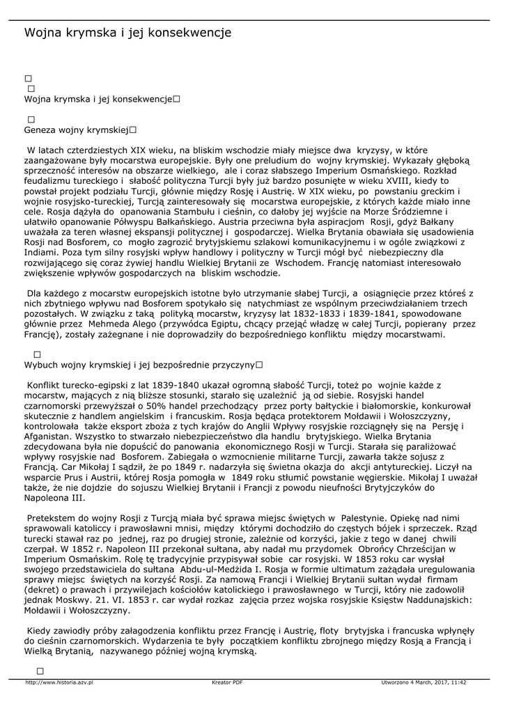Wojna krymska i jej konsekwencje Wojna krymska i jej konsekwencje Geneza wojny krymskiej W latach czterdziestych XIX wieku, na bliskim wschodzie miały miejsce dwa kryzysy, w które zaangażowane były mocarstwa europejskie. Były one preludium do wojny krymskiej. Wykazały głęboką sprzeczność interesów na obszarze wielkiego, ale i coraz słabszego Imperium Osmańskiego. Rozkład feudalizmu tureckiego i słabość polityczna Turcji były już bardzo posunięte w wieku XVIII, kiedy to powstał projekt podziału Turcji, głównie między Rosję i Austrię. W XIX wieku, po powstaniu greckim i wojnie rosyjsko-tureckiej, Turcją zainteresowały się mocarstwa europejskie, z których każde miało inne cele. Rosja dążyła do opanowania Stambułu i cieśnin, co dałoby jej wyjście na Morze Śródziemne i ułatwiło opanowanie Półwyspu Bałkańskiego. Austria przeciwna była aspiracjom Rosji, gdyż Bałkany uważała za teren własnej ekspansji politycznej i gospodarczej. Wielka Brytania obawiała się usadowienia Rosji nad Bosforem, co mogło zagrozić brytyjskiemu szlakowi komunikacyjnemu i w ogóle związkowi z Indiami. Poza tym silny rosyjski wpływ handlowy i polityczny w Turcji mógł być niebezpieczny dla rozwijającego się coraz żywiej handlu Wielkiej Brytanii ze Wschodem. Francję natomiast interesowało zwiększenie wpływów gospodarczych na bliskim wschodzie. Dla każdego z mocarstw europejskich istotne było utrzymanie słabej Turcji, a osiągnięcie przez któreś z nich zbytniego wpływu nad Bosforem spotykało się natychmiast ze wspólnym przeciwdziałaniem trzech pozostałych. W związku z taką polityką mocarstw, kryzysy lat 1832-1833 i 1839-1841, spowodowane głównie przez Mehmeda Alego (przywódca Egiptu, chcący przejąć władzę w całej Turcji, popierany przez Francję), zostały zażegnane i nie doprowadziły do bezpośredniego konfliktu między mocarstwami. Wybuch wojny krymskiej i jej bezpośrednie przyczyny Konflikt turecko-egipski z lat 1839-1840 ukazał ogromną słabość Turcji, toteż po wojnie każde z mocarstw, mających z nią bliższe stosunki, starało się uzależnić ją od siebie. Rosyjski handel czarnomorski przewyższał o 50% handel przechodzący przez porty bałtyckie i białomorskie, konkurował skutecznie z handlem angielskim i francuskim. Rosja będąca protektorem Mołdawii i Wołoszczyzny, kontrolowała także eksport zboża z tych krajów do Anglii Wpływy rosyjskie rozciągnęły się na Persję i Afganistan. Wszystko to stwarzało niebezpieczeństwo dla handlu brytyjskiego. Wielka Brytania zdecydowana była nie dopuścić do panowania ekonomicznego Rosji w Turcji. Starała się paraliżować wpływy rosyjskie nad Bosforem. Zabiegała o wzmocnienie militarne Turcji, zawarła także sojusz z Francją. Car Mikołaj I sądził, że po 1849 r. nadarzyła się świetna okazja do akcji antytureckiej. Liczył na wsparcie Prus i Austrii, której Rosja pomogła w 1849 roku stłumić powstanie węgierskie. Mikołaj I uważał także, że nie dojdzie do sojuszu Wielkiej Brytanii i Francji z powodu nieufności Brytyjczyków do Napoleona III. Pretekstem do wojny Rosji z Turcją miała być sprawa miejsc świętych w Palestynie. Opiekę nad nimi sprawowali katoliccy i prawosławni mnisi, między którymi dochodziło do częstych bójek i sprzeczek. Rząd turecki stawał raz po jednej, raz po drugiej stronie, zależnie od korzyści, jakie z tego w danej chwili czerpał. W 1852 r. Napoleon III przekonał sułtana, aby nadał mu przydomek Obrońcy Chrześcijan w Imperium Osmańskim. Rolę tę tradycyjnie przypisywał sobie car rosyjski. W 1853 roku car wysłał swojego przedstawiciela do sułtana Abdu-ul-Medżida I. Rosja w formie ultimatum zażądała uregulowania sprawy miejsc świętych na korzyść Rosji. Za namową Francji i Wielkiej Brytanii sułtan wydał firmam (dekret) o prawach i przywilejach kościołów katolickiego i prawosławnego w Turcji, który nie zadowolił jednak Moskwy. 21. VI. 1853 r. car wydał rozkaz zajęcia przez wojska rosyjskie Księstw Naddunajskich: Mołdawii i Wołoszczyzny. Kiedy zawiodły próby załagodzenia konfliktu przez Francję i Austrię, floty brytyjska i francuska wpłynęły do cieśnin czarnomorskich. Wydarzenia te były początkiem konfliktu zbrojnego między Rosją a Francją i Wielką Brytanią, nazywanego później wojną krymską. http://www.historia.azv.pl Kreator PDF Utworzono 4 March, 2017, 11:42 Wojna krymska - przebieg działań wojennych Car przekonał się, że Wielka Brytania i Francja zdołały uzgodnić swą politykę wobec Turcji. Obawa przed ekspansja rosyjską na Bliskim Wschodzie okazała się silniejsza od wzajemnych animozji. Wkrótce Mikołaj I przekonał się, że Austria też nie będzie go wspierać. Formalnie zachowała neutralność, ale na płaszczyźnie dyplomatycznej blisko współdziałała z przeciwnikami Rosji. Turcja zachęcona postawą Wielkiej Brytanii w 1853 roku wypowiedziała Rosji wojnę. W tym samym roku pod Synopą wiceadmirał floty rosyjskiej, Paweł Nachimow, pokonał flotę turecką. W 1854 r. flota brytyjska i francuska wpłynęły na Morze Czarne, a od Rosji zażądano ewakuacji wojsk z Księstw Naddunajskich. W odpowiedzi Mikołaj I wypowiedział wojnę Francji i Wielkiej Brytanii. Rząd austriacki zażądał wycofania wojsk rosyjskich z Mołdawii i Wołoszczyzny, wskazując na możliwość podjęcia akcji zbrojnej. W 1854 roku Rosja wycofała się z Księstw Naddunajskich, gdyż Austria wysłała swe wojska do Siedmiogrodu, w pobliże granic Mołdawii i Wołoszczyzny. Kolejnym etapem wojny krymskiej było wysadzenie korpusu sprzymierzonych na Krymie we wrześniu 1854 roku. Wcześniej Rosja nie zgodziła się na opracowany przez Napoleona III plan 4 punktów, który przewidywał wspólną kontrolę mocarstw nad Turcją i Księstwami Naddunajskimi. Pod koniec 1854 roku Austria przestała być neutralna i zobowiązała się bronić Mołdawii i Wołoszczyz