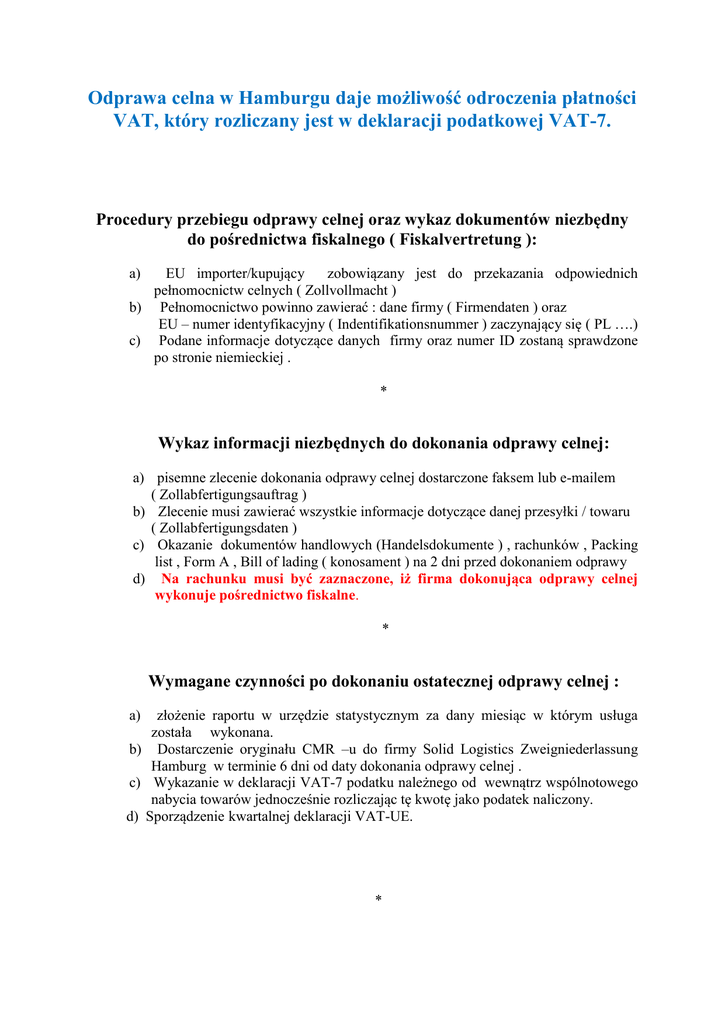 Odprawa celna w Hamburgu daje możliwość odroczenia płatności VAT, który rozliczany jest w deklaracji podatkowej VAT-7. Procedury przebiegu odprawy celnej oraz wykaz dokumentów niezbędny do pośrednictwa fiskalnego ( Fiskalvertretung ): EU importer/kupujący zobowiązany jest do przekazania odpowiednich pełnomocnictw celnych ( Zollvollmacht ) b) Pełnomocnictwo powinno zawierać : dane firmy ( Firmendaten ) oraz EU – numer identyfikacyjny ( Indentifikationsnummer ) zaczynający się ( PL ….) c) Podane informacje dotyczące danych firmy oraz numer ID zostaną sprawdzone po stronie niemieckiej . a) * Wykaz informacji niezbędnych do dokonania odprawy celnej: a) pisemne zlecenie dokonania odprawy celnej dostarczone faksem lub e-mailem ( Zollabfertigungsauftrag ) b) Zlecenie musi zawierać wszystkie informacje dotyczące danej przesyłki / towaru ( Zollabfertigungsdaten ) c) Okazanie dokumentów handlowych (Handelsdokumente ) , rachunków , Packing list , Form A , Bill of lading ( konosament ) na 2 dni przed dokonaniem odprawy d) Na rachunku musi być zaznaczone, iż firma dokonująca odprawy celnej wykonuje pośrednictwo fiskalne. * Wymagane czynności po dokonaniu ostatecznej odprawy celnej : złożenie raportu w urzędzie statystycznym za dany miesiąc w którym usługa została wykonana. b) Dostarczenie oryginału CMR –u do firmy Solid Logistics Zweigniederlassung Hamburg w terminie 6 dni od daty dokonania odprawy celnej . c) Wykazanie w deklaracji VAT-7 podatku należnego od wewnątrz wspólnotowego nabycia towarów jednocześnie rozliczając tę kwotę jako podatek naliczony. d) Sporządzenie kwartalnej deklaracji VAT-UE. a) * Korzyści wynikające z przedstawicielstwa fiskalnego: Importowa odprawa celna na granicy strefy wolnocłowego portu i bezpośredniej dostawy przesyłki do importera (odbiorcy) z siedzibą w UE – przedstawicielstwo fiskalne – (Fiskalvertretung ) pozwala na następujące korzyści : a) zredukowanie podatku VAT do stawki 0 % w Niemczech, b) rozliczenie podatku VAT w Polsce bez konieczności angażowania środków pieniężnych - poprzez wykazanie podatku w deklaracji VAT-7( tak jak opiano to w punkcie c) i d) "Wymaganych czynności po dokonaniu ostatecznej odprawy celnej"), c) uniknięcie oczekiwania na zwrot podatku VAT, d) wyeliminowanie kosztów związanych z wystawieniem dokumentu T1, e) szybka odprawa celna towaru w Hamburgu dzięki jednolitemu systemowi celnemu Atlas ( podporządkowanemu normą oprogramowania i przepływu danych na terenie całej UE ), f) uniknięcie odprawy celnej w kraju dostawy towaru, g) skrócenie czasu postoju i oczekiwania towarów w urzędzie celnym, h) bezpośrednia możliwość zadysponowania towarem , po jego odprawie . WAŻNE : Przedstawicielstwo fiskalne może funkcjonować tylko wówczas , gdy EU – importer nie ma w Niemczech ŻADNEGO numeru w urzędzie podatkowym (Steuernummer) . EU – Importer mający przedstawicielstwo w Niemczech nie może w kraju odprawy wykonywać żadnych obrotów towar / przesyłka musi zostać BEZPOŚREDNIO po odprawie celnej dostarczona do innego kraju EU . Towar po odprawie nie może zostać w Niemczech . Fragment SZÓSTEJ DYREKTYWY RADY z dnia 17 maja 1977 r. w sprawie harmonizacji ustawodawstw Państw Członkowskich w odniesieniu do podatków obrotowych - wspólny system podatku od wartości dodanej: ujednolicona podstawa wymiaru podatku Artykuł 23 Zobowiązania przy przywozie W odniesieniu do towarów przywożonych, Państwa Członkowskie określają szczegółowe zasady dotyczące sporządzania deklaracji podatkowych i płatności. W szczególności, Państwa Członkowskie mogą przewidzieć, że podatek od wartości dodanej płatny przy przywozie towarów przez podatników lub osoby zobowiązane do zapłaty podatku lub określonych ich kategorii, nie musi być zapłacony w momencie przywozu, pod warunkiem, że podatek ten jest wyszczególniony w deklaracji podatkowej, która ma być złożona zgodnie z art. 22 ust. 4. Podstawowa ustawa : Ustawa o podatku od towarów i usług z dnia 11 marca 2004 Dz.U. z 2004r. Nr 54, poz. 535 stan prawny na dzień 7 grudnia 2004 roku Rozdział 3 "Wewnątrzwspólnotowe nabycie towarów i wewnątrzwspólnotowa dostawa towarów", art.10 i 11 ustawy http://www.polskieustawy.com/print.php?dzur=2004&dzup=535&lang=48&adate=2004 1207 Akt wykonawczy : Rozporządzenie Ministra Finansów z dnia 27.04.2004 r. w sprawie wykonania niektórych przepisów ustawy o podatku od towarów i usług (publikacja: Dz. U. z 2004 r. nr 97, poz. 970, nr 145, poz. 1541 i nr 224, poz. 2277) Rozdział 6 Zwolnienia od podatku oraz szczegółowe warunki stosowania tych zwolnień http://www.gofin.pl/wydruk.php?id_temat_html=43181